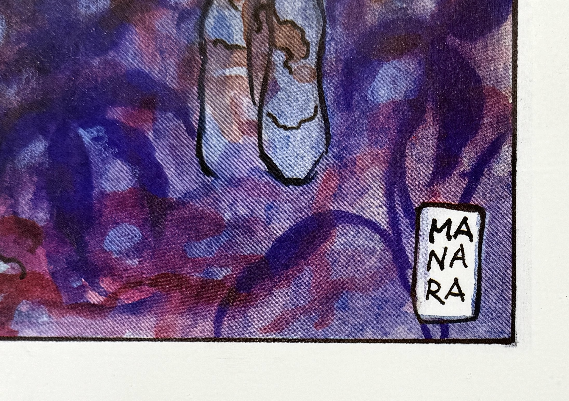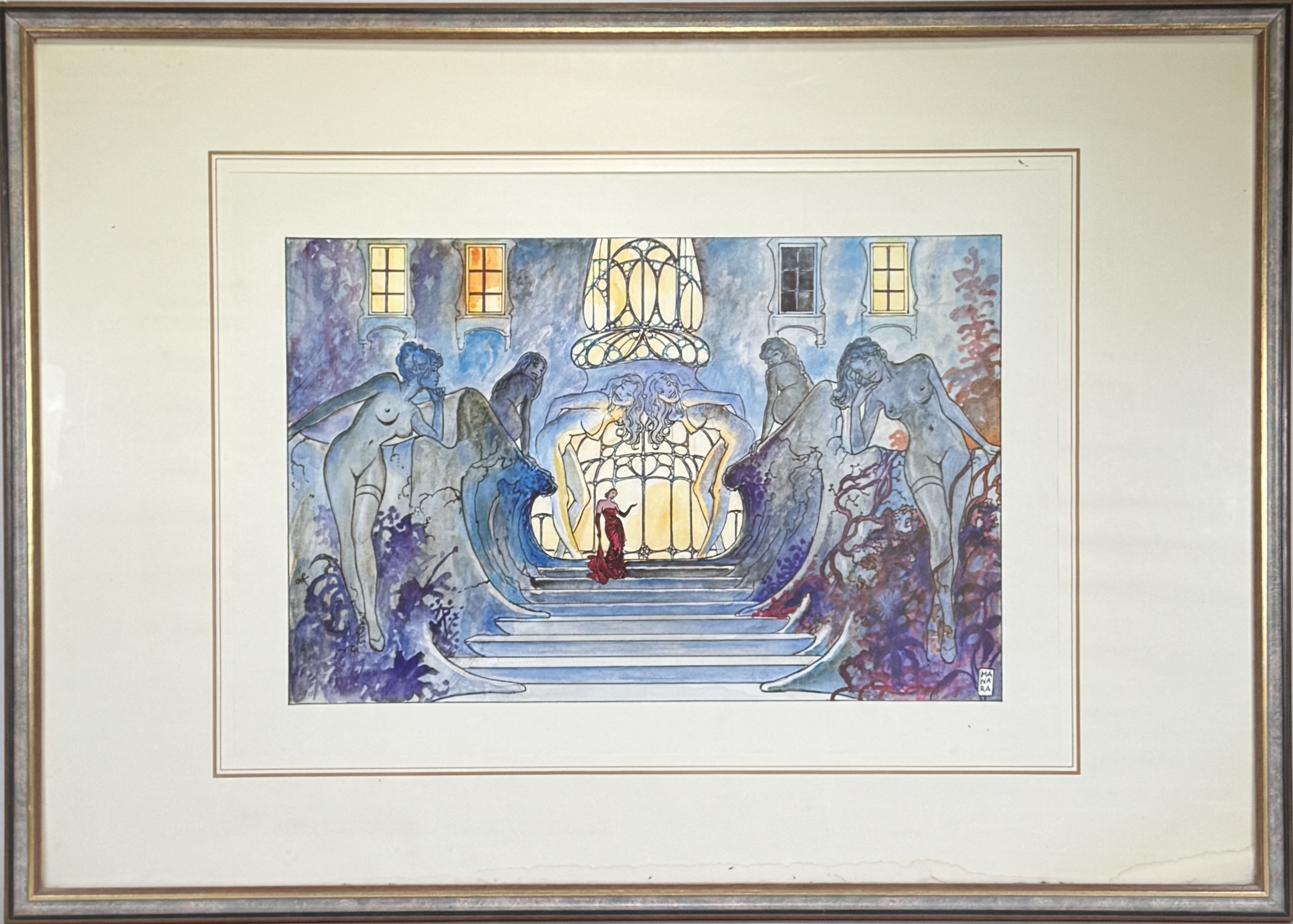 Zeefdruk van Milo Manara (geboren 1945), uitgevoerd op papier, in sensuele, fantasierijke stijl. Afgebeeld een vrouw in rode japon op trappen, geflankeerd door monumentale vrouwelijke naakten geïntegreerd in golven en architecturale vormen. Rechtsonder gesigneerd "Manara" in zwarte inkt, zonder zichtbare datering, met kenmerkende surrealistische en erotische beeldtaal. Wil je dit aquarel in het echt bekijken? Kom naar de kijkdagen op 29, 30 en 31 augustus! |