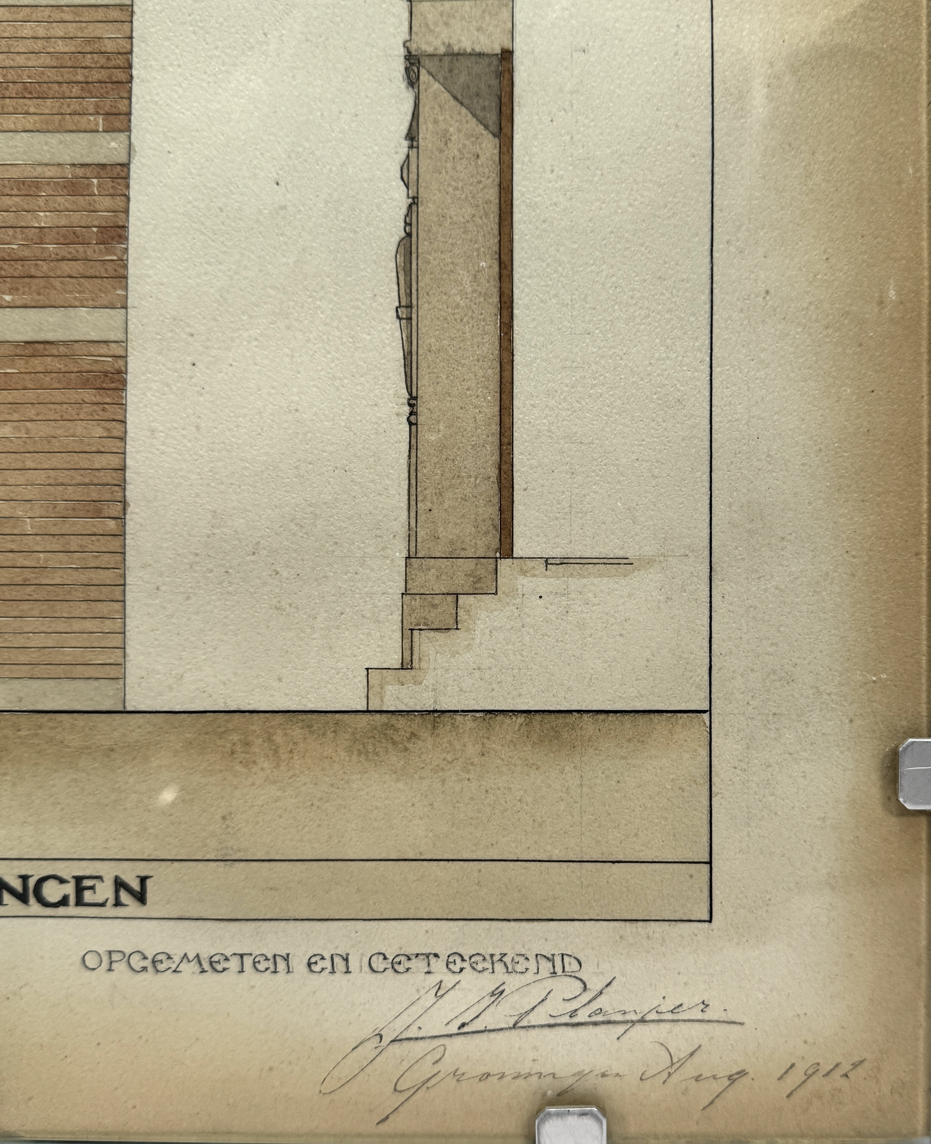 Architecturale aquarel uit augustus 1912, die de gevel van het voormalige Goudkantoor in Groningen voorstelt. Het werk is in inkt en aquarel op papier uitgevoerd, waarbij de stijl van de Nederlandse renaissance gedetailleerd is weergegeven. De tekening toont een vooraanzicht met een zijaanzicht van de gevel. Rechtsonder is het werk handgeschreven onduidelijk gesigneerd en gedateerd. Klaar om te bieden? Registreer je nu en doe mee aan de veiling! |
