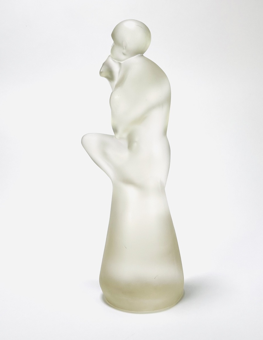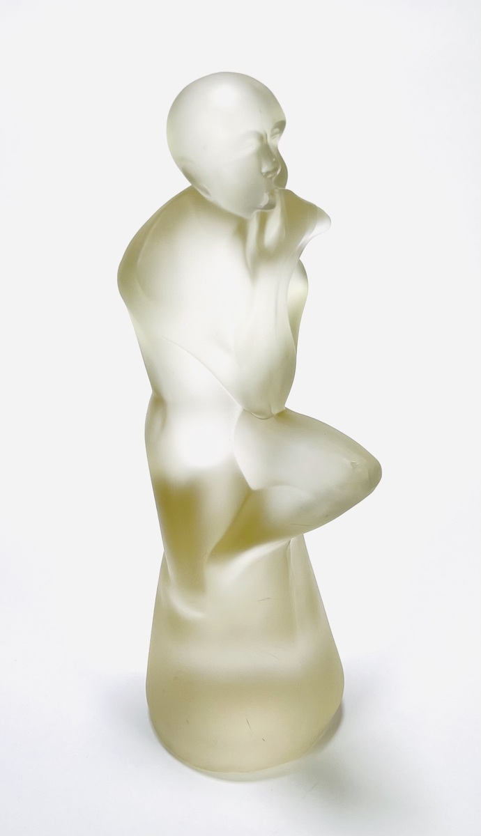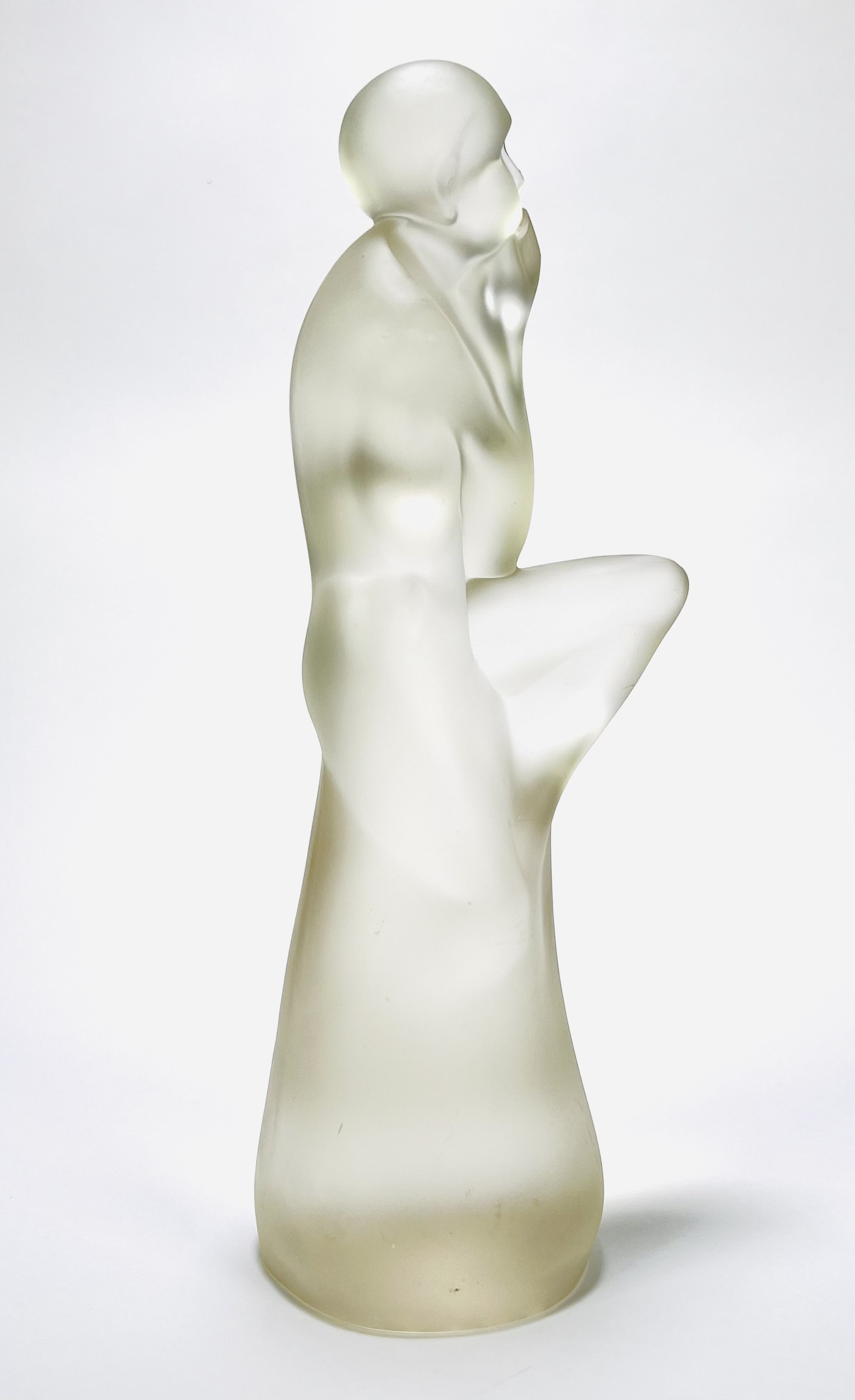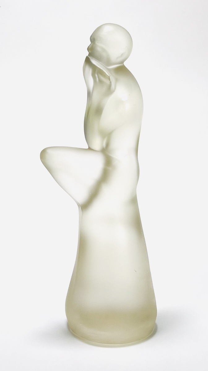 Art Deco beeld van een fluitspeelster uit circa 1932, ontwerp Stephanus Albertus (Stef) Uiterwaal (1889 –1960). Het beeld is uitgevoerd in geperst matglas met een lichtgele tint. De abstracte gestileerde vorm van een vrouwelijk figuur is kenmerkend voor de stijl. Het object is ongesigneerd, uitvoering Glasfabriek Leerdam, Wil je direct deelnemen? Plaats vanaf 22 augustus alvast een schriftelijk bod via onze website! |