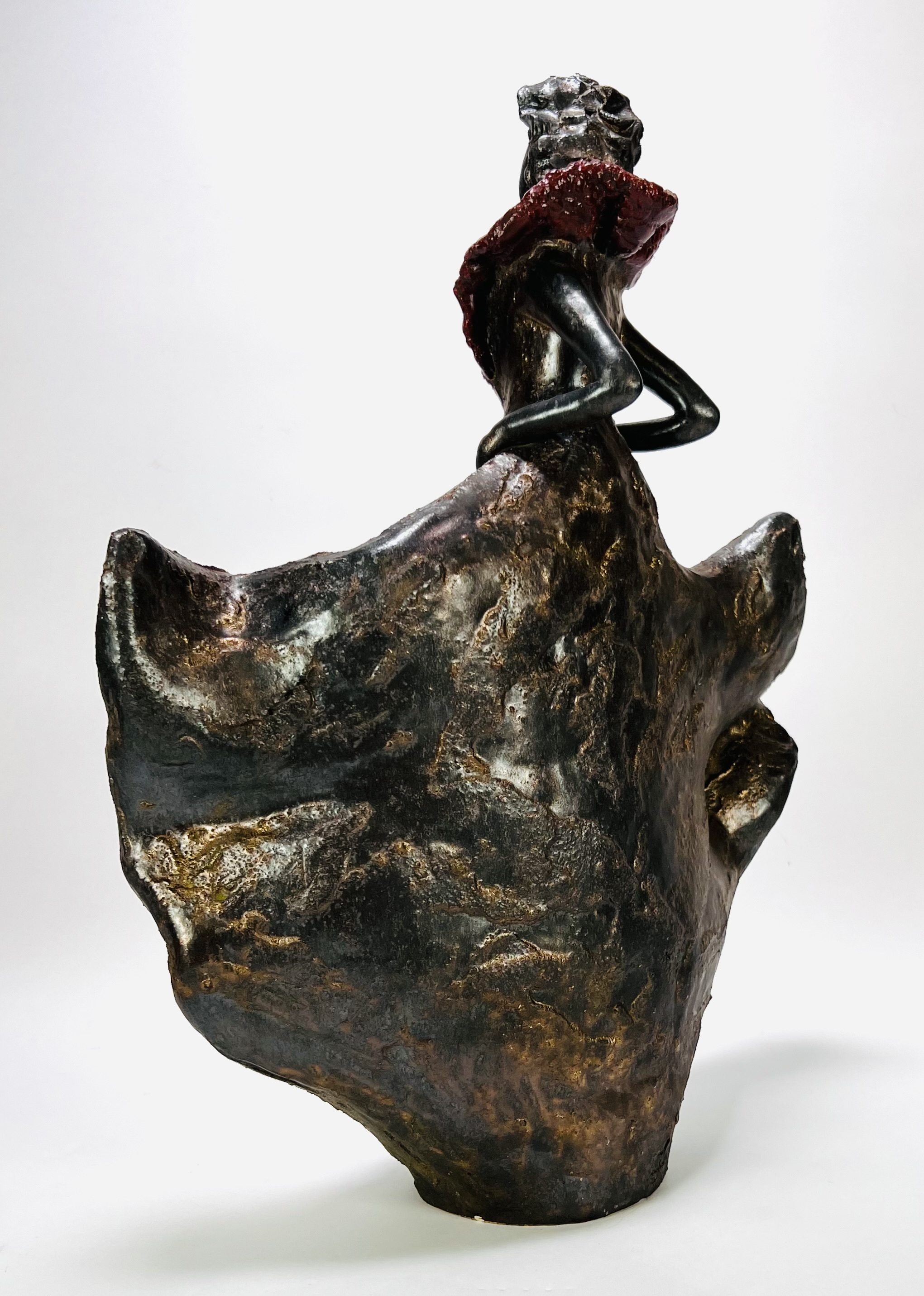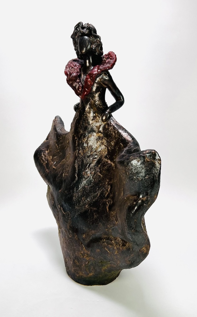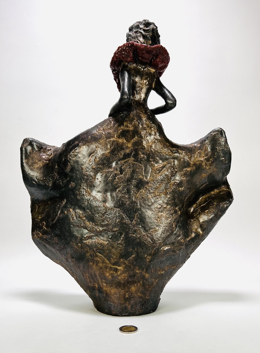 Keramieken beeld van een vrouwelijke figuur. gegoten met gepolijste en ruw bewerkte oppervlakken, donker patina en roodbruine accenten. De gestileerde houding en wijd uitlopende rok geven een moderne, expressieve uitstraling. Onderaan beeld gemonogrammeerd L, tweede helft 20e eeuw. Zeker zijn van deelname? Plaats vanaf 22 augustus een schriftelijk bod online! |