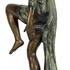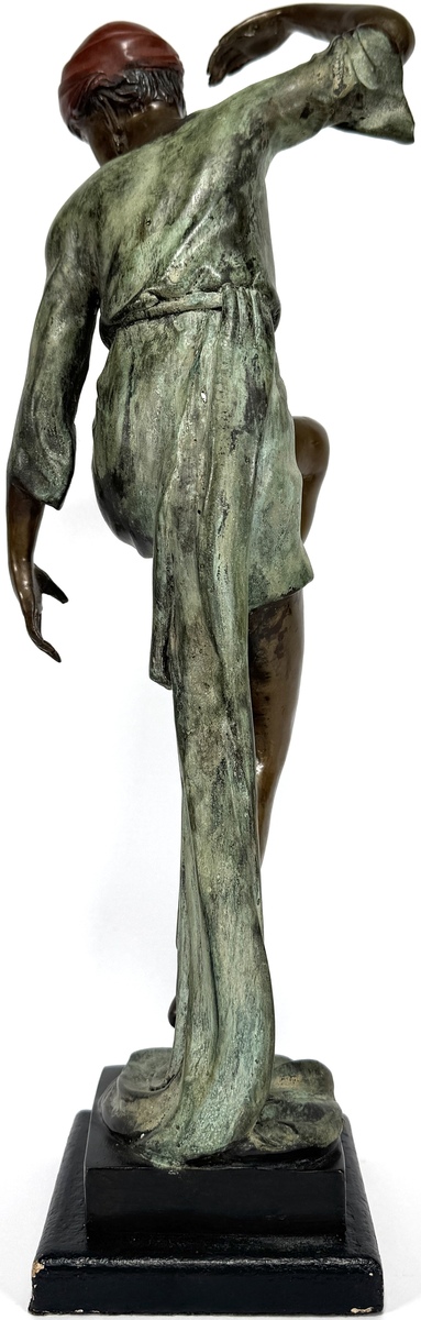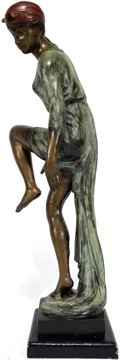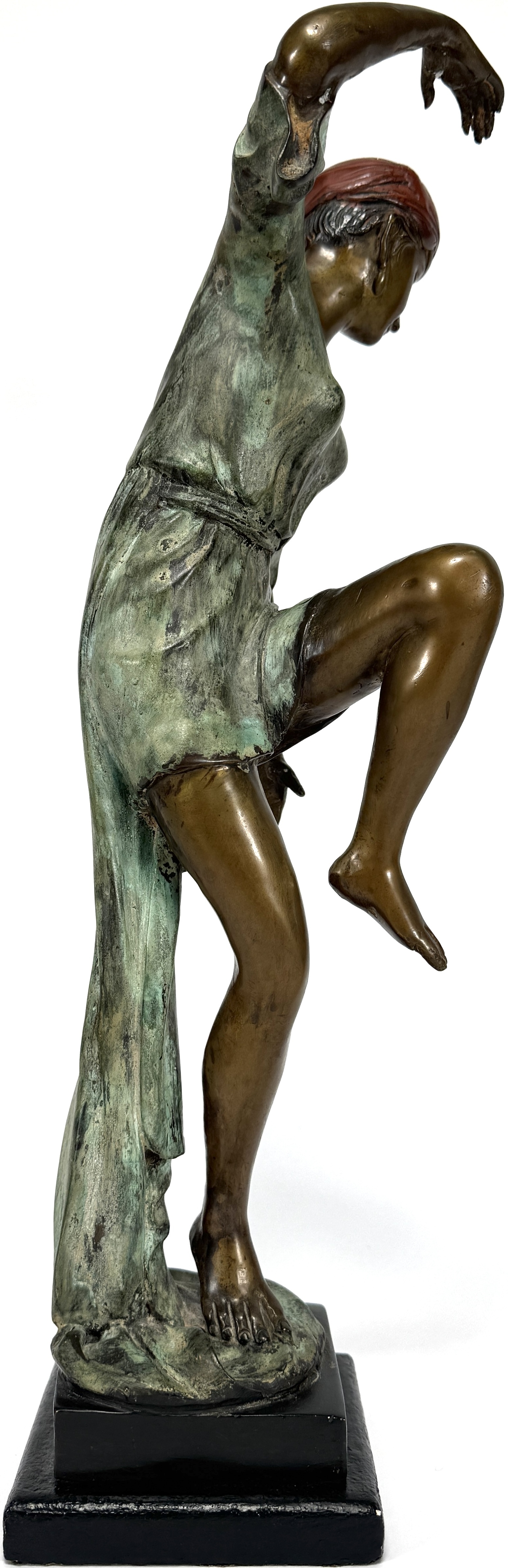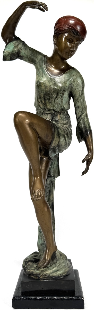 Beeld van een danseres in Art Deco stijl, gegoten spelter met tweekleurige patina en koude verf, op zwart gelakte houten sokkel. De daneres met rode hoofddoek staat in dynamische pose met opgetilde knie en gebogen arm, blote voeten en vallende tuniek met ceintuur. Europese productie, midden 20e eeuw, met realistische modellering en contrasterende oppervlakken. Zien voordat u biedt? Bezoek onze kijkdagen op 29, 30 en 31 augustus van 11:00 tot 17:00 uur! |