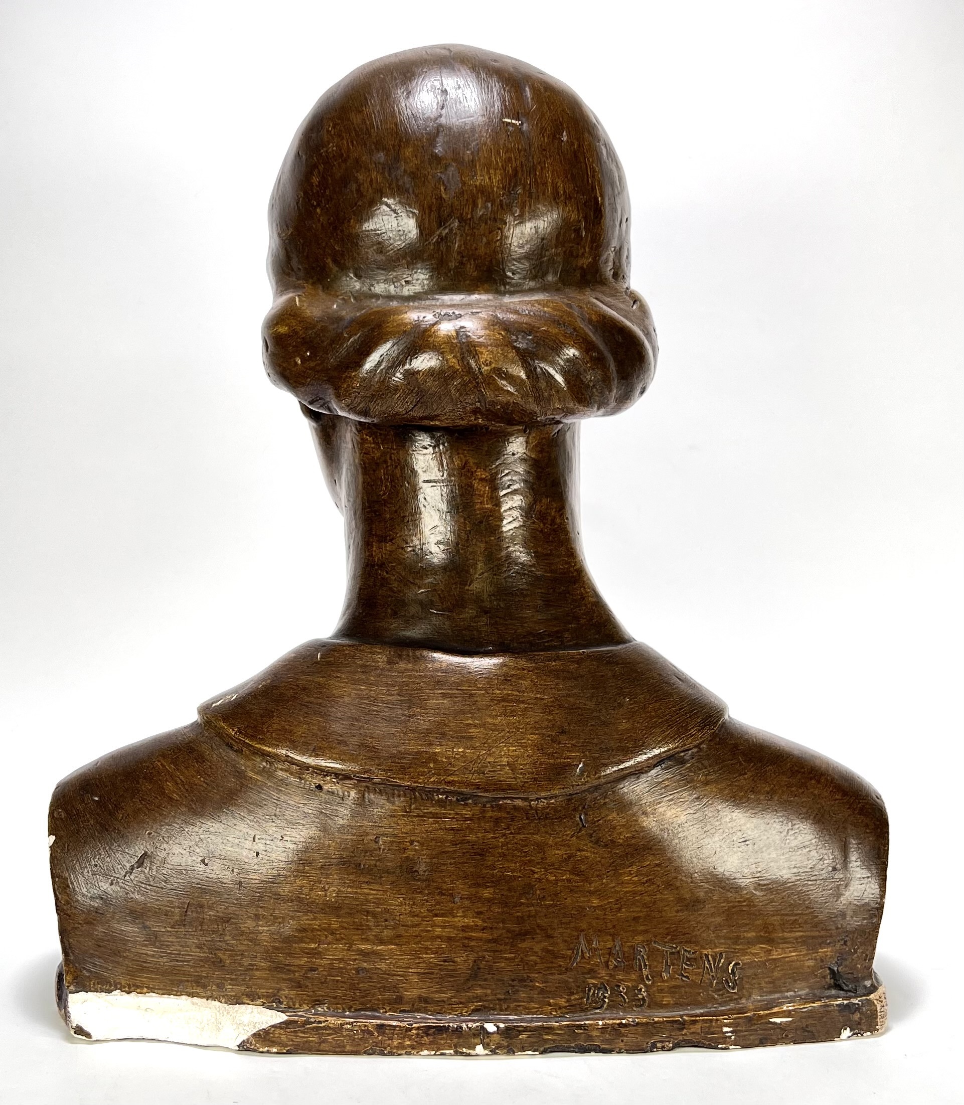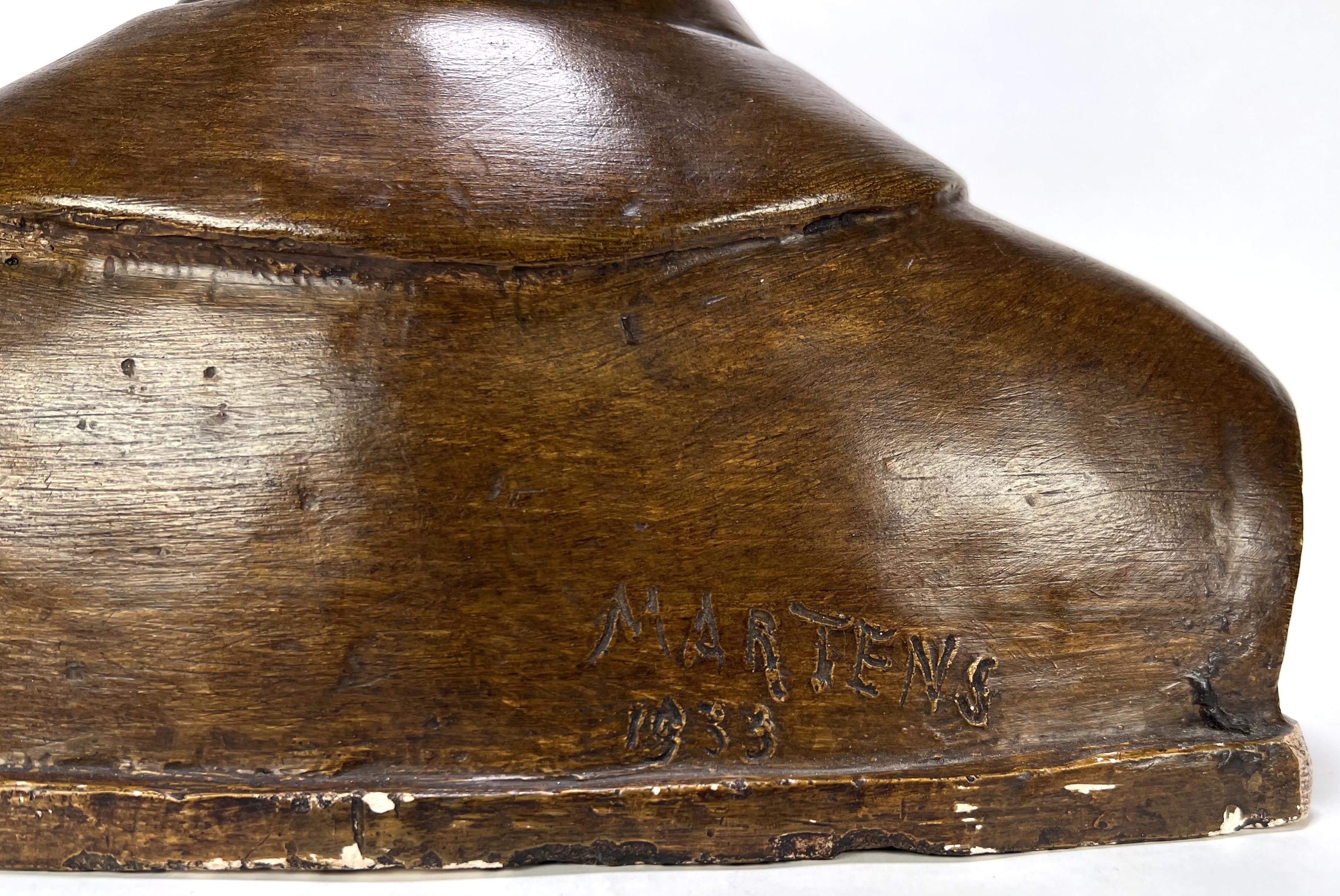 Buste van Gijsbert George Martens (1894–1979), gesigneerd en gedateerd achterzijde “MARTENS 1933”. Gips met bruin patina in realistisch-figuratieve stijl, voorstellend een jonge vrouw met lage knot en eenvoudige kraagpartij. Glad gemodelleerde vormen en zachte gelaatstrekken, typerend voor Martens’ portretkunst in het interbellum. Zeker zijn van deelname? Plaats vanaf 22 augustus een schriftelijk bod online! |