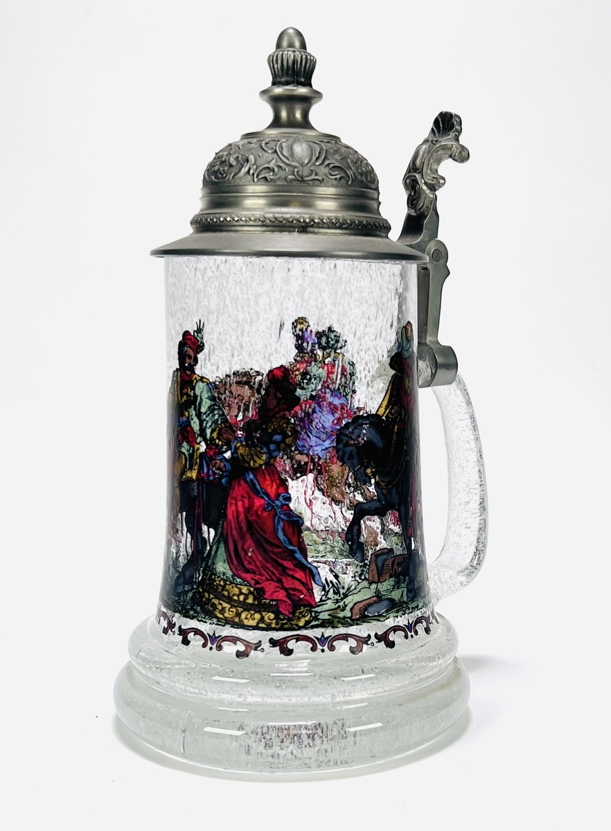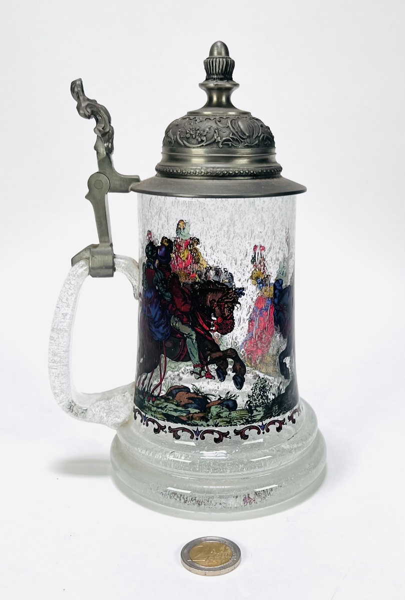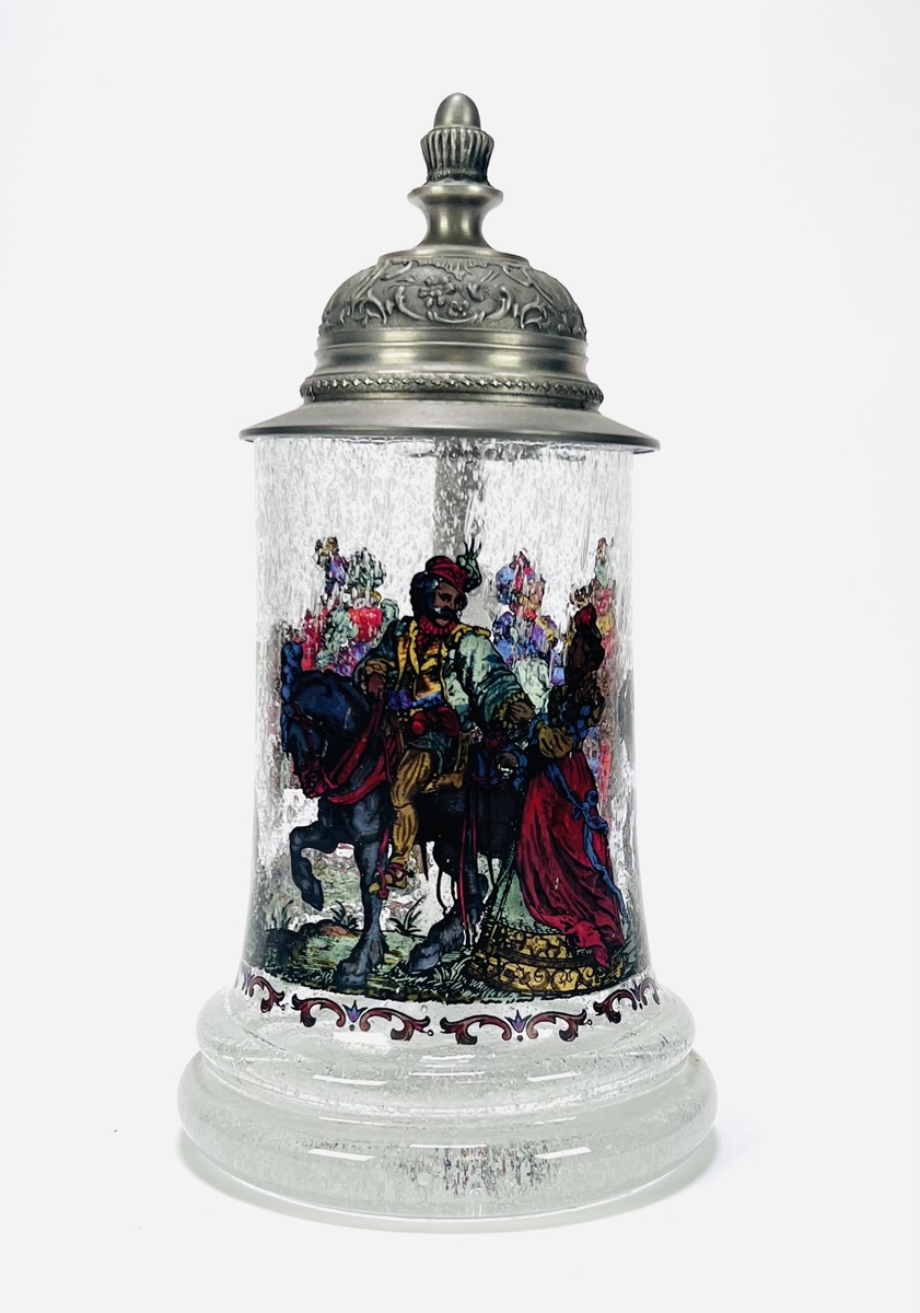 Bierpul uit midden 20e eeuw, vervaardigd uit helder glas met luchtinsluitingen en voorzien van een tinnen deksel met florale ornamentiek. De wand toont een doorlopende, polychrome voorstelling met figuren in renaissancekostuums, waaronder ruiters en hofdames. De duimrust is uitgevoerd in de vorm van een dierenkop. Geïnteresseerd? Bezoek onze kijkdagen op 29, 30 of 31 augustus van 11:00 tot 17:00 uur! |