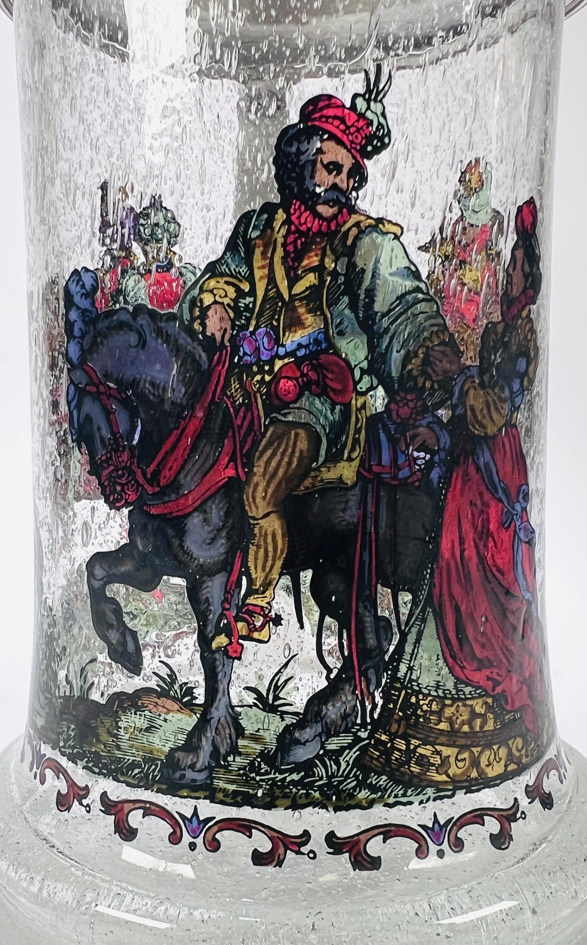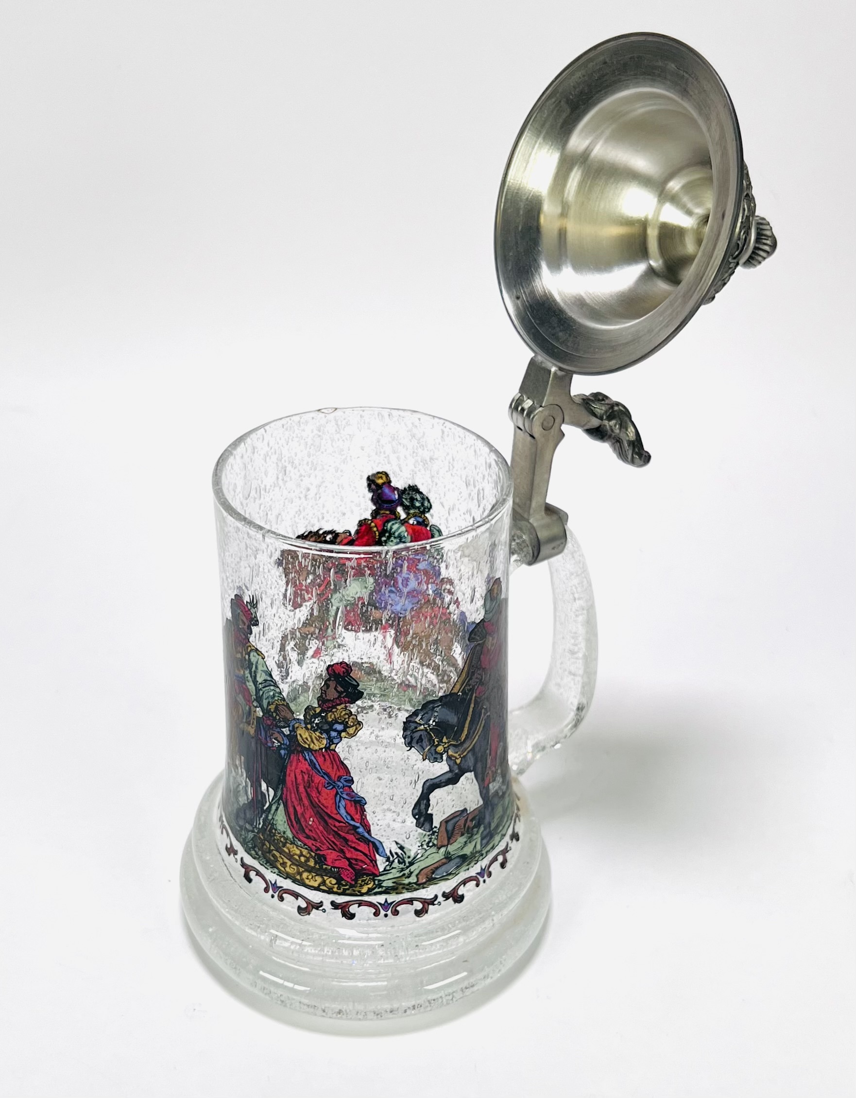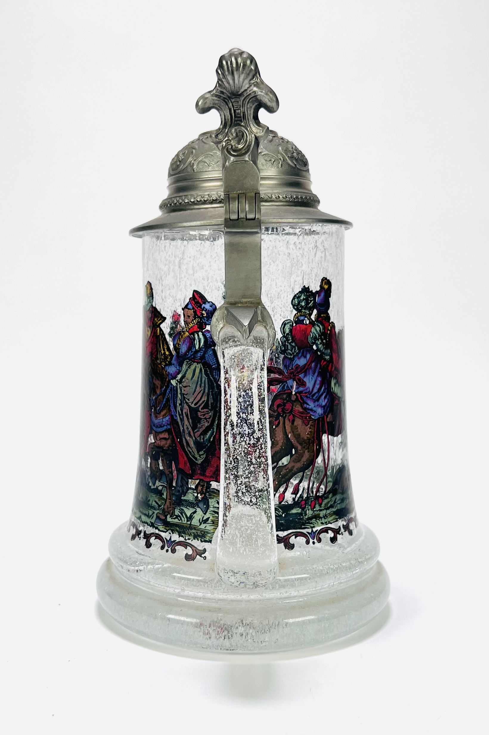 Bierpul uit midden 20e eeuw, vervaardigd uit helder glas met luchtinsluitingen en voorzien van een tinnen deksel met florale ornamentiek. De wand toont een doorlopende, polychrome voorstelling met figuren in renaissancekostuums, waaronder ruiters en hofdames. De duimrust is uitgevoerd in de vorm van een dierenkop. Geïnteresseerd? Bezoek onze kijkdagen op 29, 30 of 31 augustus van 11:00 tot 17:00 uur! |