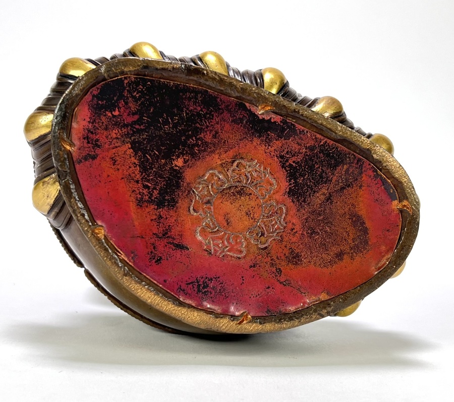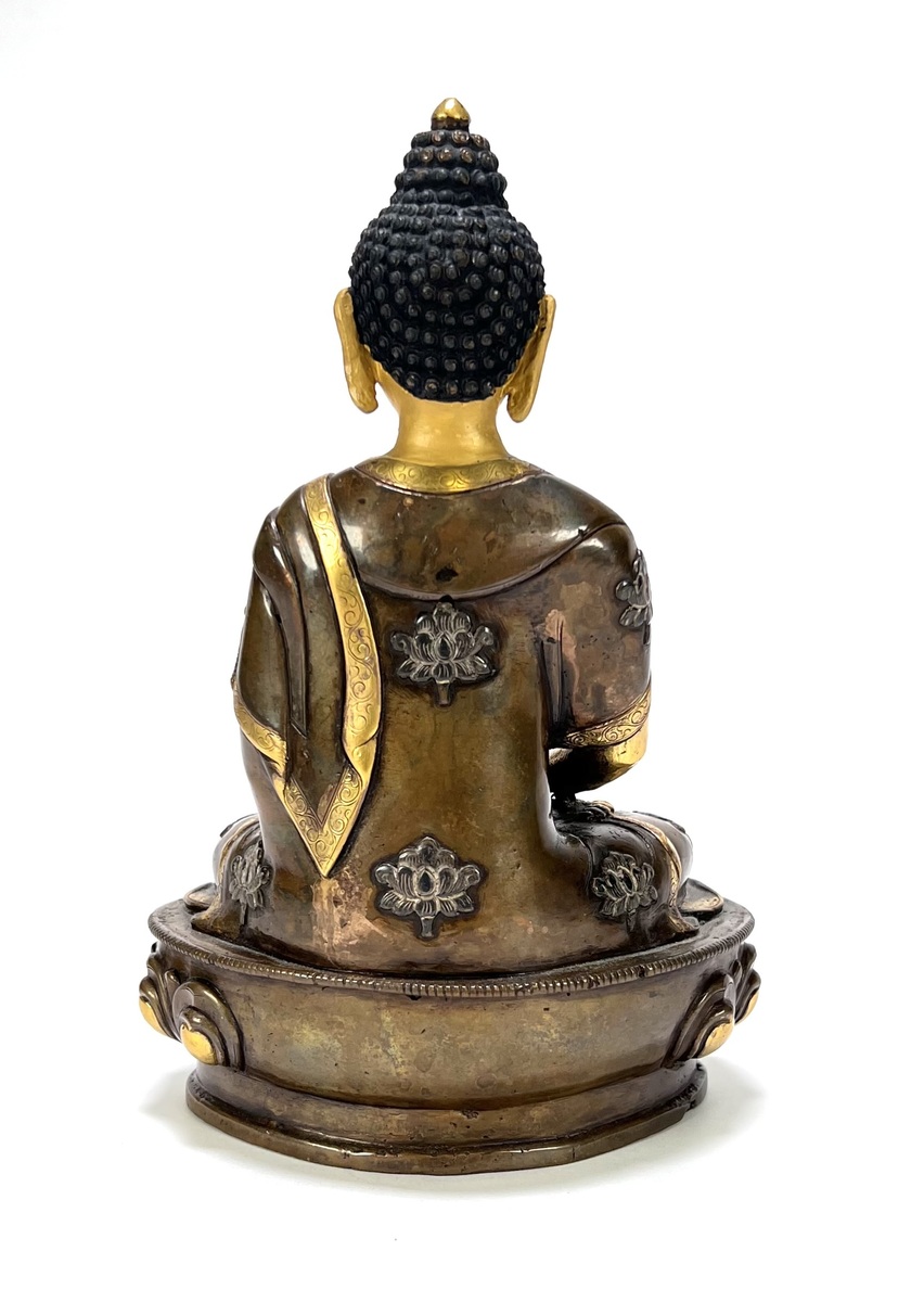 Zittende Boeddha in traditioneel Tibetaans-Boeddhistische stijl, uitgevoerd in verguld en gepatineerd brons, omstreeks eind 20e eeuw. De Boeddha is weergegeven in meditatiehouding op een rijkelijk gedecoreerde lotustroon. Met florale gravures in de gewaden en een gesloten onderzijde met rode lak en centraal mandalasymbool. Klaar om te bieden? Registreer je nu en doe mee aan de veiling! |
