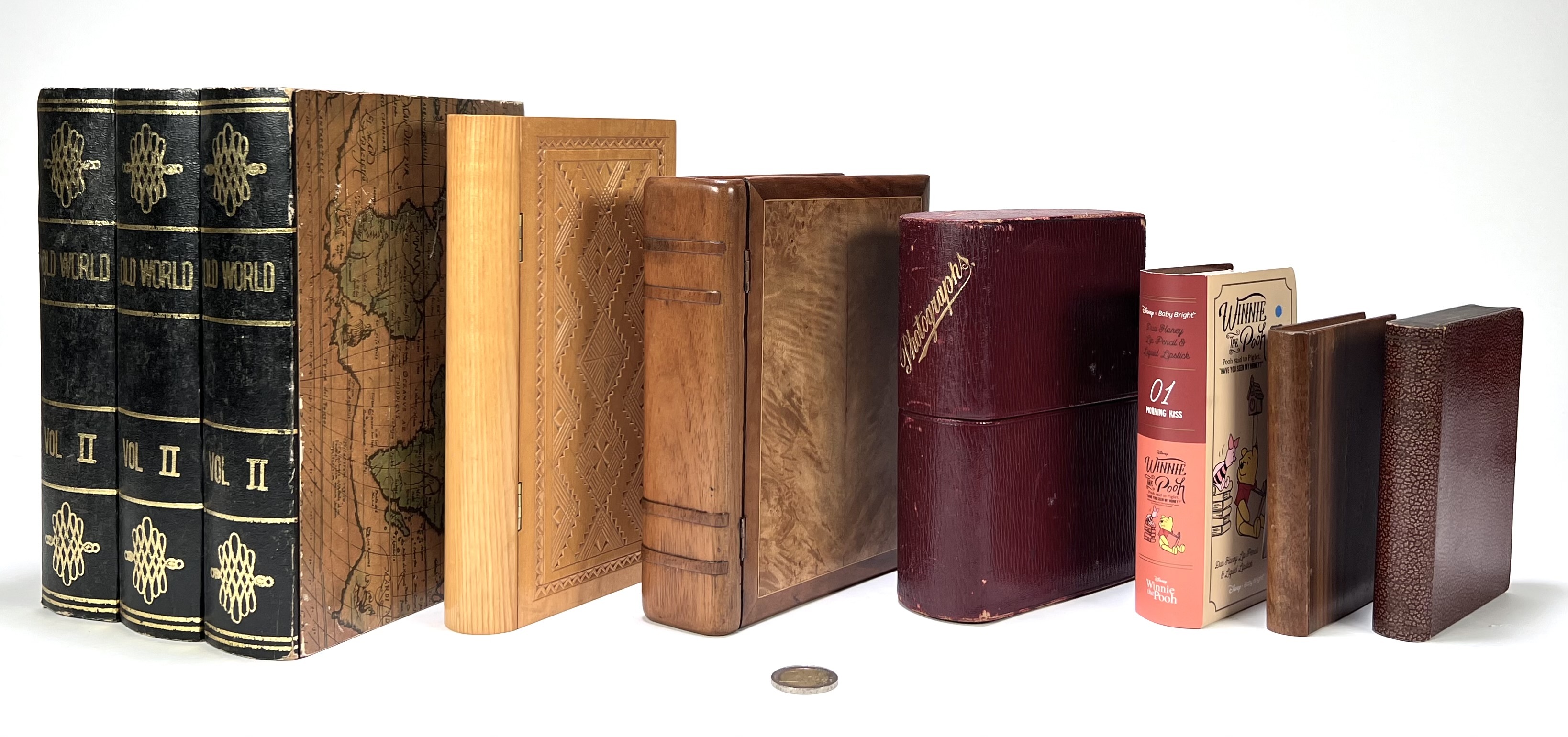 Groep van zeven boeksimulanten, eind 20e eeuw tot begin 21e eeuw, uitgevoerd in hout, bedrukt karton, fineer of kunststof. Verschillende stijlen waaronder imitatieleren ruggen, gedrukte decoraties en scharnierende constructies. Onder meer met opdrukken “Old World” en “Winnie the Pooh”, deels met opbergfunctie. Direct deelnemen? Plaats vanaf 22 augustus alvast een schriftelijk bod via onze website! |