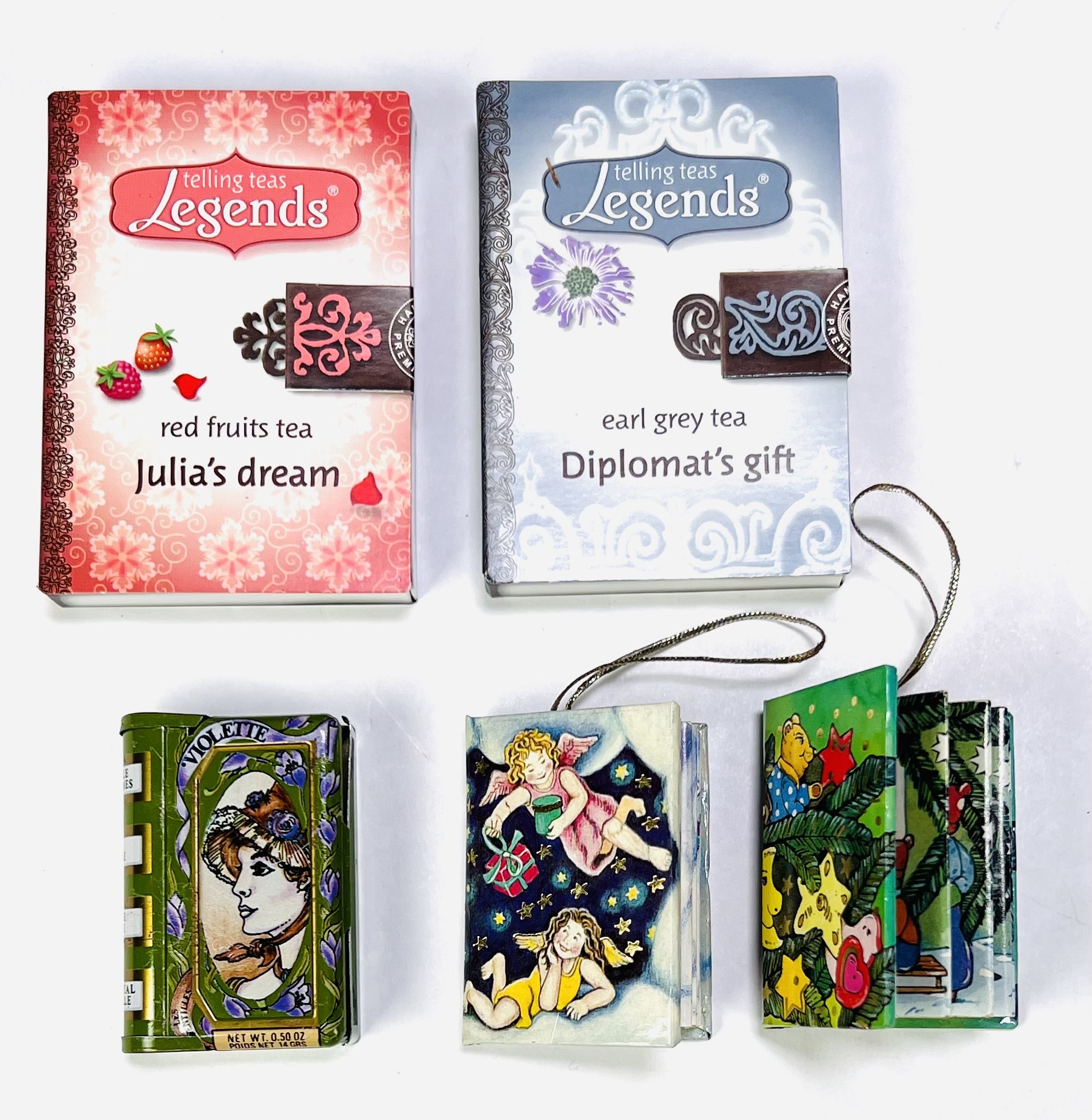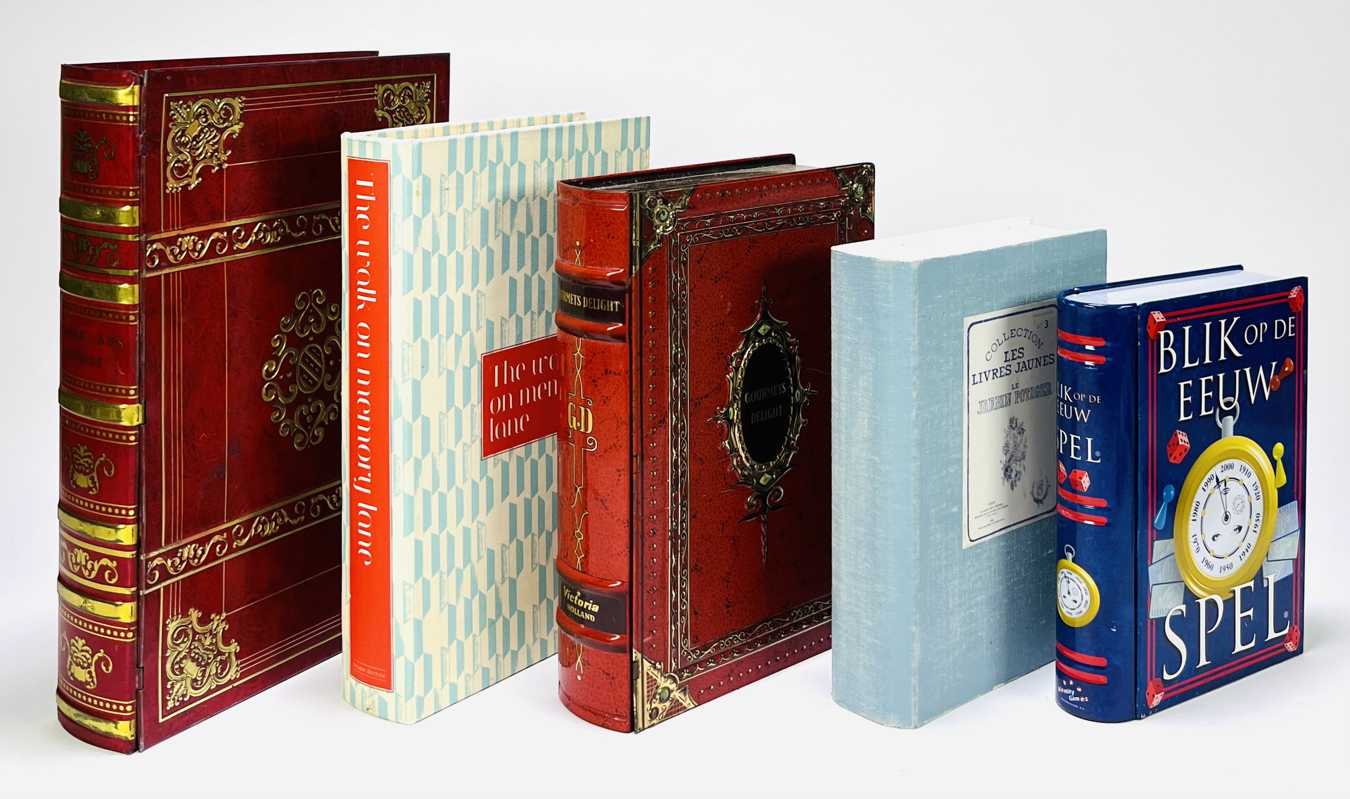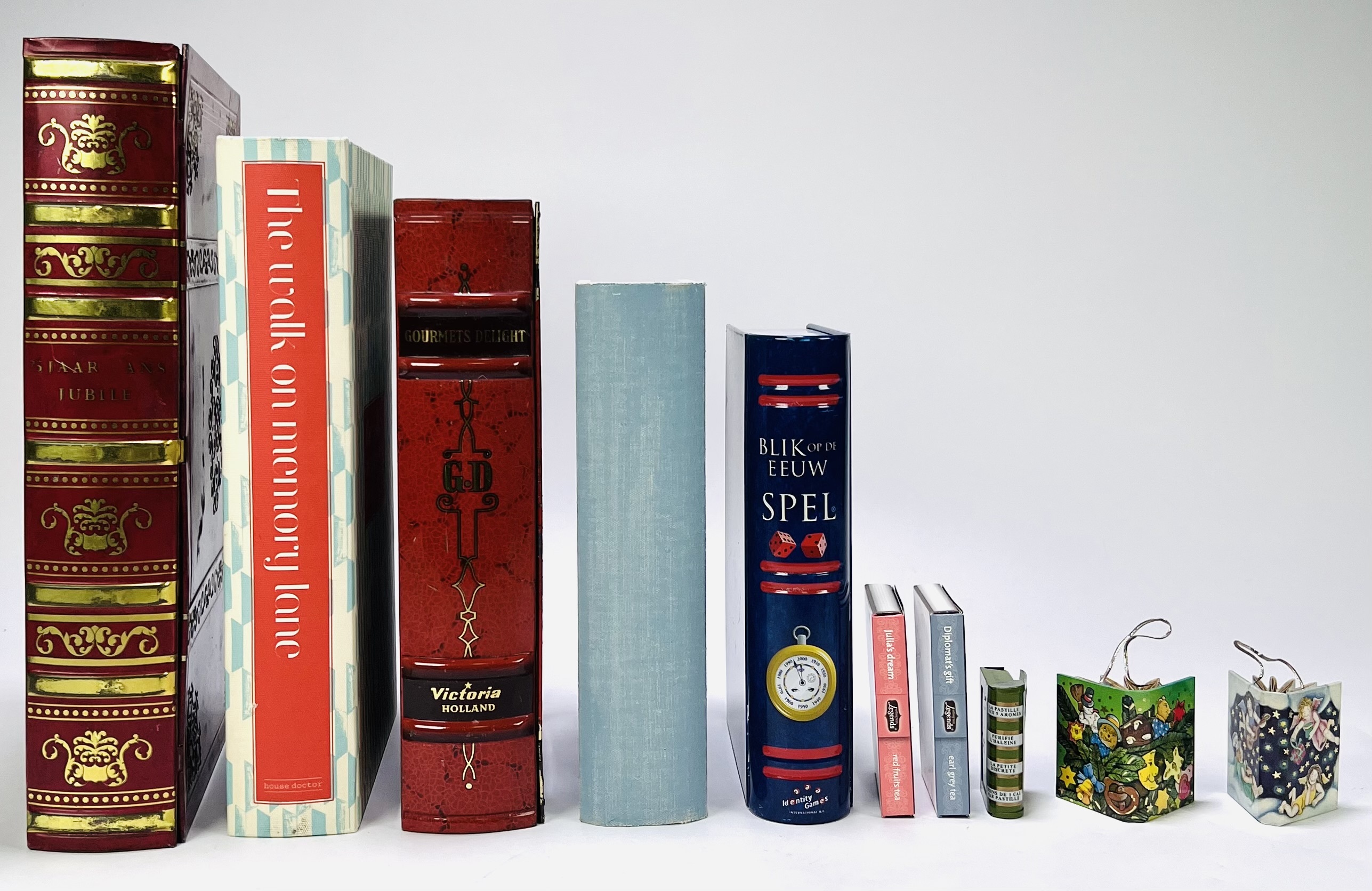 Convoluut boeksimulanten omstreeks 2000–2020, vervaardigd uit bedrukt metaal en karton, waaronder verpakkingen voor thee (zoals “Legends Julia’s dream”), snoepblikjes, kerstornamenten en opbergdozen. De stijl varieert van nostalgisch tot modern. Sommige objecten zijn voorzien van illustraties, magnetische sluitingen of goudkleurige accenten. Wilt u meedoen aan de veiling? Registreer en bied live of online! |