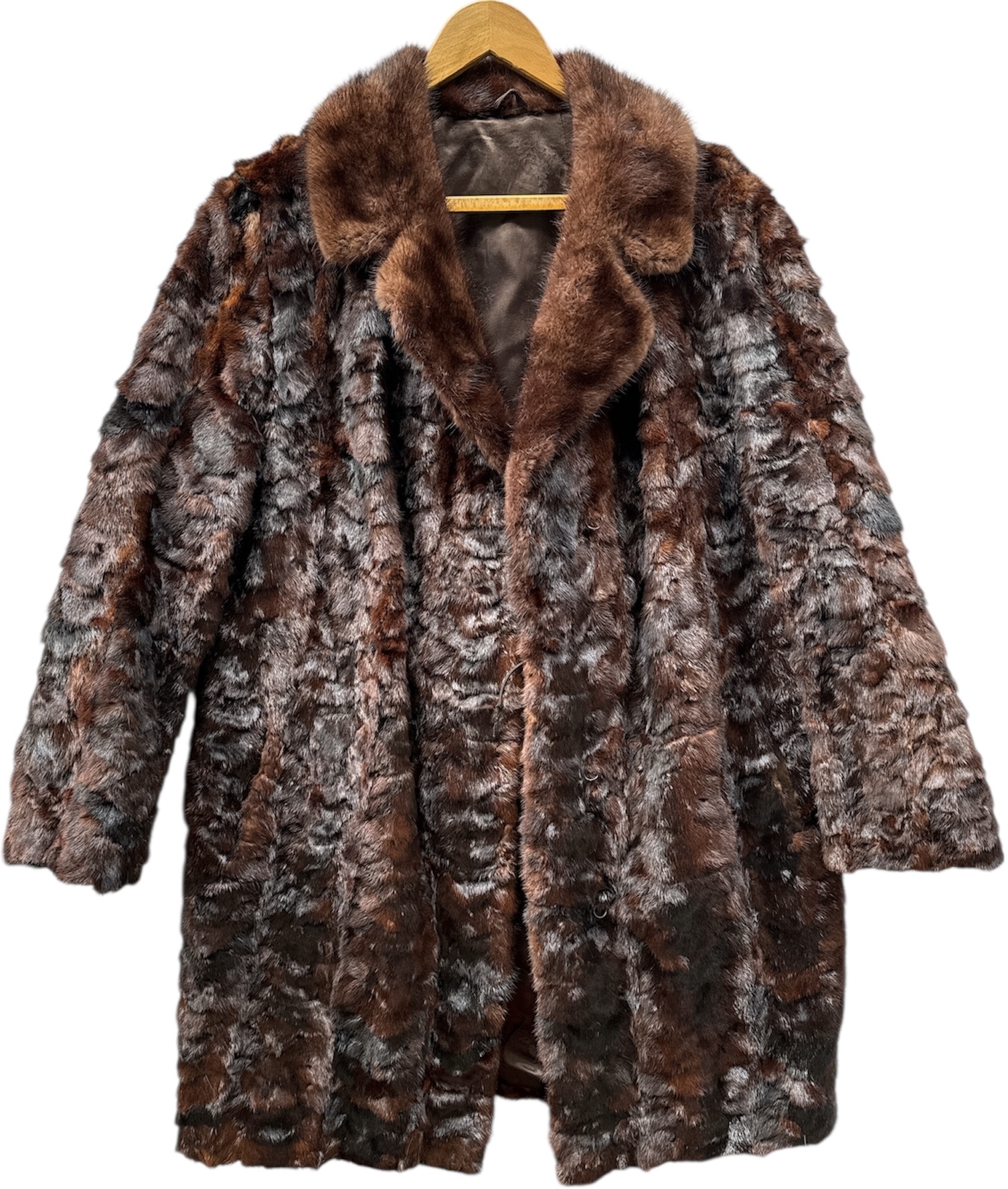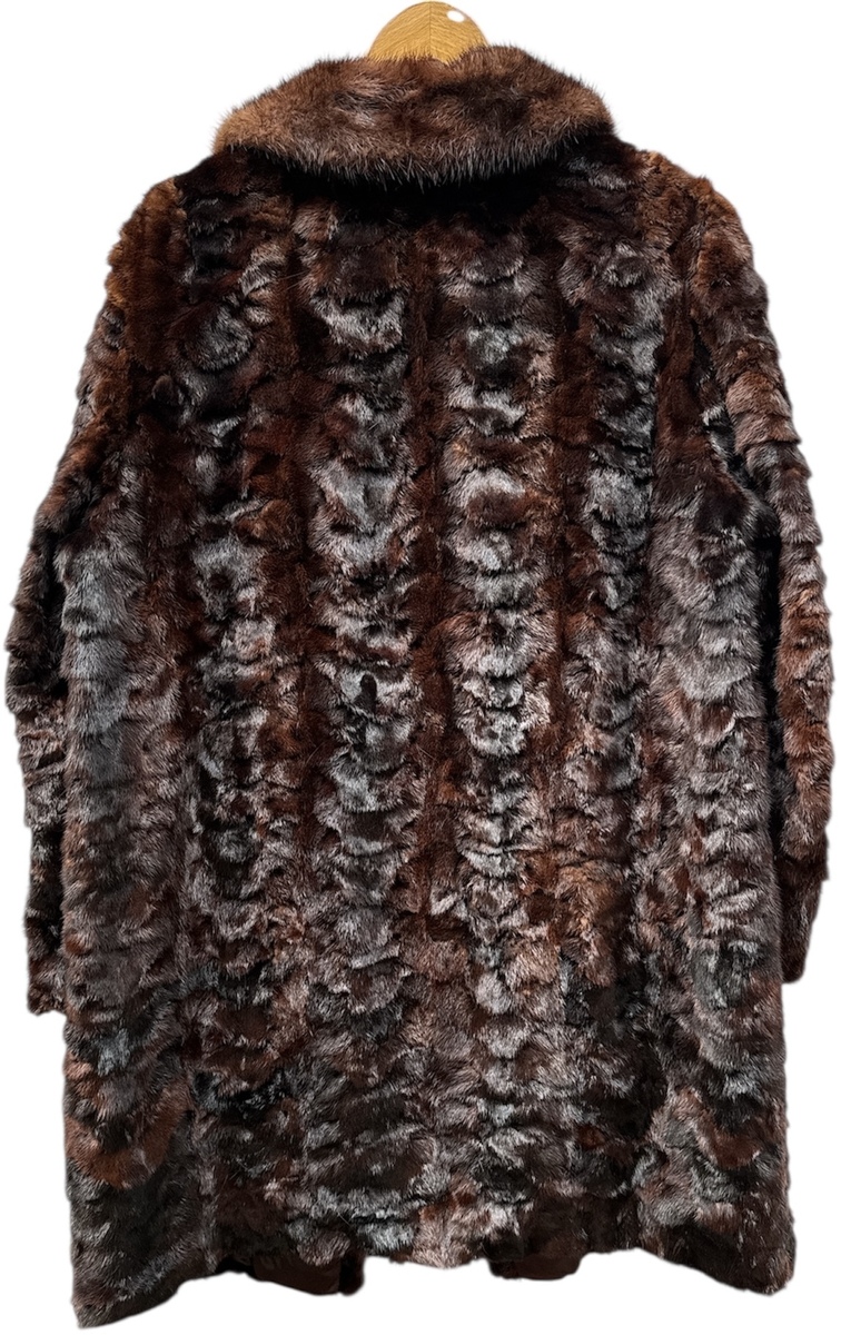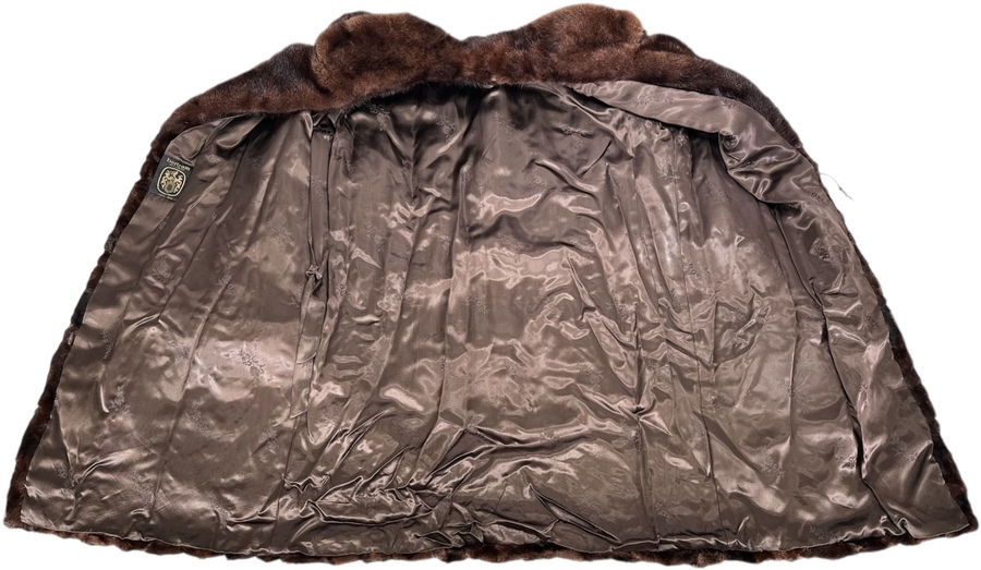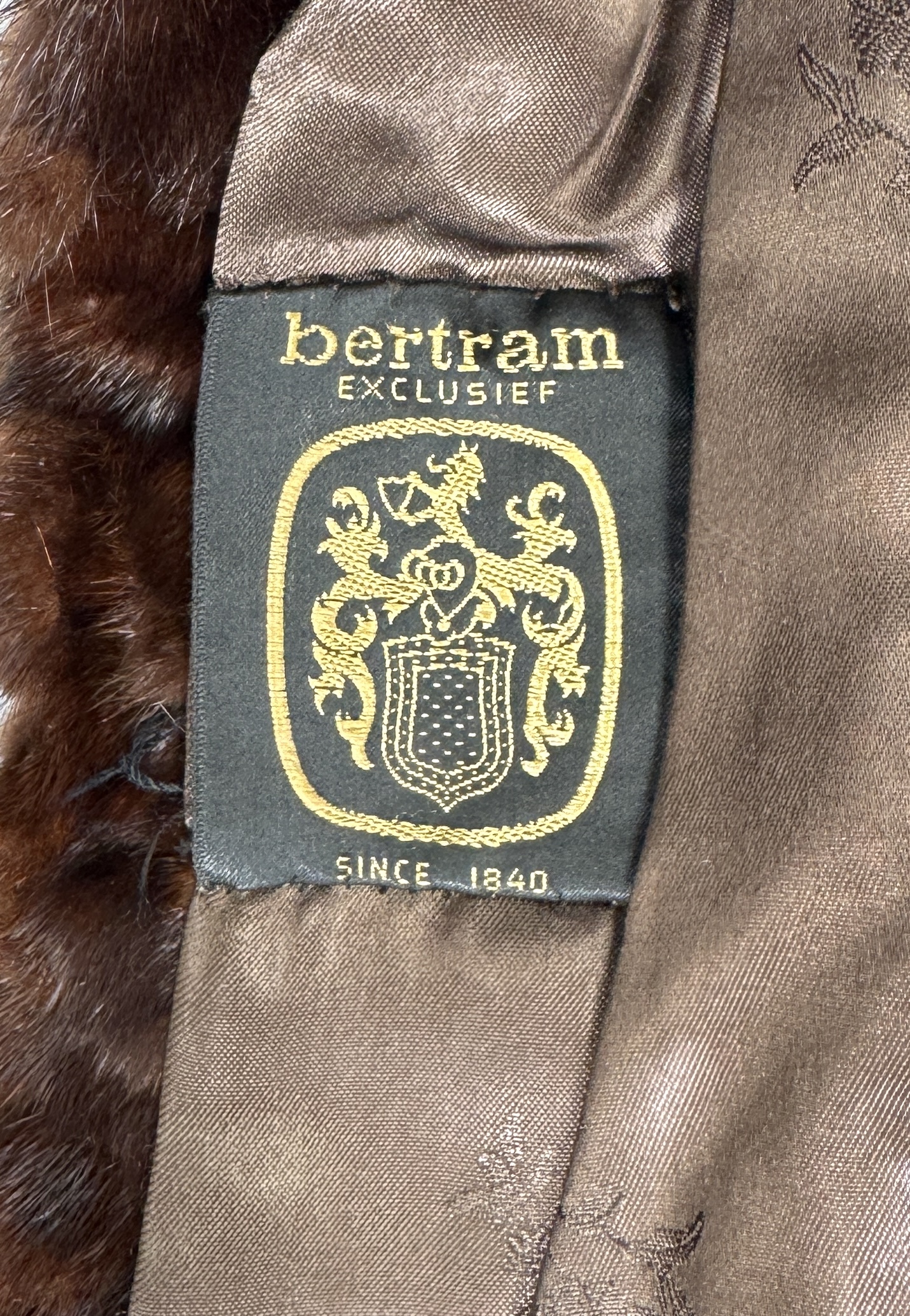 Klassieke bontjas van het merk Bertram Exclusief, daterend van circa 1960. De jas is vervaardigd van donkerbruin bont en heeft een satijnen voering. Het ontwerp kenmerkt zich door een brede kraag en een losse pasvorm, typisch voor het midden van de 20e eeuw. Het label van de maker is aan de binnenzijde zichtbaar. De bontjas zelf beoordelen? Je bent welkom op onze kijkdagen op 29, 30 en 31 augustus! |