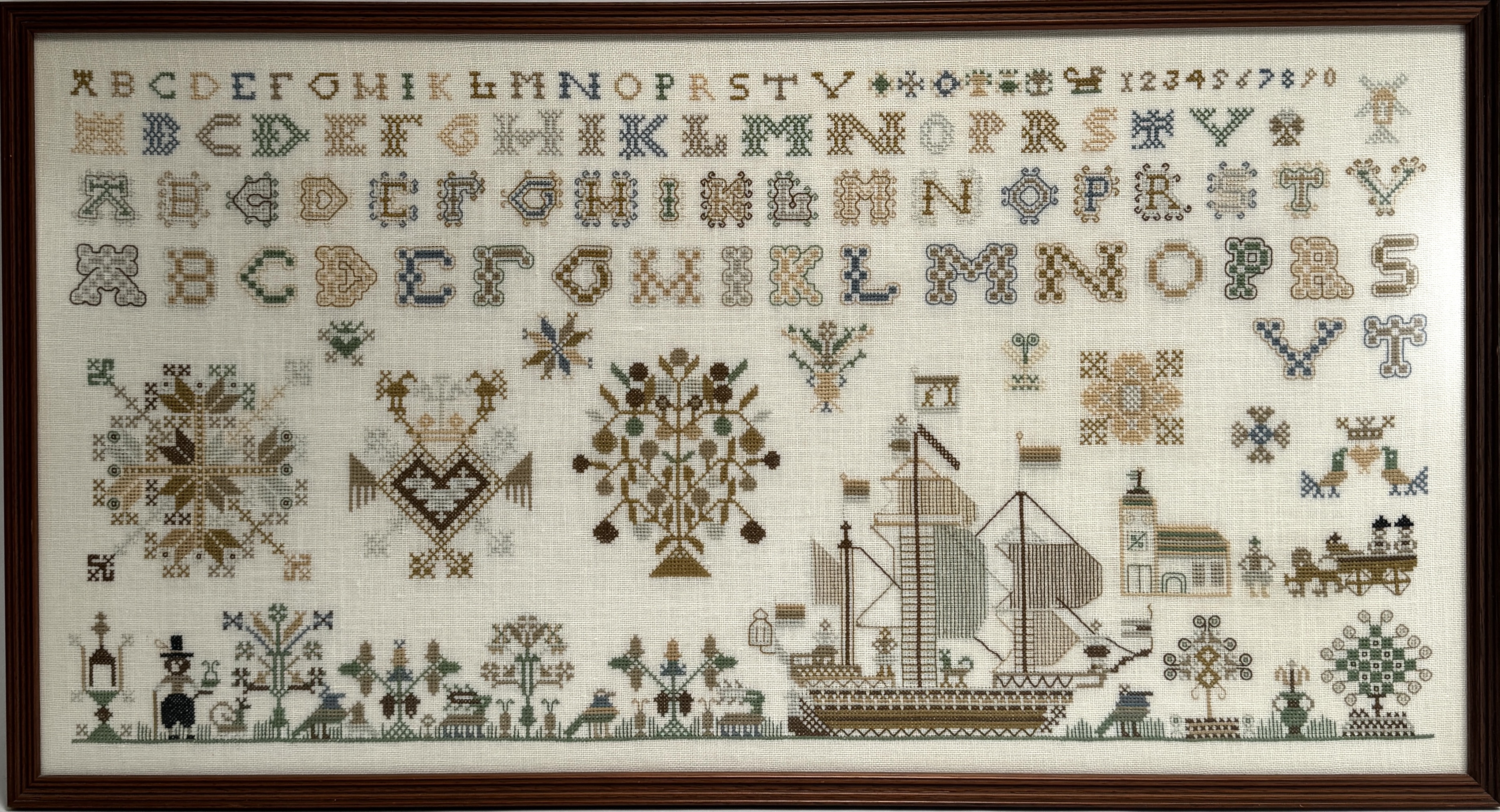 Set van twee merklappen, eind 20e eeuw, uitgevoerd op linnen met katoenen garen in kruissteektechniek. De eerste merklap toont alfabetten, een groot schip, kerk en boommotieven, de tweede merklap toont diverse folkloristische figuren, bomen en geometrische patronen. Beide merklappen zijn decoratief samengesteld, ingelijst in houten lijsten. Zeker zijn van deelname? Plaats vanaf 22 augustus een schriftelijk bod online! |