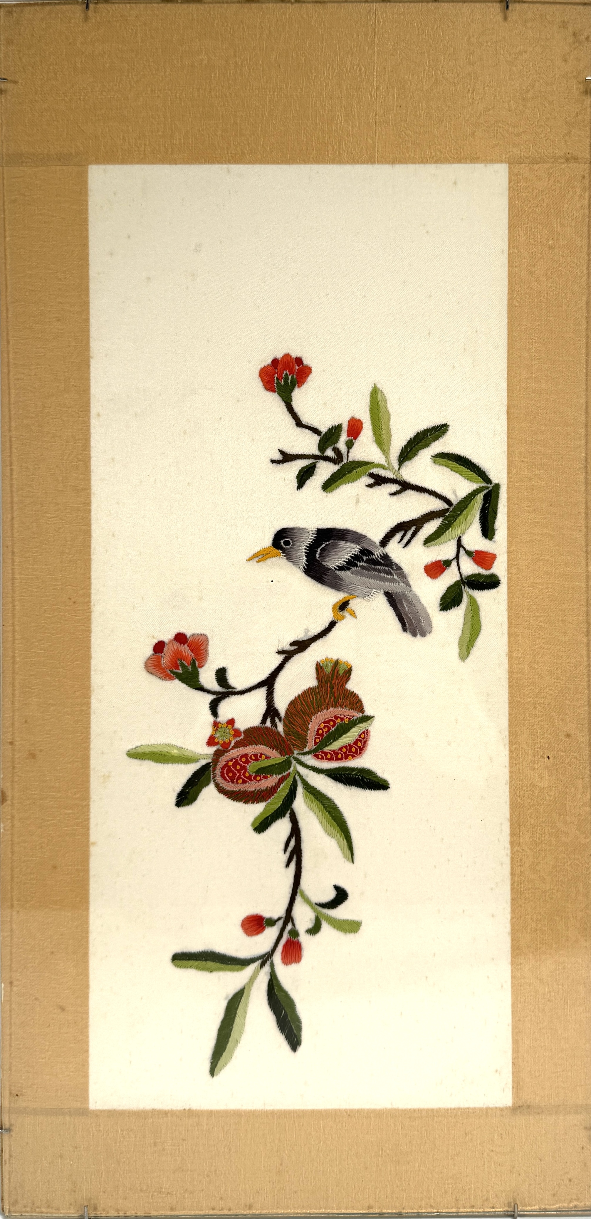 Zijde borduurwerk, vogel en bloemen, ca. midden 20e eeuw
