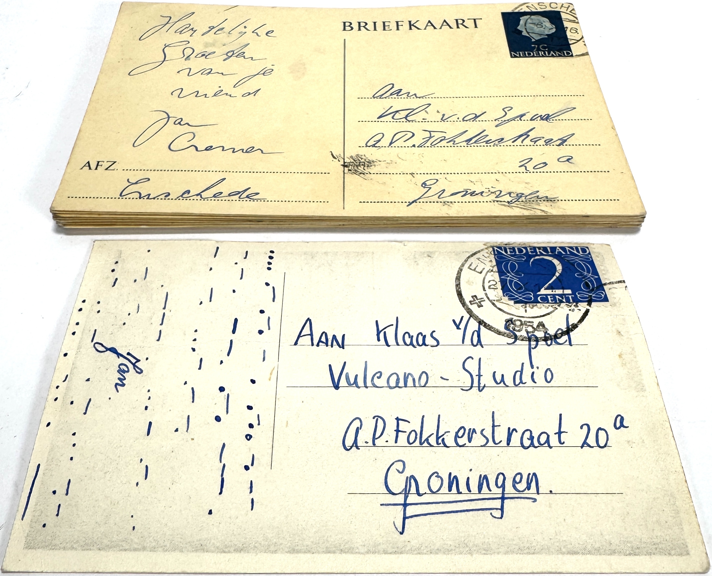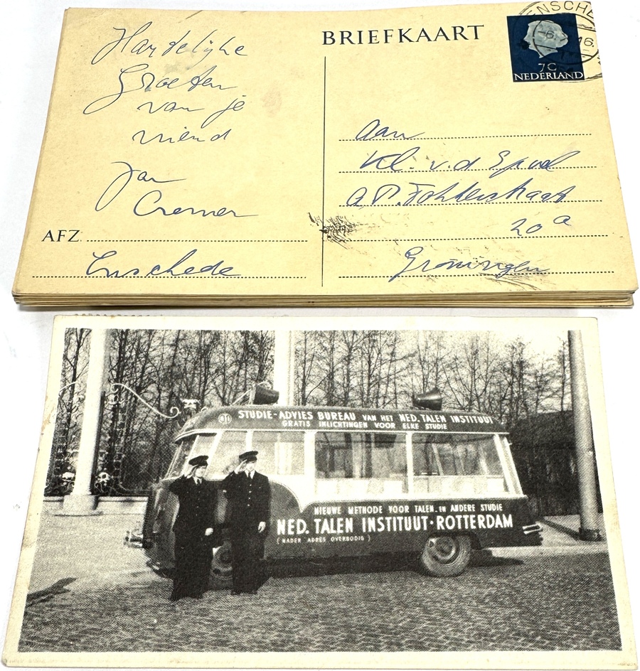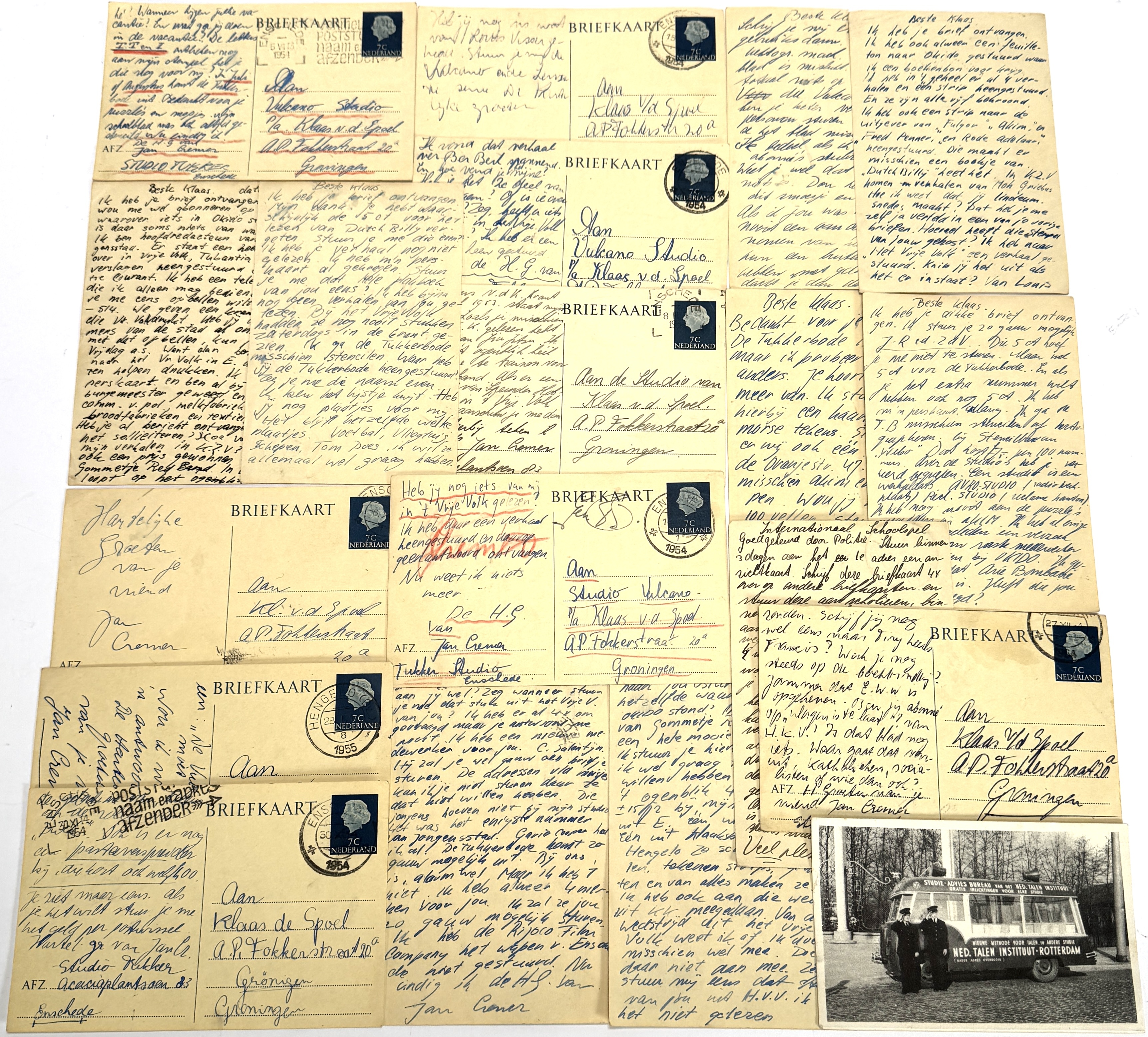 Negentien correspondentiekaarten uit midden jaren 50 van Jan Cremer (1940-2024) aan jeugdvriend Klaas van der Spoel, Vulcano Studio, Groningen, uitgevoerd in karton met handschrift in inkt op gedrukte briefkaarten, voorzien van Nederlandse postzegels en stempels ‘Enschede’. Bevat persoonlijke boodschappen, Cremers signatuur en één ansicht met foto van de Ned. Talen Instituut-bus, in handgeschreven stijl en postaal verzonden.