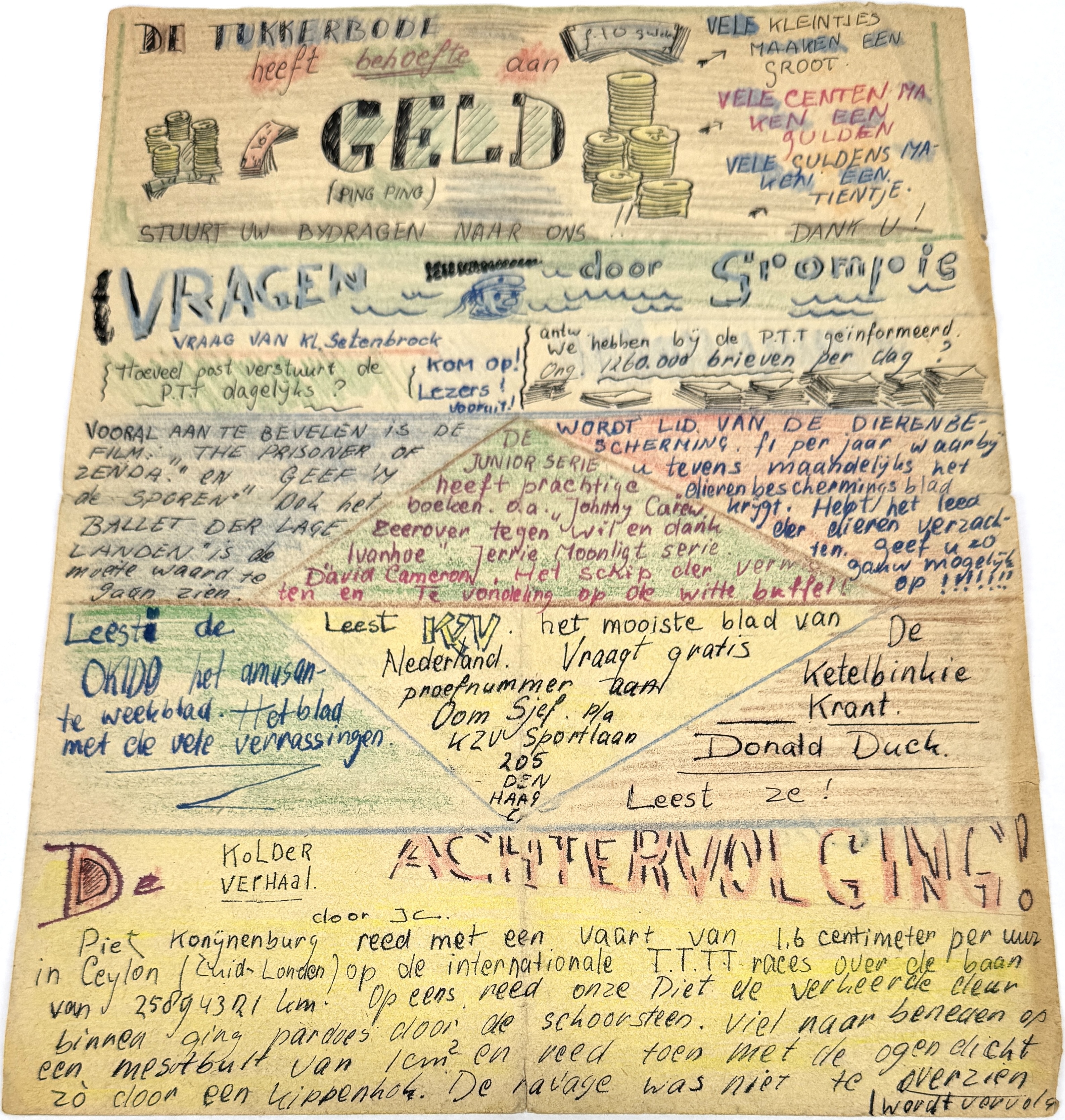 Handgetekende en geschreven pagina, recto verso, een technicolor uitgave van “de Tukkerbode” door Jan Cremer (1940 – 2024), ca. begin jaren 1950. Uitgevoerd in kleurpotlood en pen, met humoristische rubrieken, advertenties en stripachtige elementen. Deze vroege creatieve uiting geeft inzicht in de jeugdexperimenten van Jan Cremer als schrijver en tekenaar.