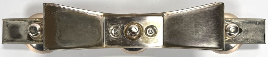 Modernistische driearmige kandelaar van WMF (Württembergische Metallwarenfabrik), ontwerp Kurt Radtke, 1961. Uitgevoerd in vernikkeld messing met aangebrachte merktekens “EP BRASS GERMANY” en WMF-logo aan de onderzijde. Strakke geometrische vorm met V-vormige steun en drie afzonderlijke schotelschalen voor kaarsen. Eerst de kandelaar zien voordat je biedt? Bezoek onze kijkdagen op 29, 30 en 31 augustus van 11:00 tot 17:00 uur! |