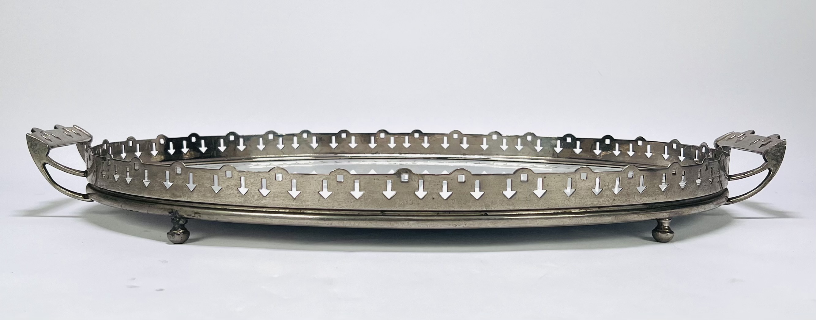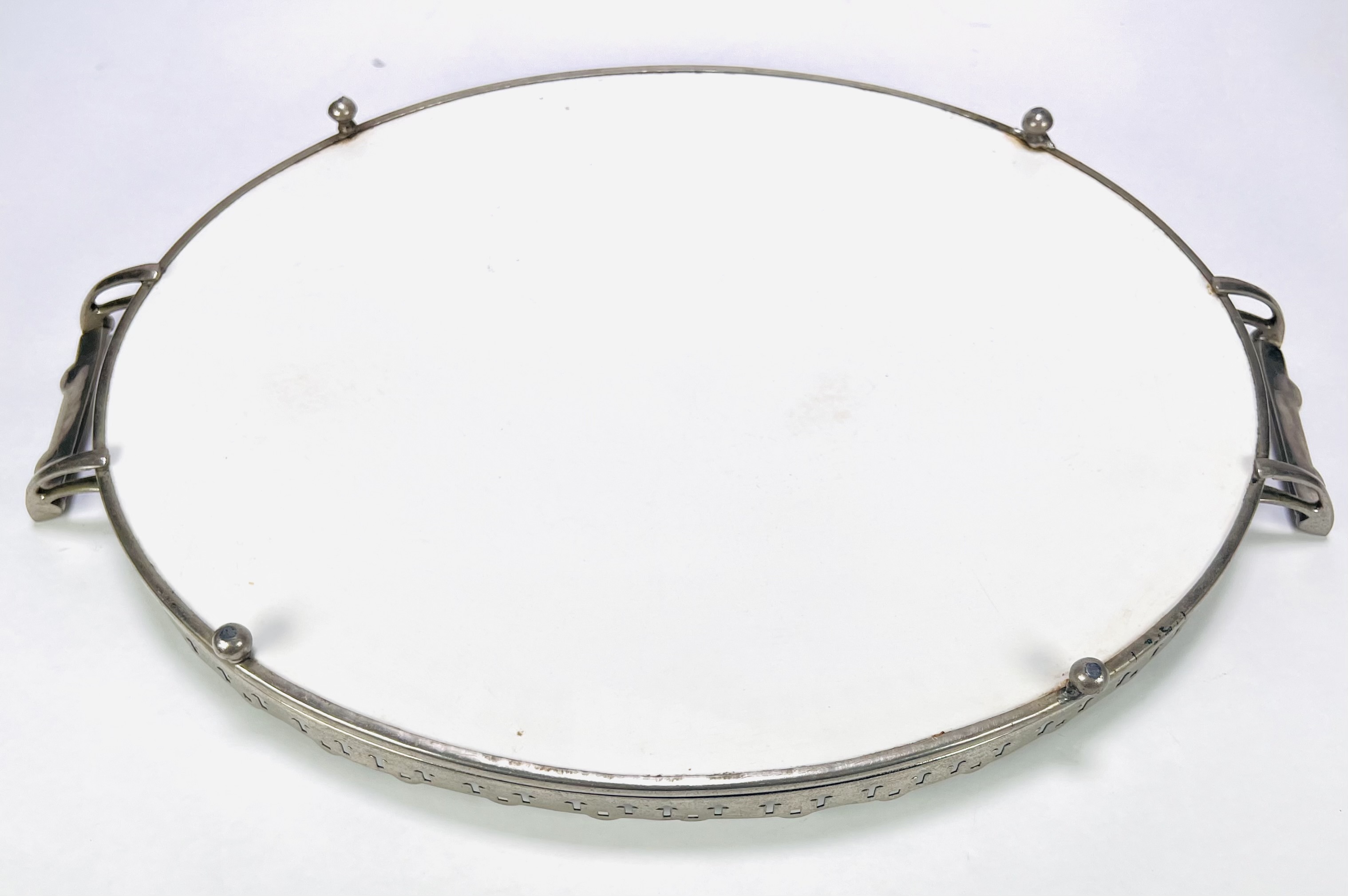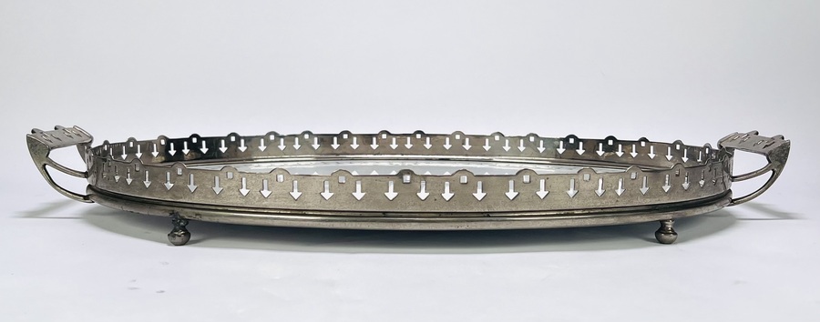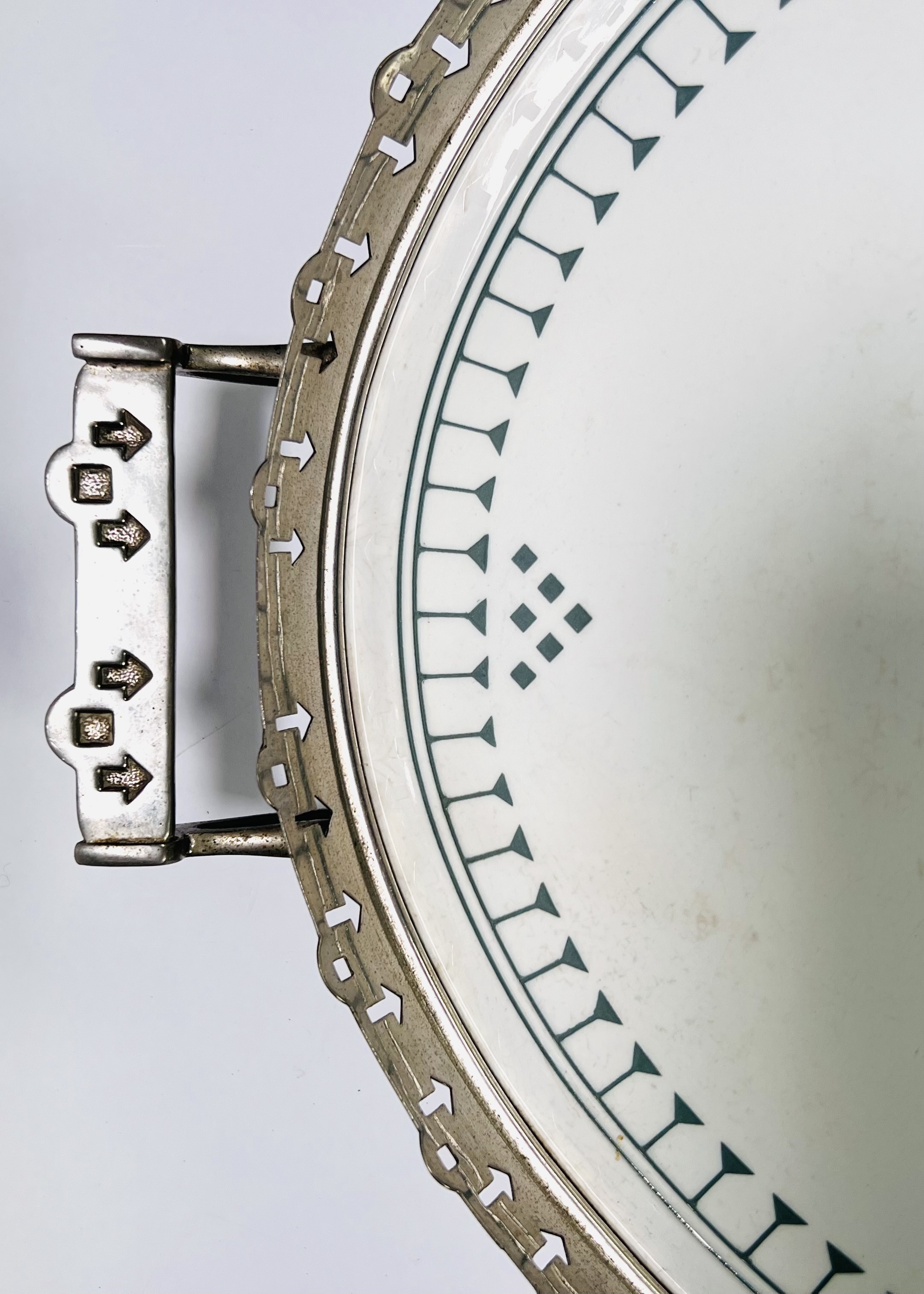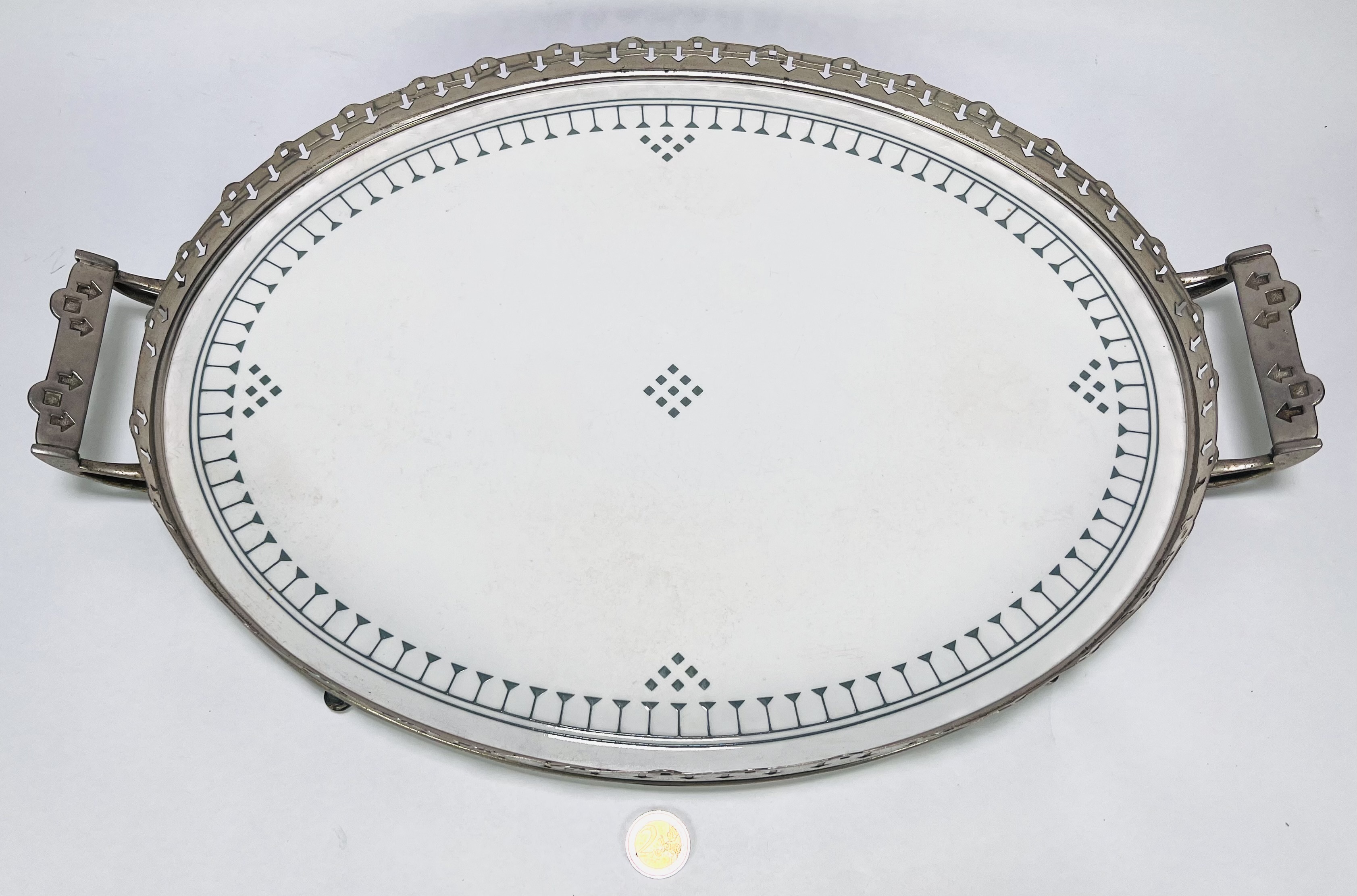 Art Deco ovalen dienblad, eerste kwart 20e eeuw, uitgevoerd in verchroomd metaal en porselein met opengewerkt metalen frame en pijlvormige perforaties, grepen met geometrische motieven. Het inzetblad is versierd met grijsgroen geometrisch lijnenspel en ruitvormige accenten. Voorzien van vier bolvormige pootjes. Interesse in dit stuk? Registreer en bied eenvoudig online mee! |