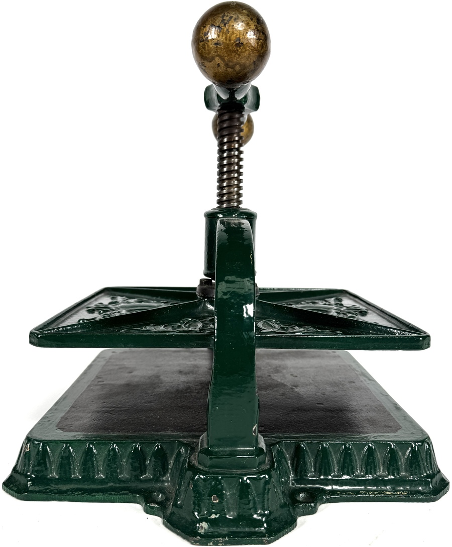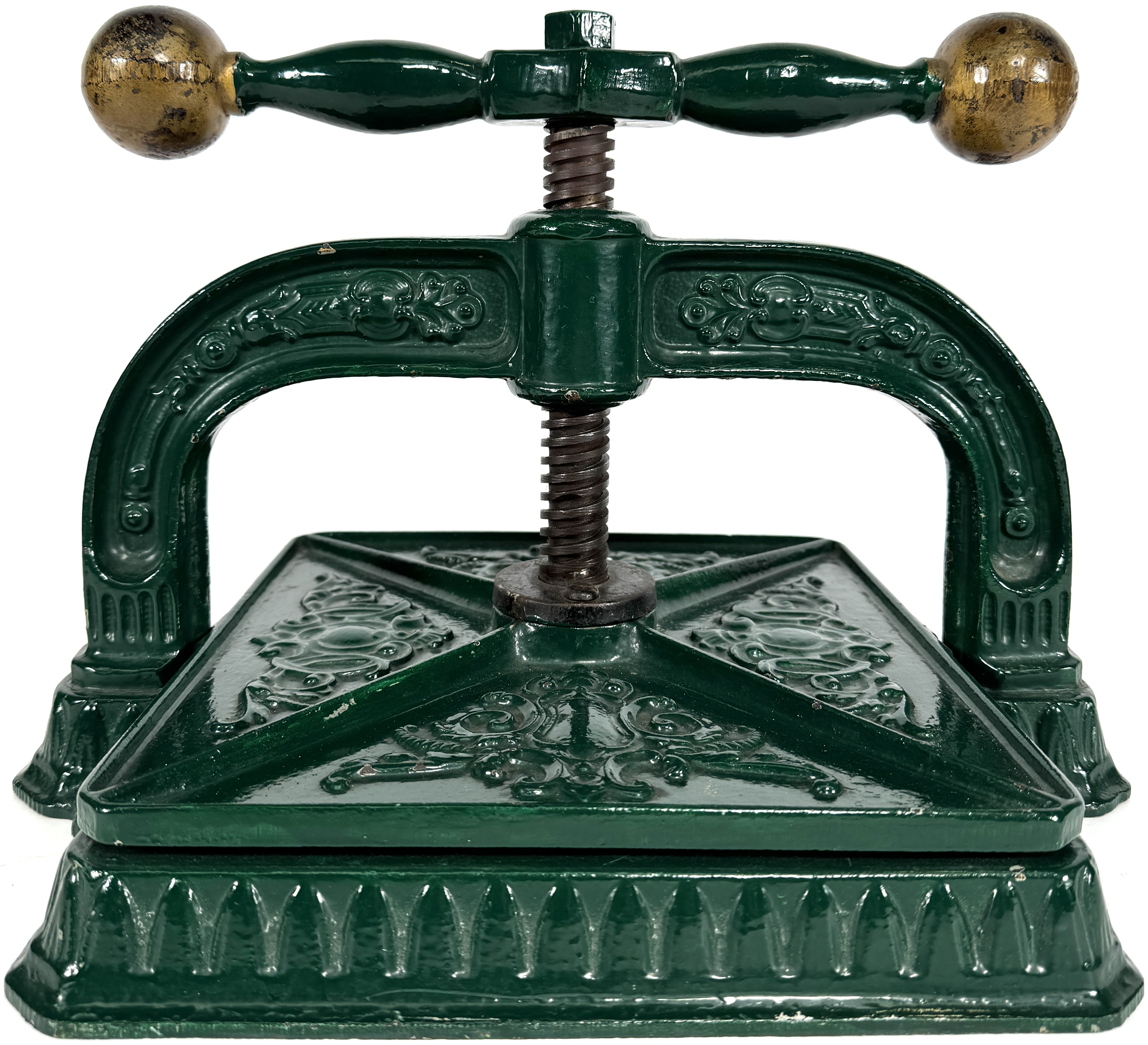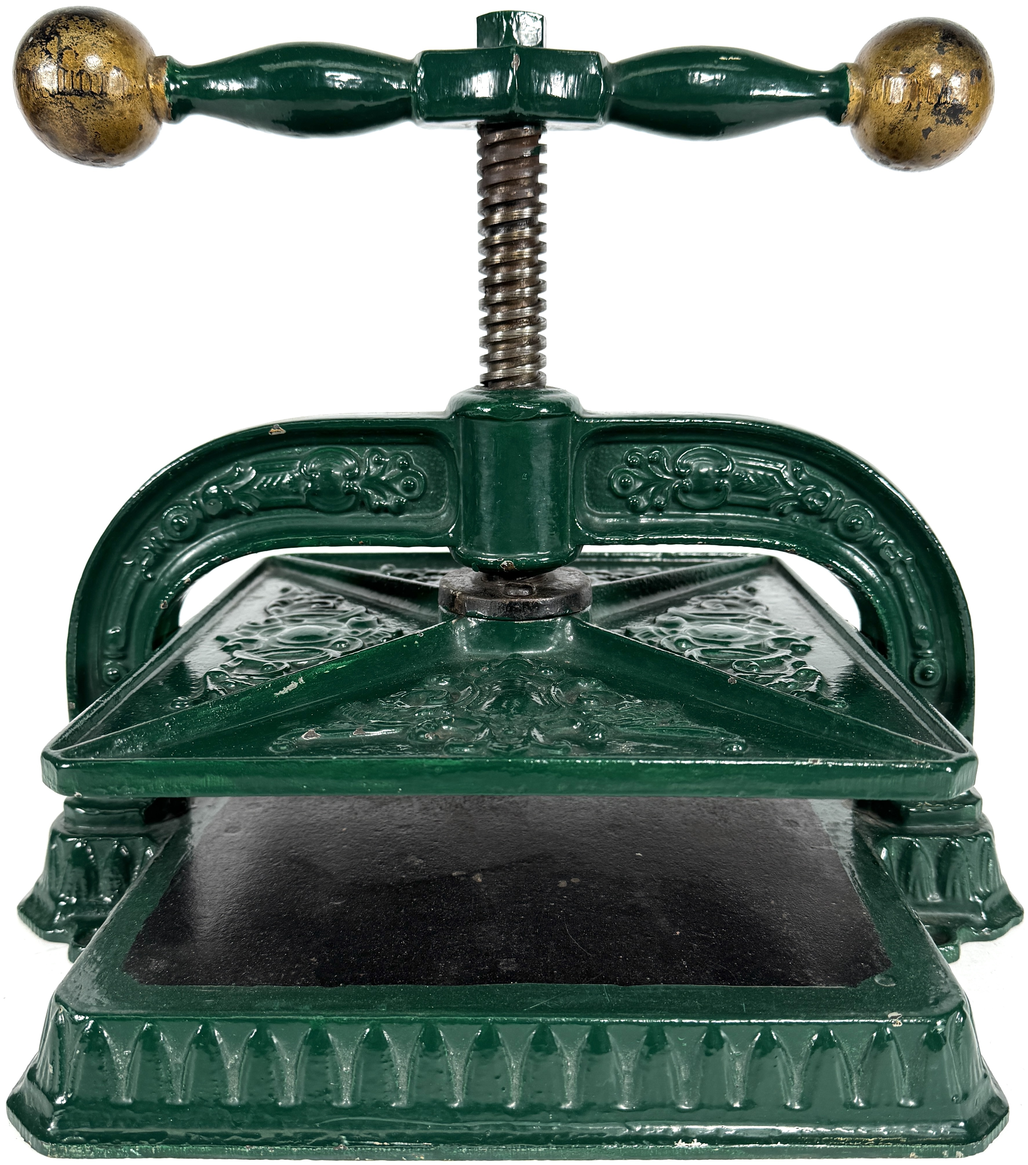 Gietijzeren boekdrukpers, eind 19e eeuw. Functioneel object met florale decoraties in neostijl, voorzien van een schroefmechaniek met ronde messing knop. De pers bestaat uit een zwaar uitgevoerde voetplaat met opstaande rand, kruisvormige drukplaat en verticale spindel, groene lakafwerking. Interesse in de boekdrukpers? Registreer en bied eenvoudig online mee! |