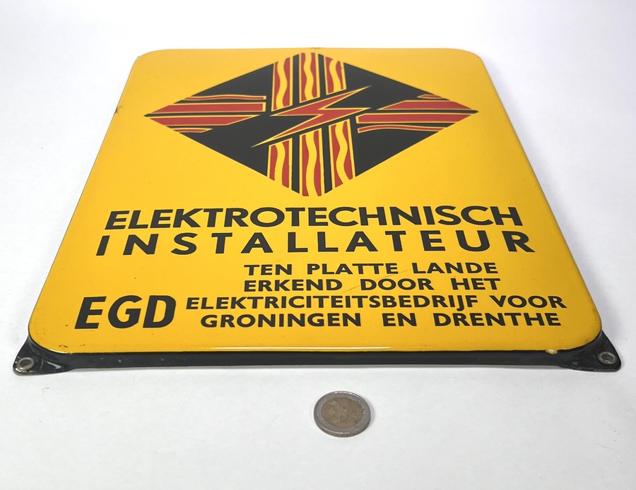 Emaille bord, uitgevoerd in metaal met industriële zeefdruktechniek, omstreeks 1950. met een gestileerde bliksemembleem in rood, geel en zwart op een gele ondergrond. Het object diende als erkenningsbord voor elektrotechnische installateurs, aangesloten bij het Elektriciteitsbedrijf voor Groningen en Drenthe (EGD). Voorzien van montagegaten in de hoeken en duidelijke functionele typografie. Zelf beoordelen? U bent welkom op onze kijkdagen op 29, 30 en 31 augustus! |