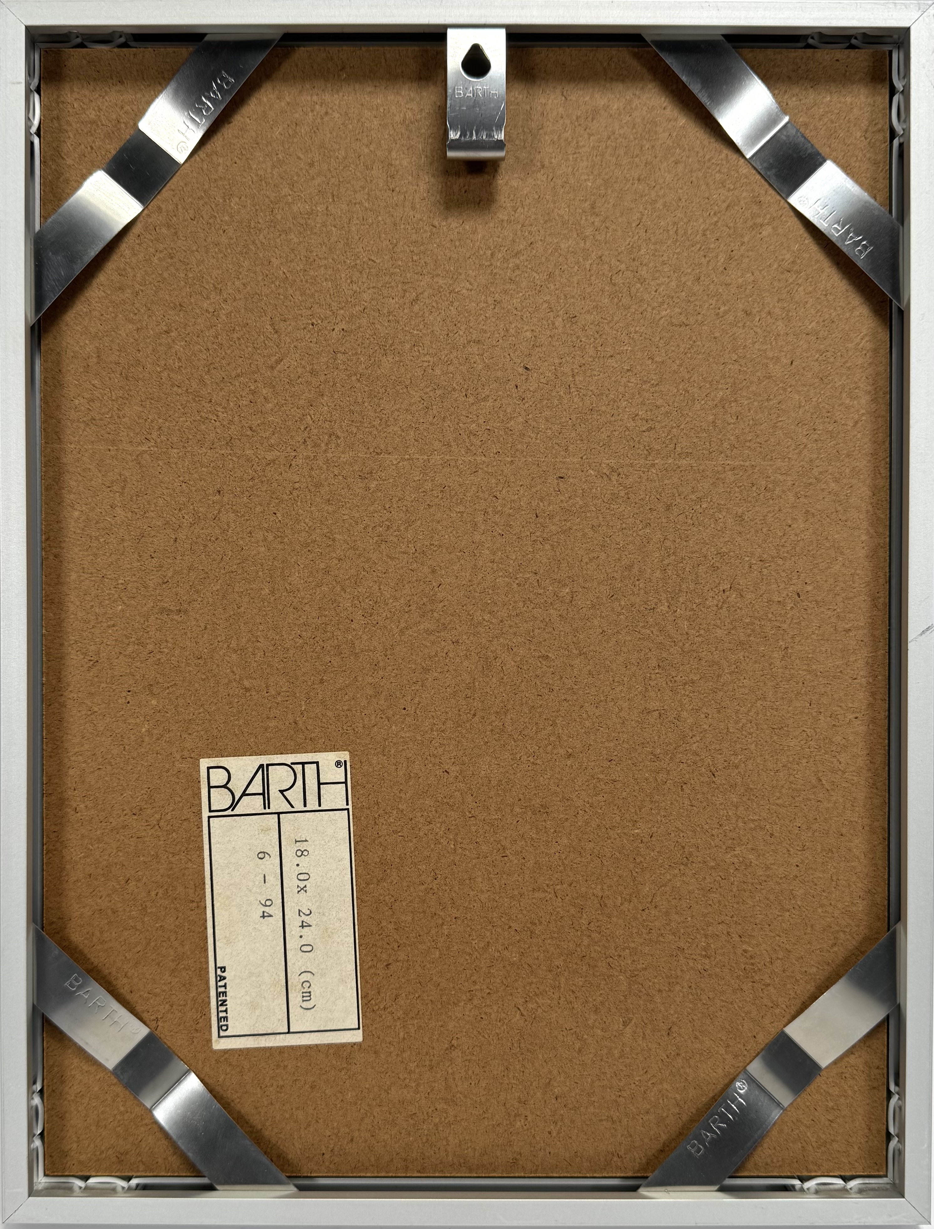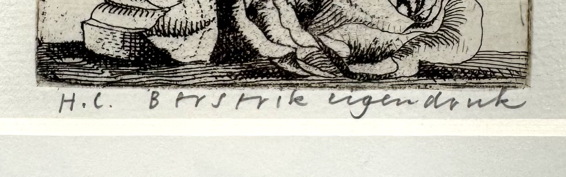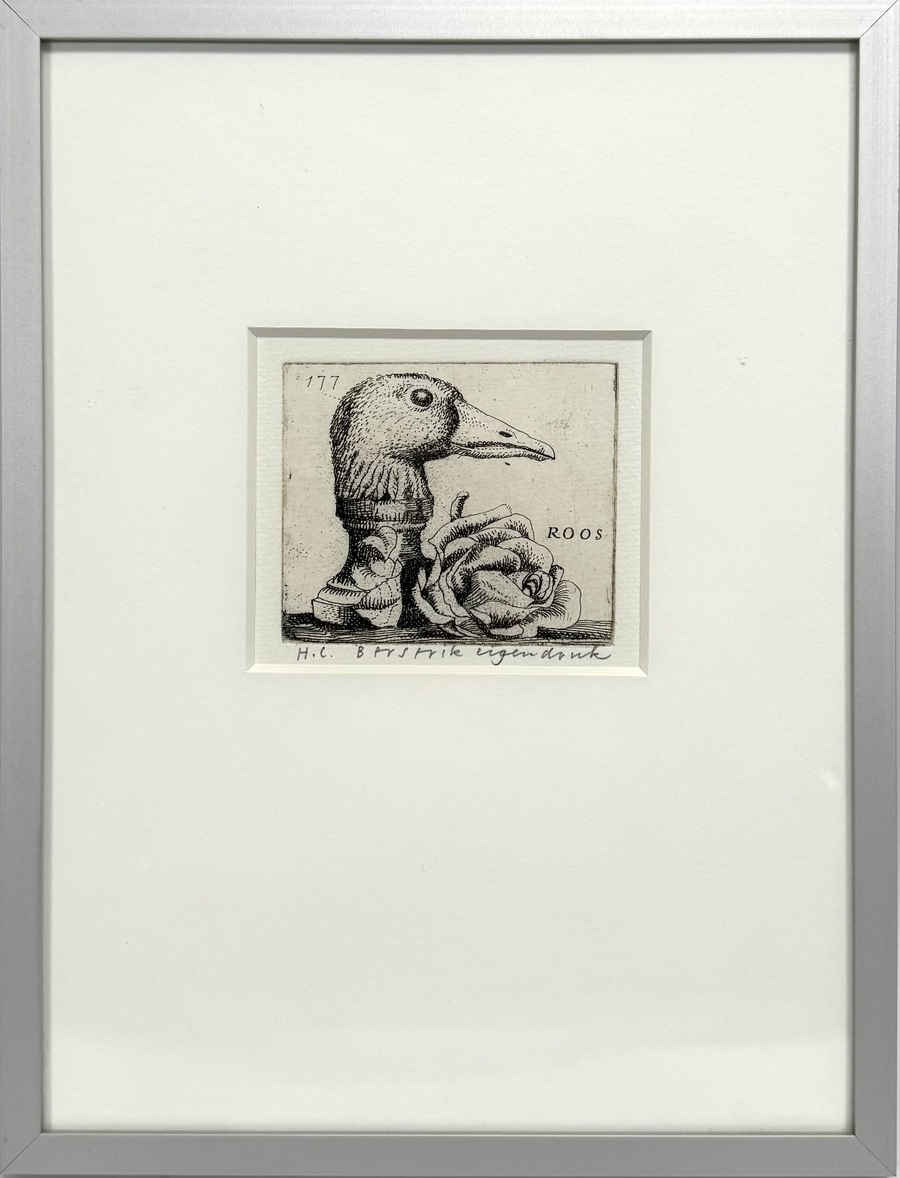 Ets van Hermanus Berserik (1921–2002), papier en inkt, surrealistische voorstelling van een eendekop op sokkel naast een roos. Gesigneerd Berserik met vermelding eigendruk en H.C. (hors commerce). Niet gedateerd, vermoedelijk jaren ’90. Uitgevoerd in zwarte inkt op papier, gemonteerd in aluminium wissellijst, met nummering 177 in de prent. Geïnteresseerd? Bezoek onze kijkdagen voor een persoonlijke bezichtiging! |