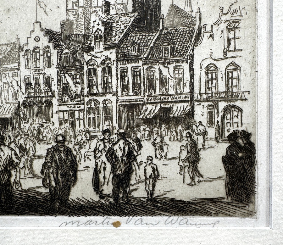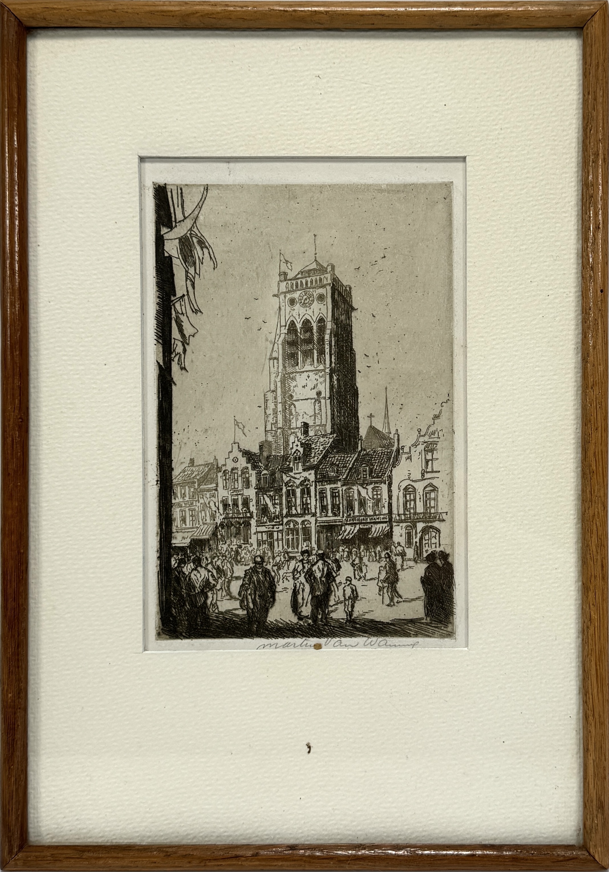 Ets van de Nederlandse kunstenaar Martin van Waning (1889-1972), daterend circa 1920-1940. De ets, uitgevoerd in inkt op papier, toont Veurne (België) met de toren van de Sint Nicolaaskerk in een impressionistische stijl. De voorstelling bevat een levendig plein met gevels en een kerktoren. Het werk is in de rechterhoek van de prent gesigneerd. Eerst zien voordat je biedt? Bezoek onze kijkdagen op 29, 30 en 31 augustus van 11:00 tot 17:00 uur! |