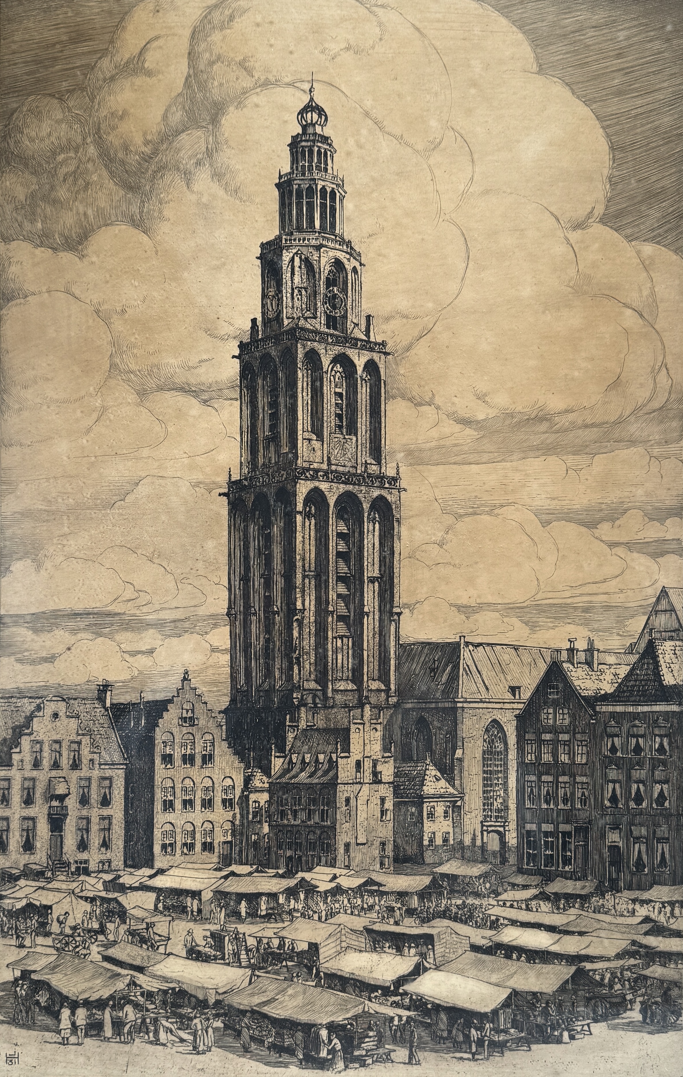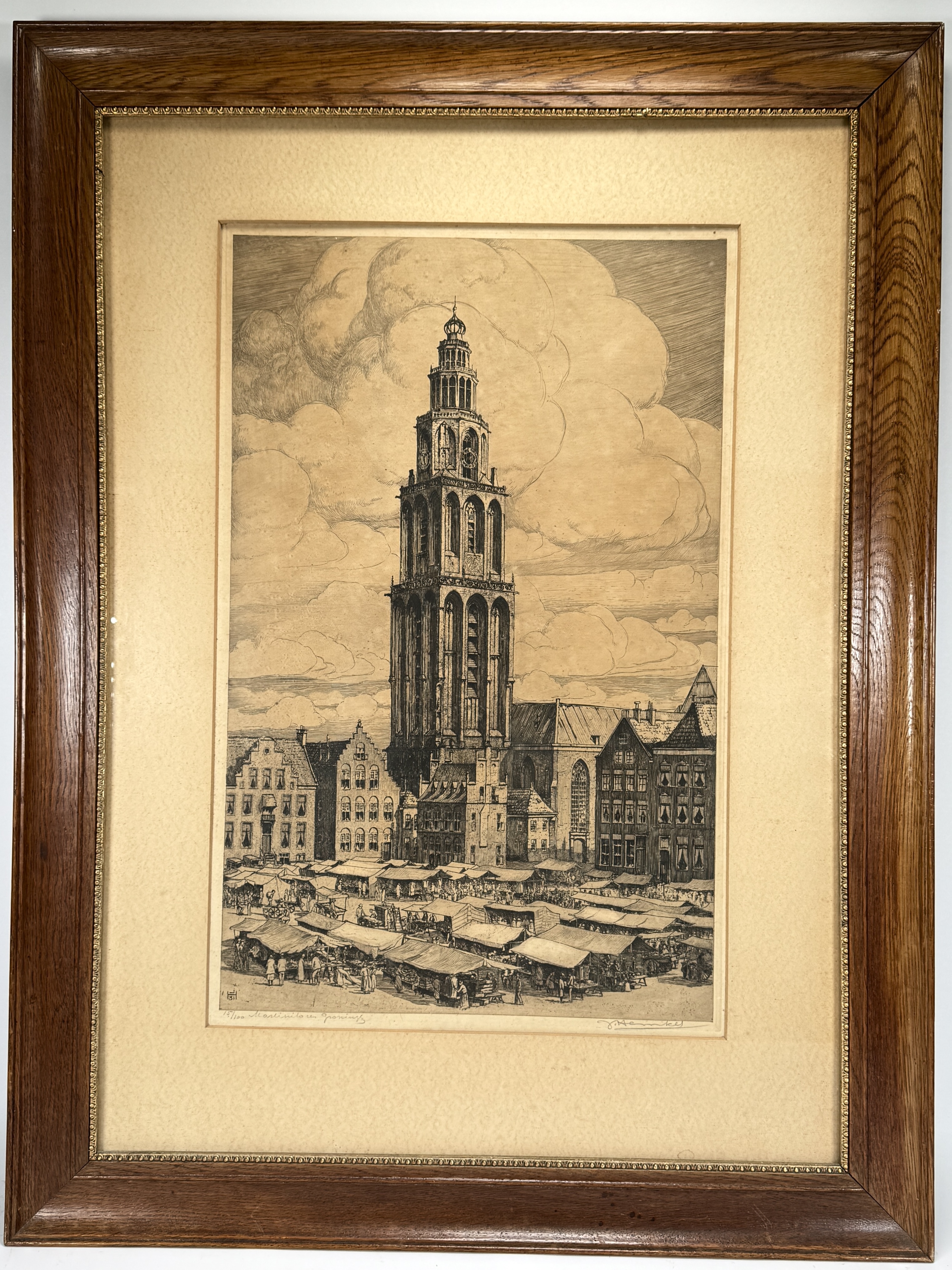 Ets van Johan Hemkes (1894 - 1988), op papier uit 1931. Realistische en gedetailleerde stijl met focus op de Martinitoren en de Grote Markt in Groningen, inclusief marktkramen en bezoekers. De lucht is rijk uitgewerkt met wolkenpartijen. Gesigneerd in potlood rechtsonder. Wilt u bieden? Schrijf u in en doe mee aan de veiling! |