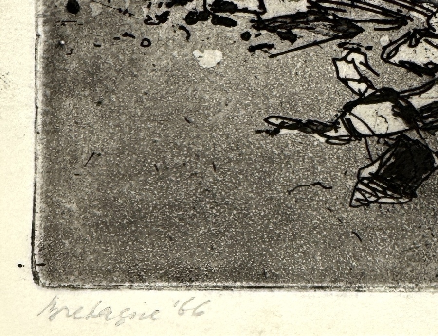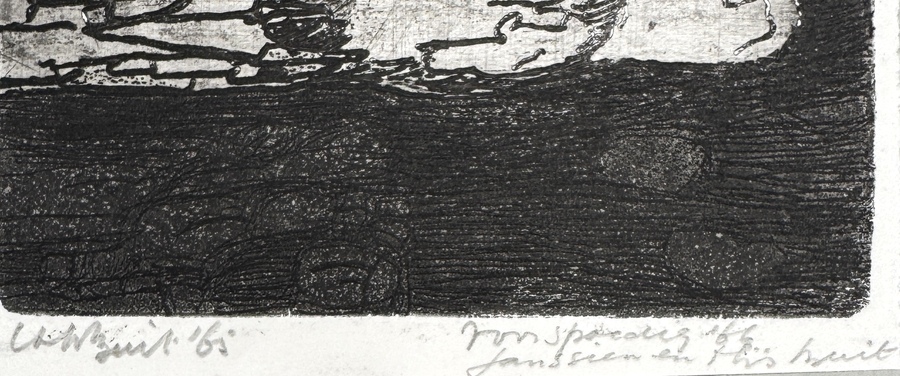 Twee etsen/nieuwjaarskaarten uit ‘65 en ‘66 van Thijs Buit (1934). Eén ets met potlood linksonder gesigneerd en gedateerd ‘65 en rechtsonder vermelding “Voorspoedig ‘66, Janssien en Thijs Buit”. Andere ets met potlood rechtsonder gesigneerd, linksonder Bretagne ‘66, in verso “Onze beste wensen voor 1967, Janssien en Thijs Buit”. Bied eenvoudig mee, live of online. Registreer nu! |