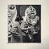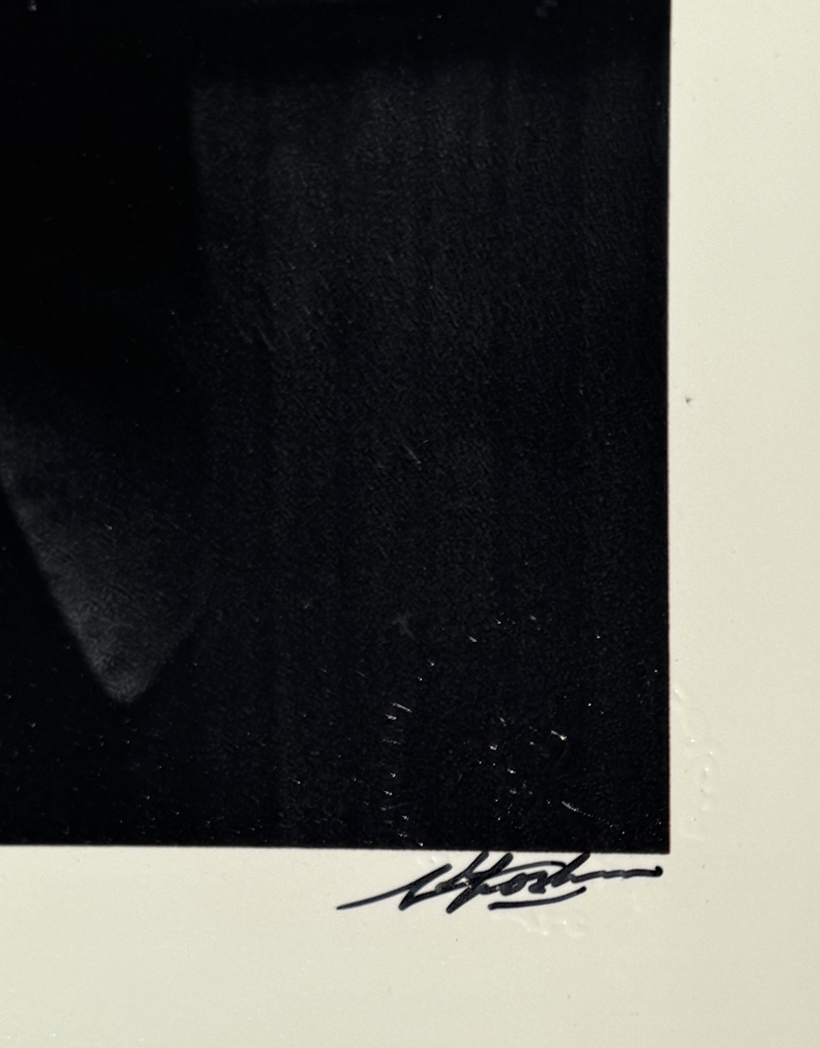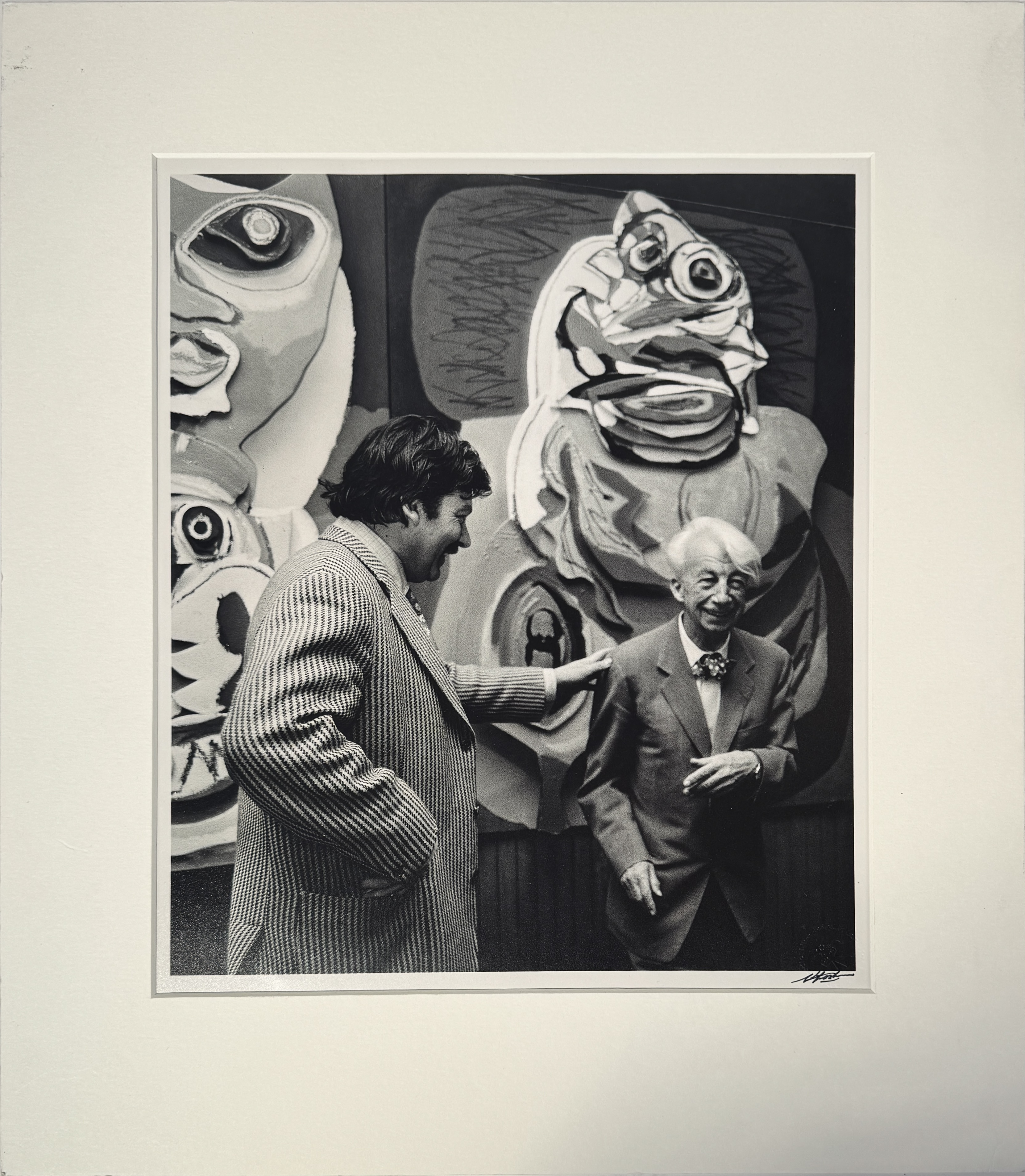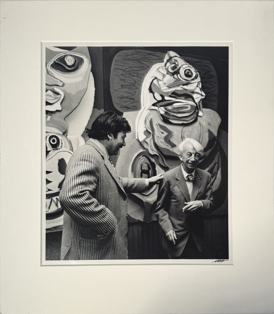 Zwart-wit foto, omstreeks 1980, voorstelling van Karel Appel met Willem Sandberg voor expressieve schilderijen, in documentaire stijl met contrastrijke belichting en focus op interactie en context binnen de kunstwereld. Uitgevoerd op Fujicolor Crystal Archive Paper Supreme, analoge gelatine zilverdruk. Rechtsonder door Nico Koster gesigneerd in zwarte inkt met blindstempel.
