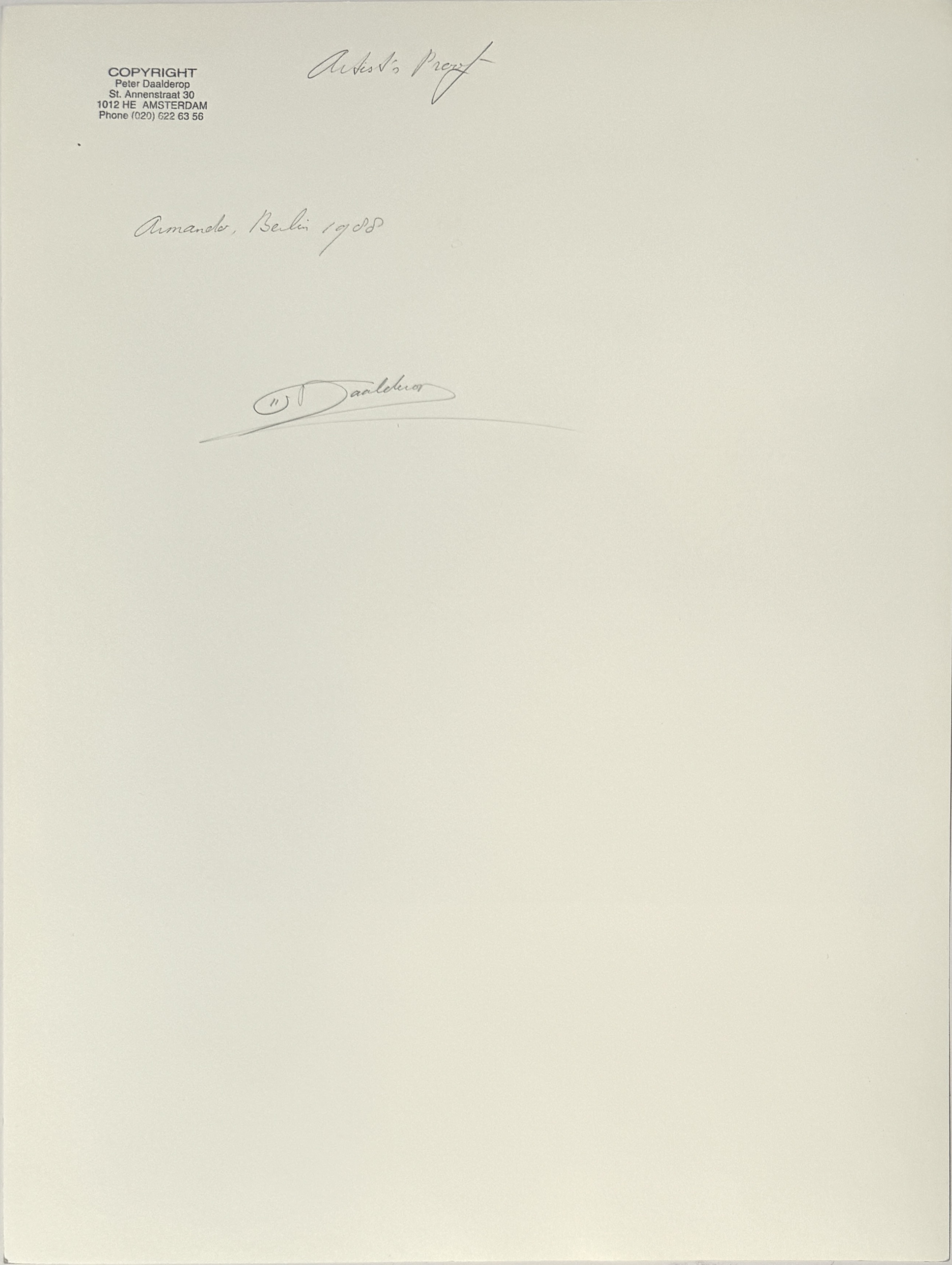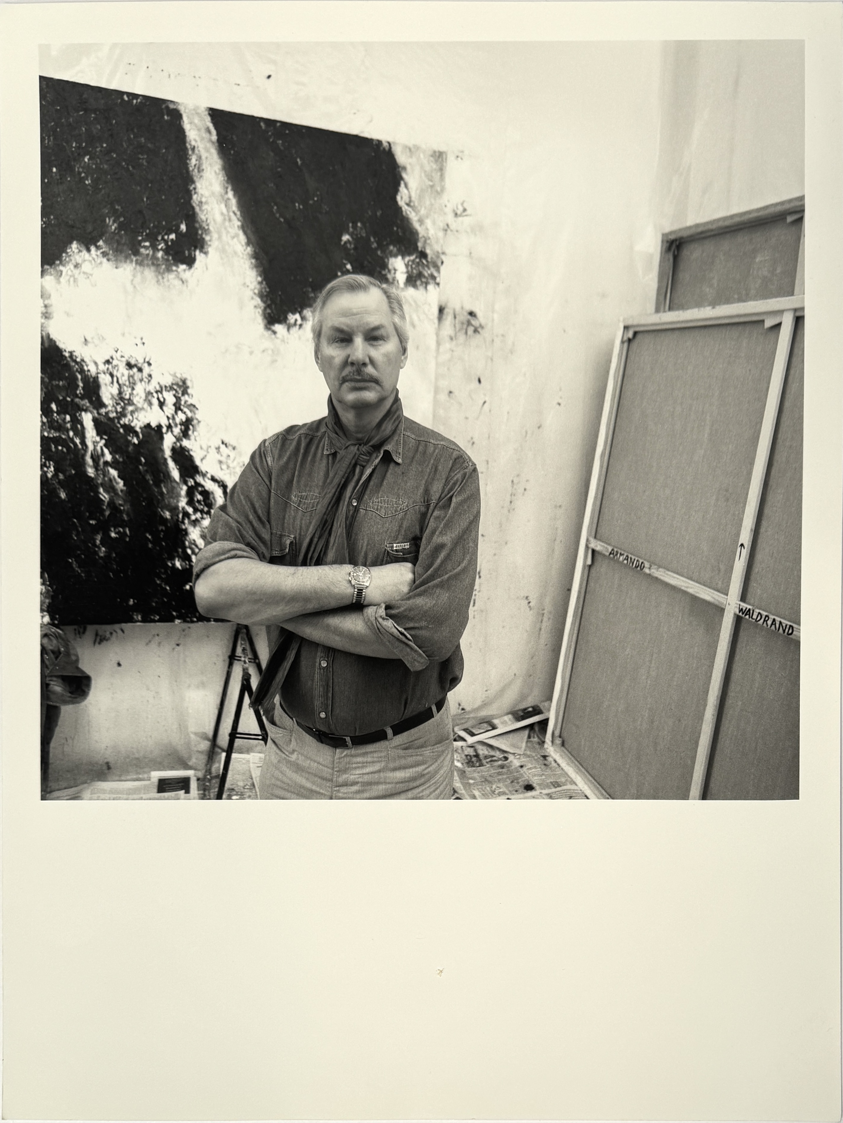 Zwart-wit foto in documentaire stijl van Armando (1929–2018), gemaakt door Peter Daalderop (1950) in 1988. Gelatinezilverdruk op fotopapier, op achterzijde met potlood gesigneerd, gedateerd en voorzien van het opschrift "Artist's Proof" en stempel van de fotograaf. Afgebeeld is Armando in zijn atelier te Berlijn met schilderijen op de achtergrond.