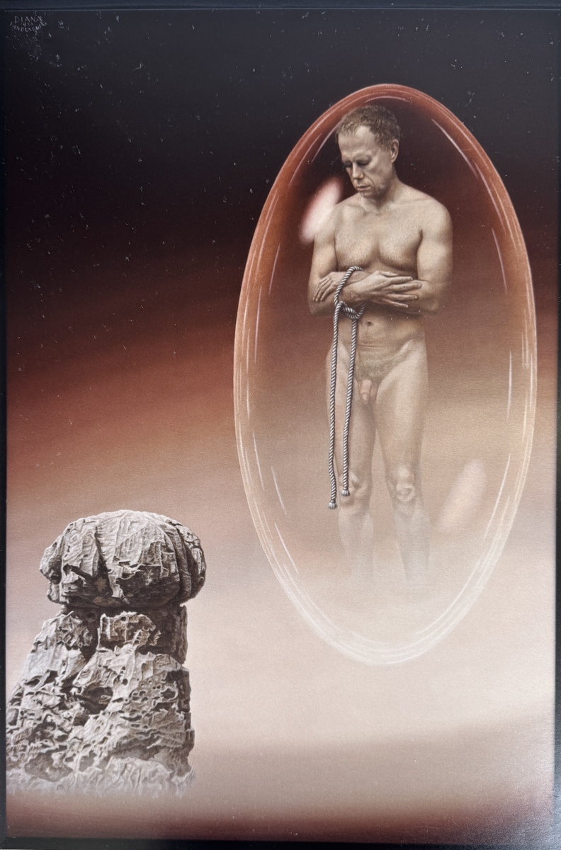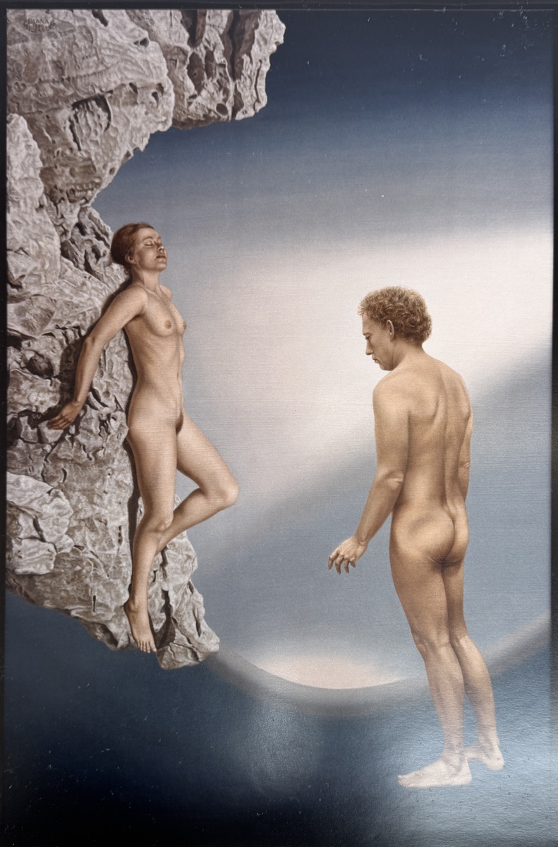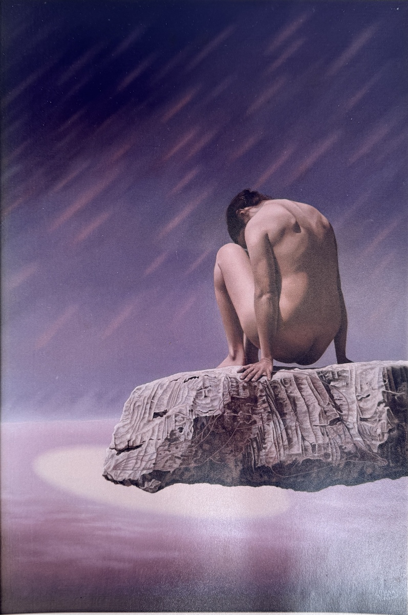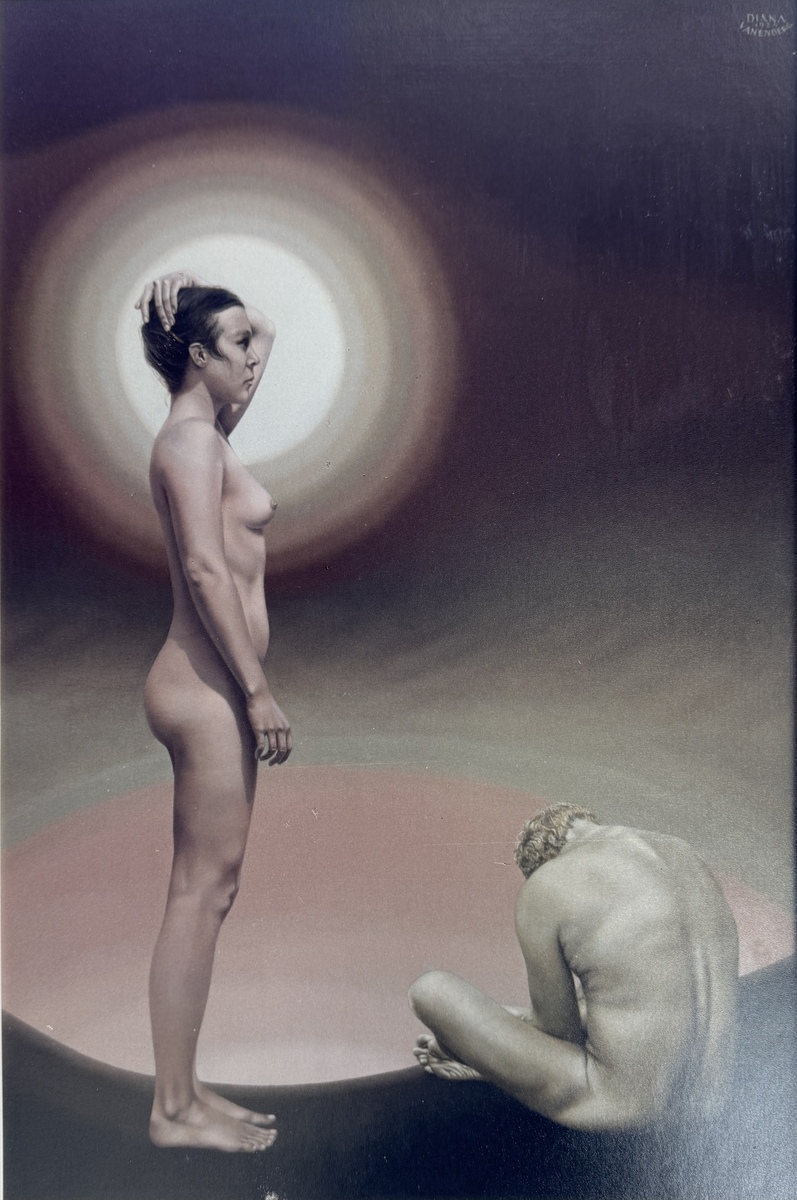 Set van 13 originele foto’s van schilderijen door Diana Vandenberg (1923–1997), circa 1986, in harmonica-achtige leporello-uitvoering. De afbeeldingen tonen surrealistisch-symbolistische composities met naakte figuren, rotsformaties en transparante vormen, vaak in meditatieve of introspectieve houdingen. Gemaakt als kunstdruk op papier. Bied eenvoudig mee, live of online. Registreer nu. |