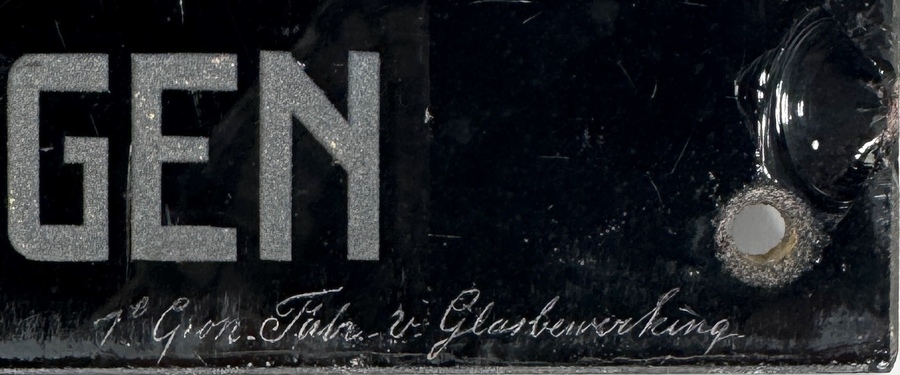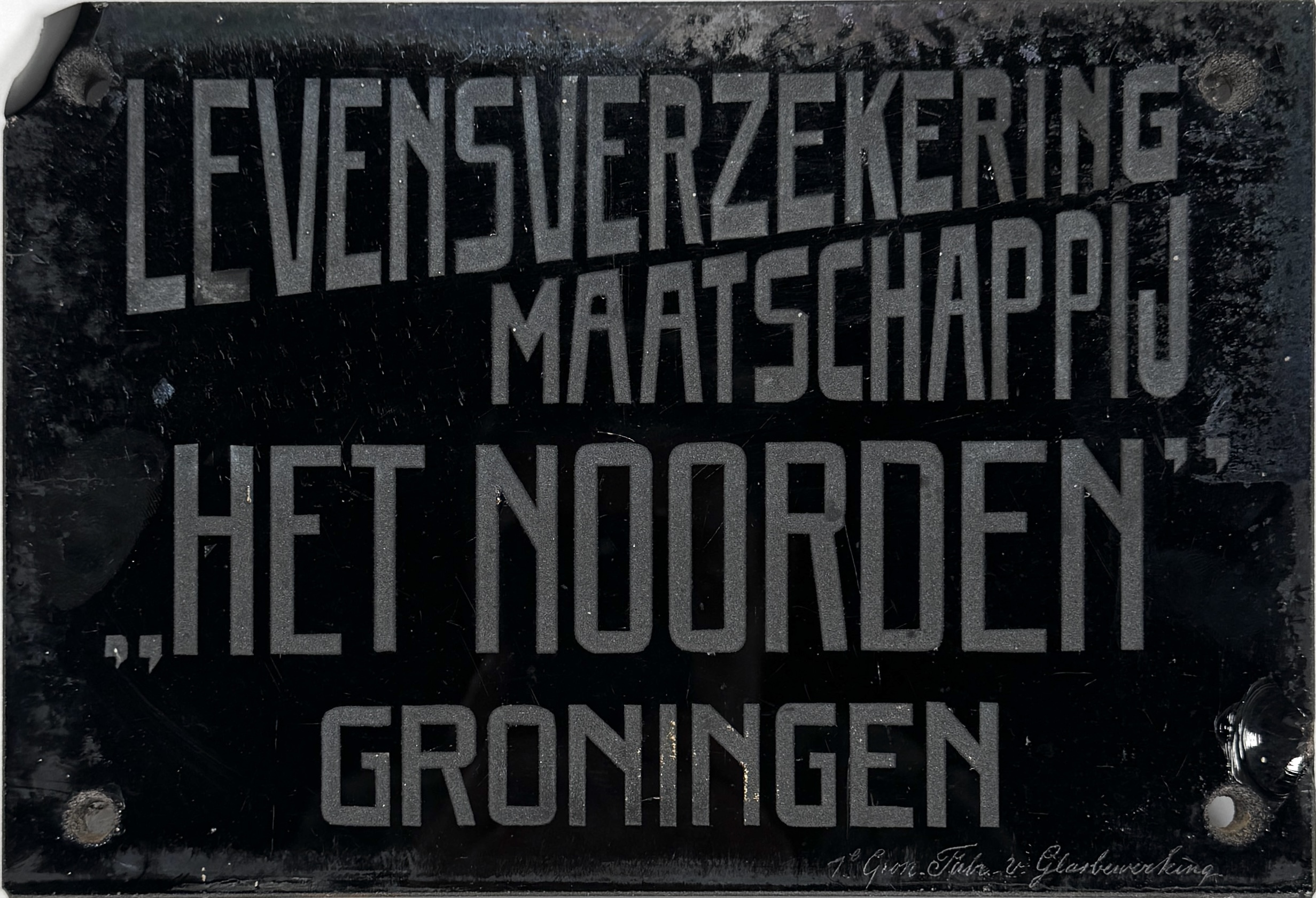 Geëmailleerd ijzeren gevelbord van de Eerste Groninger Fabriek voor Glasbewerking, daterend van begin 20e eeuw. Het bord adverteert de "LEVENSVERZEKERING MAATSCHAPPIJ ‘HET NOORDEN’ GRONINGEN" met een gestileerde, grijze tekst op een zwarte achtergrond. Zien voordat u biedt? Bezoek onze kijkdagen op 29, 30 en 31 augustus van 11:00 tot 17:00 uur! |