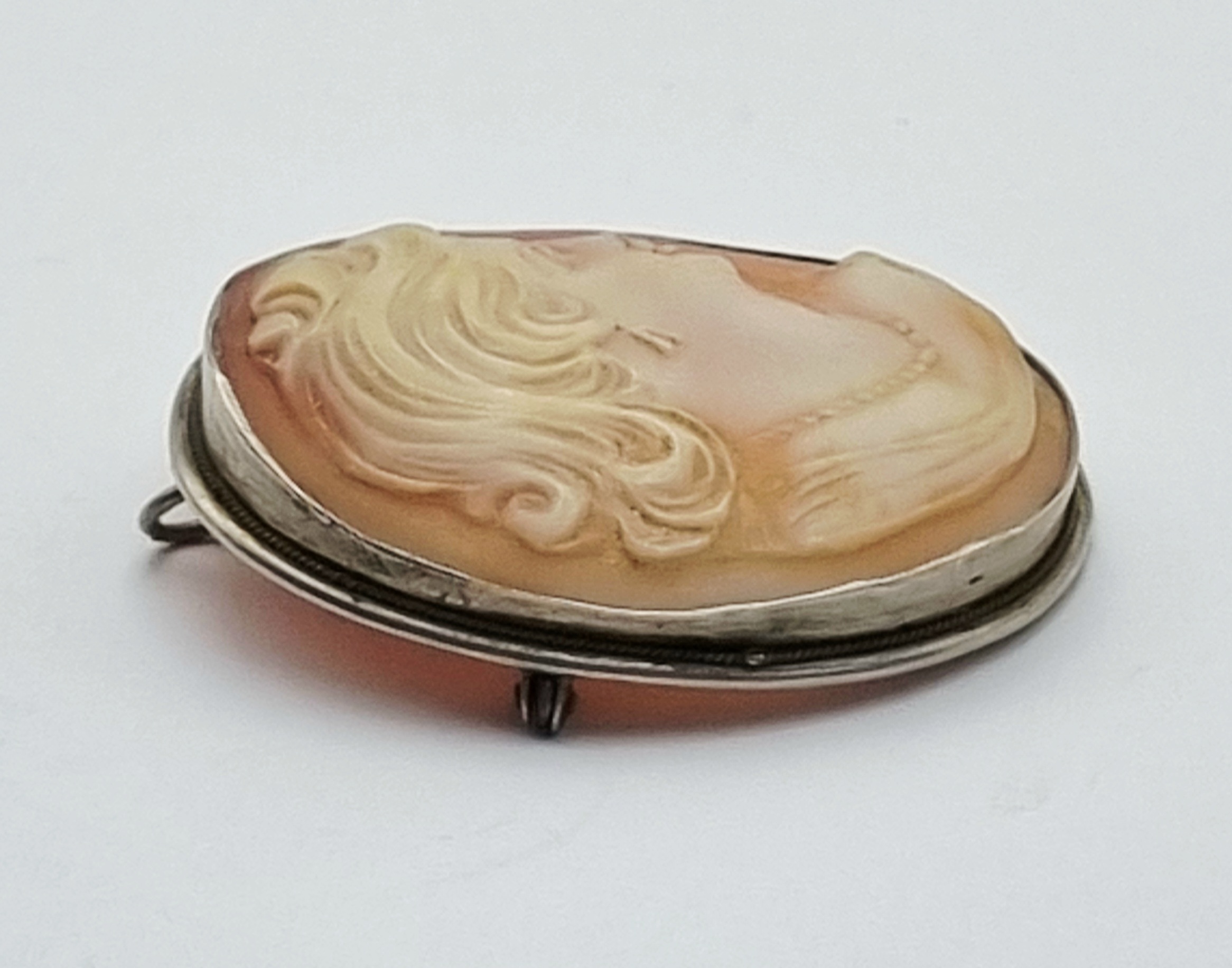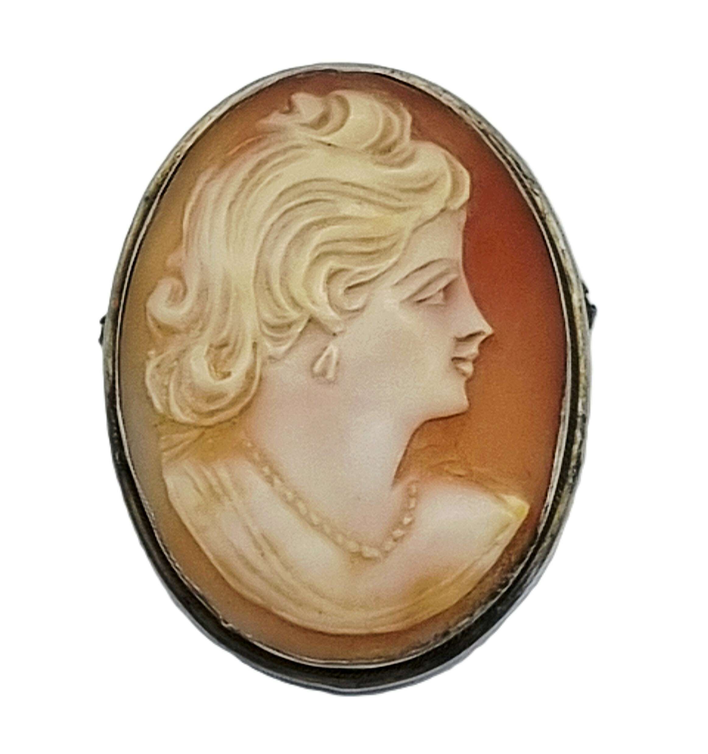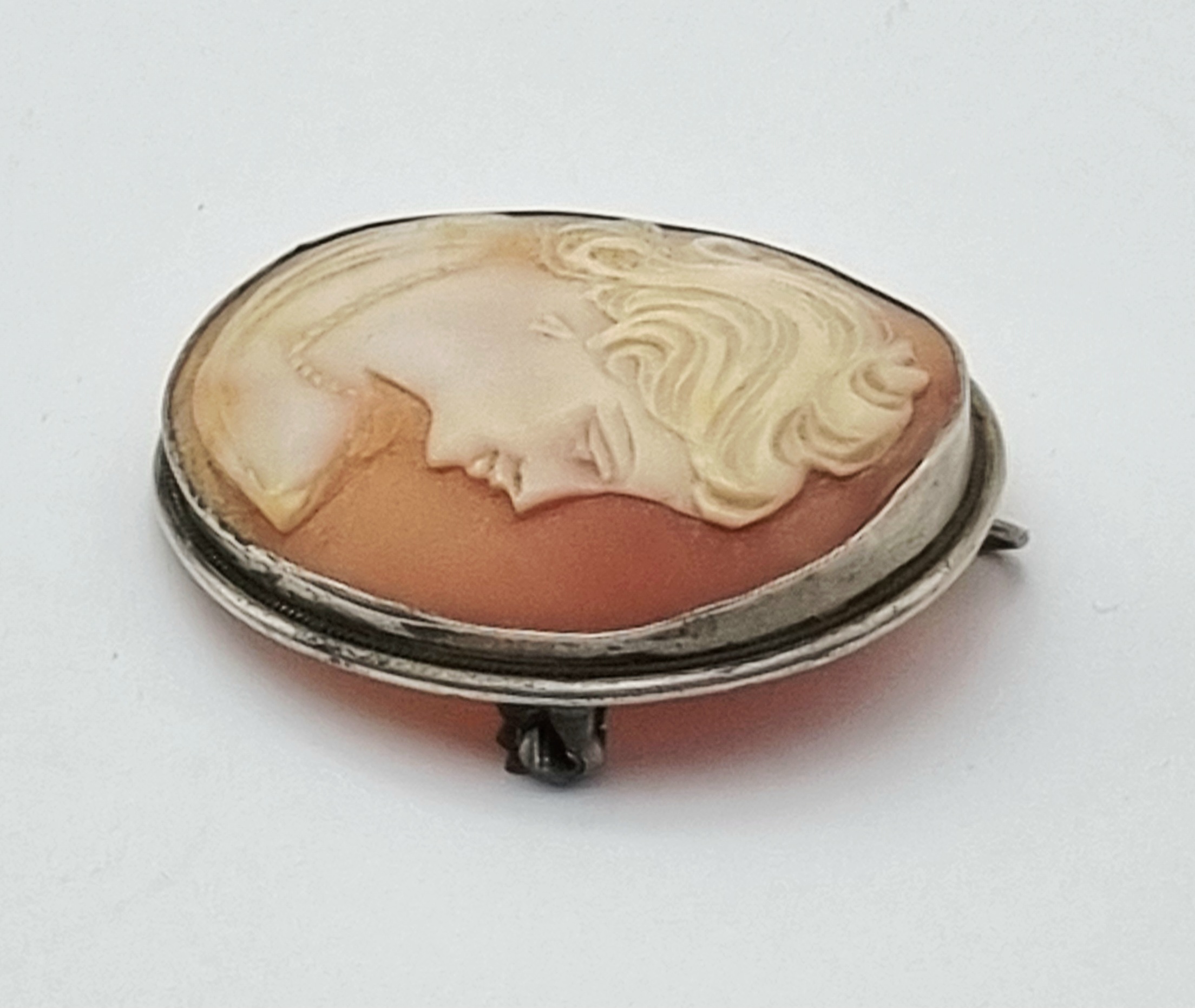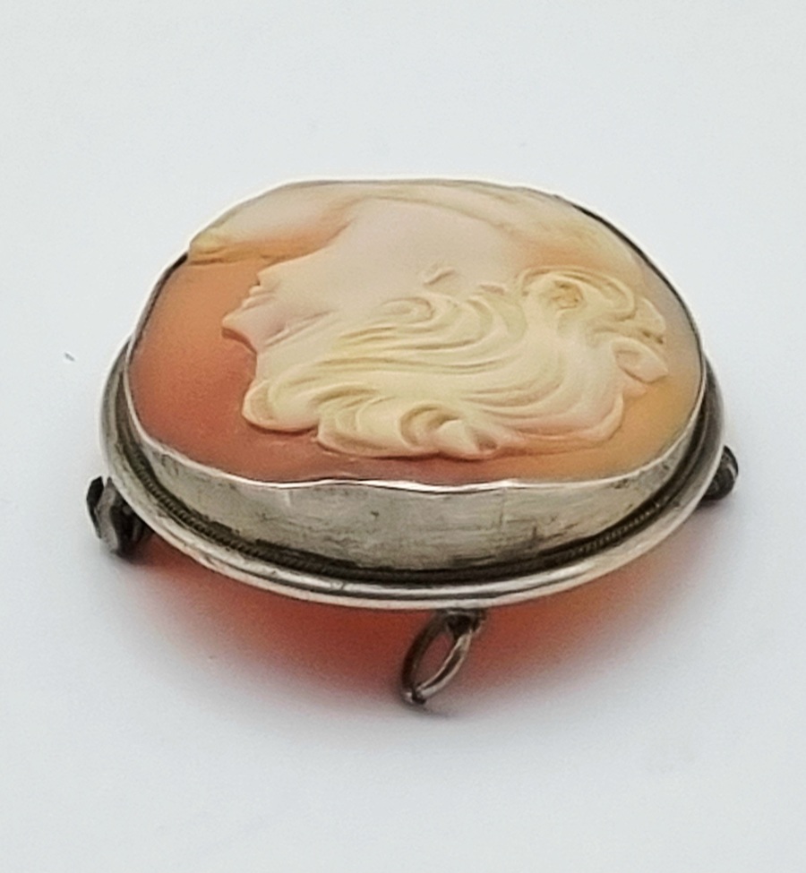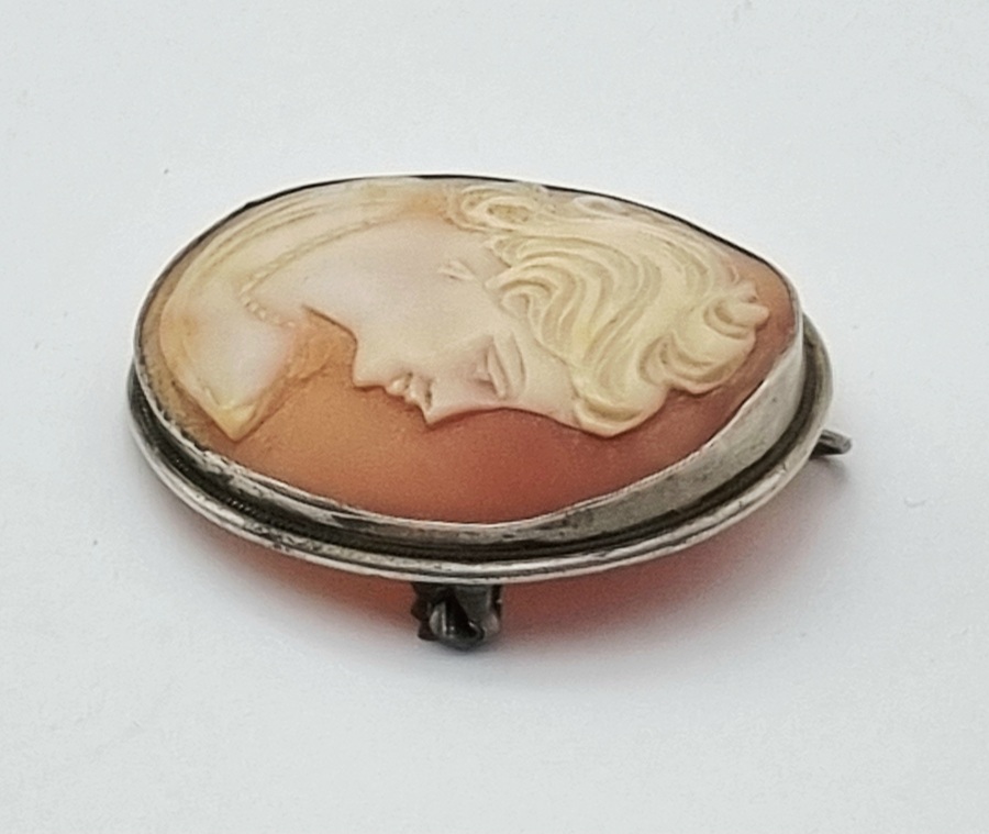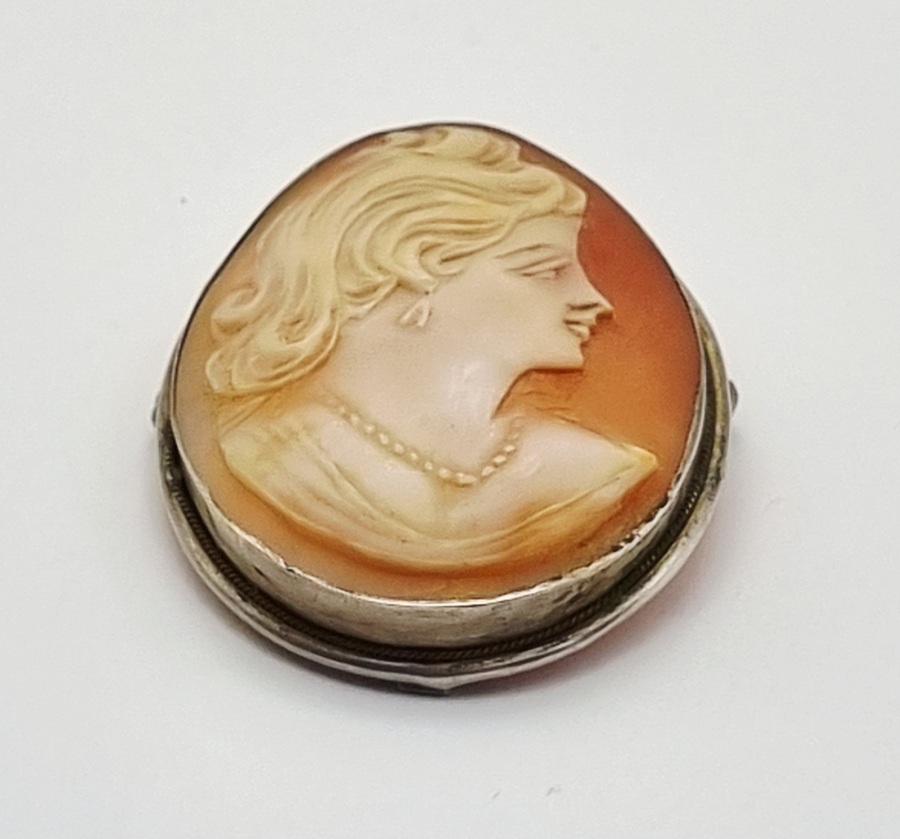 Zilveren broche met camee in de Victoriaanse stijl, daterend uit circa 1900. De broche is gemaakt van camee en zilver, gemerkt met 800. Camee handgesneden hoog reliëf met profielportret van vrouw, met opgestoken haar. Het zilveren frame is voorzien van een naald en sluiting. Deze hanger/broche zelf beoordelen? Je bent welkom op onze kijkdagen op 29, 30 en 31 augustus! |