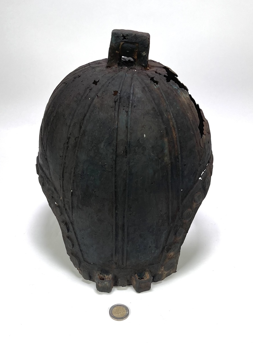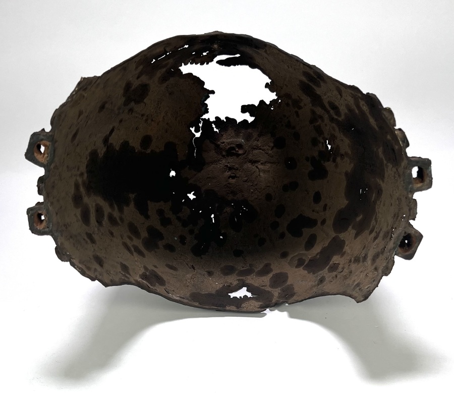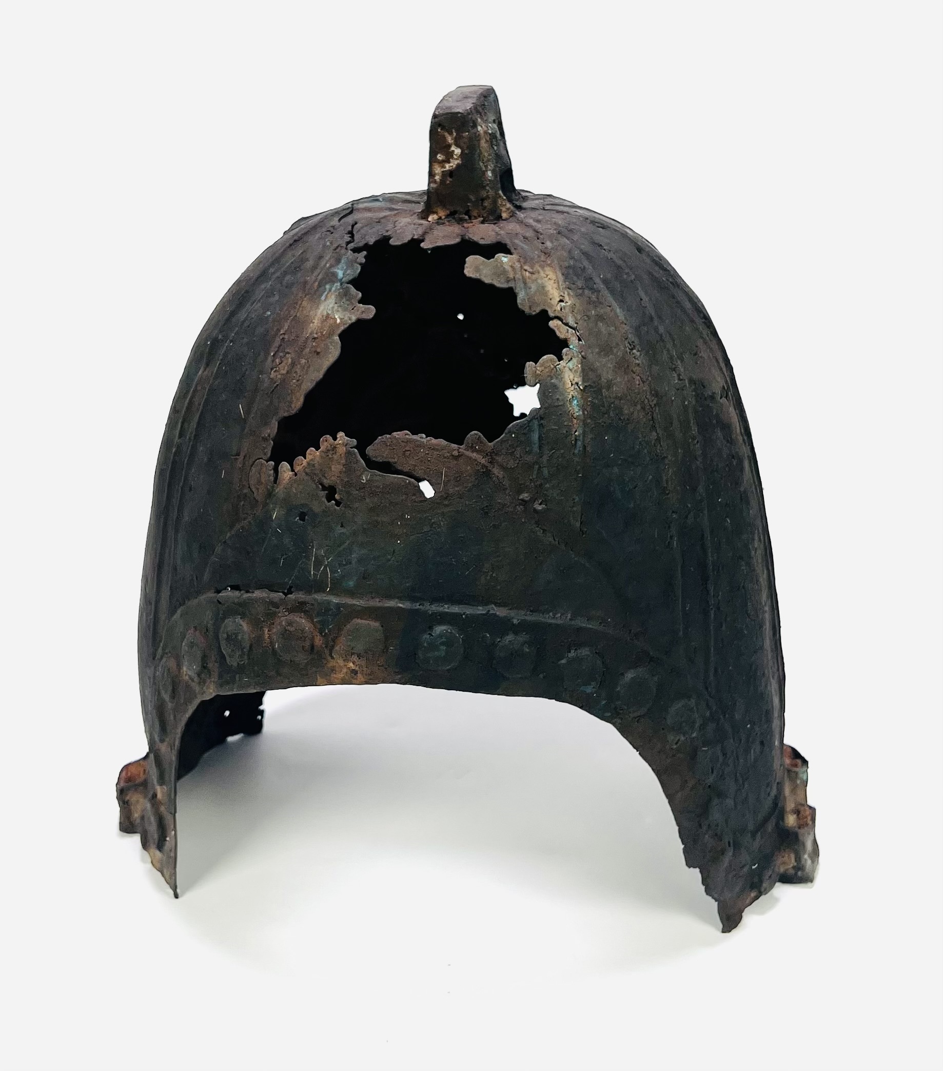 Messing gegoten replica helm met bolvormige kap, verticale ribverstevigingen en decoratieve rand met ronde knoppen. Opvallend door zwaar gecorrodeerde oppervlaktes met oxidatie en perforaties, 20e eeuw. Wil je direct deelnemen? Plaats vanaf 22 augustus alvast een schriftelijk bod via onze website! |