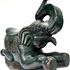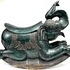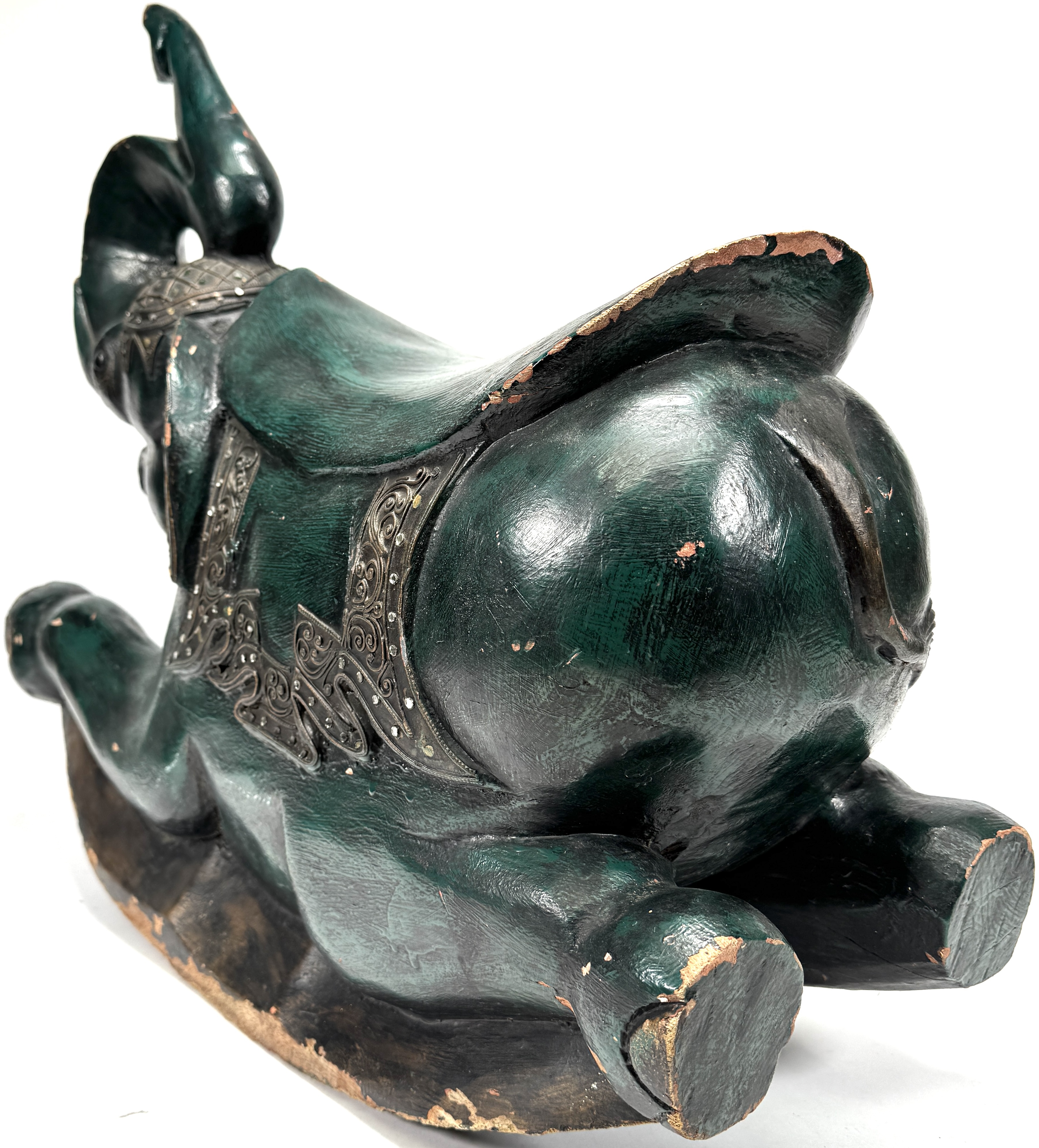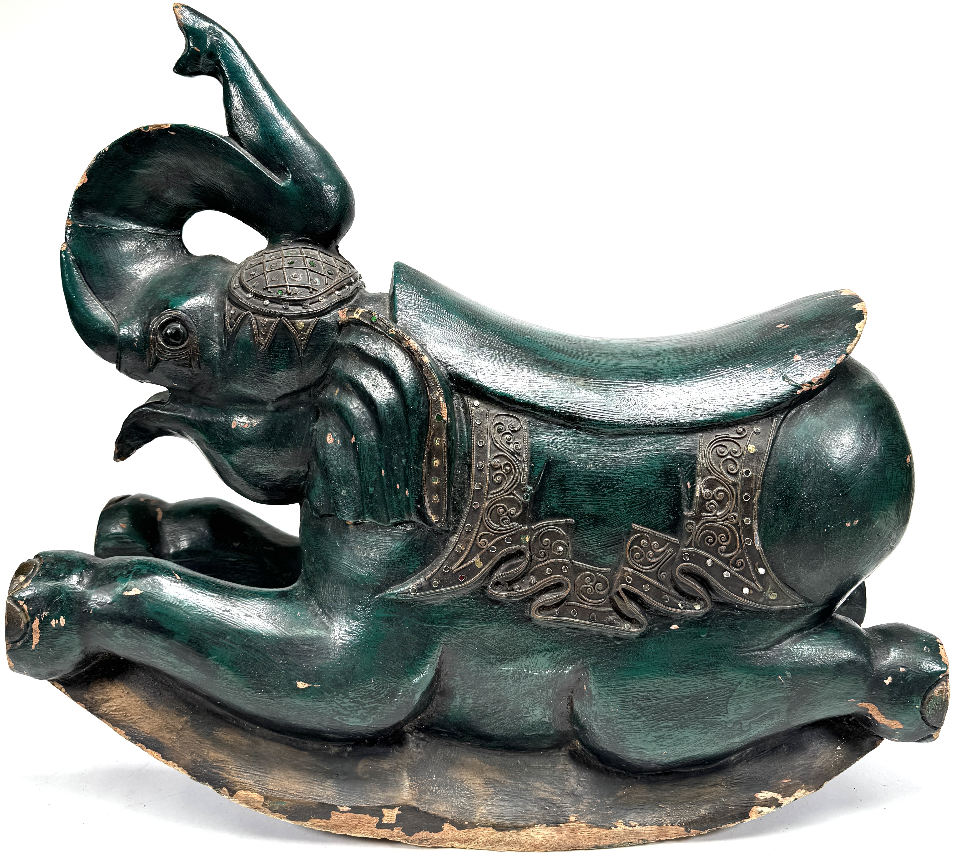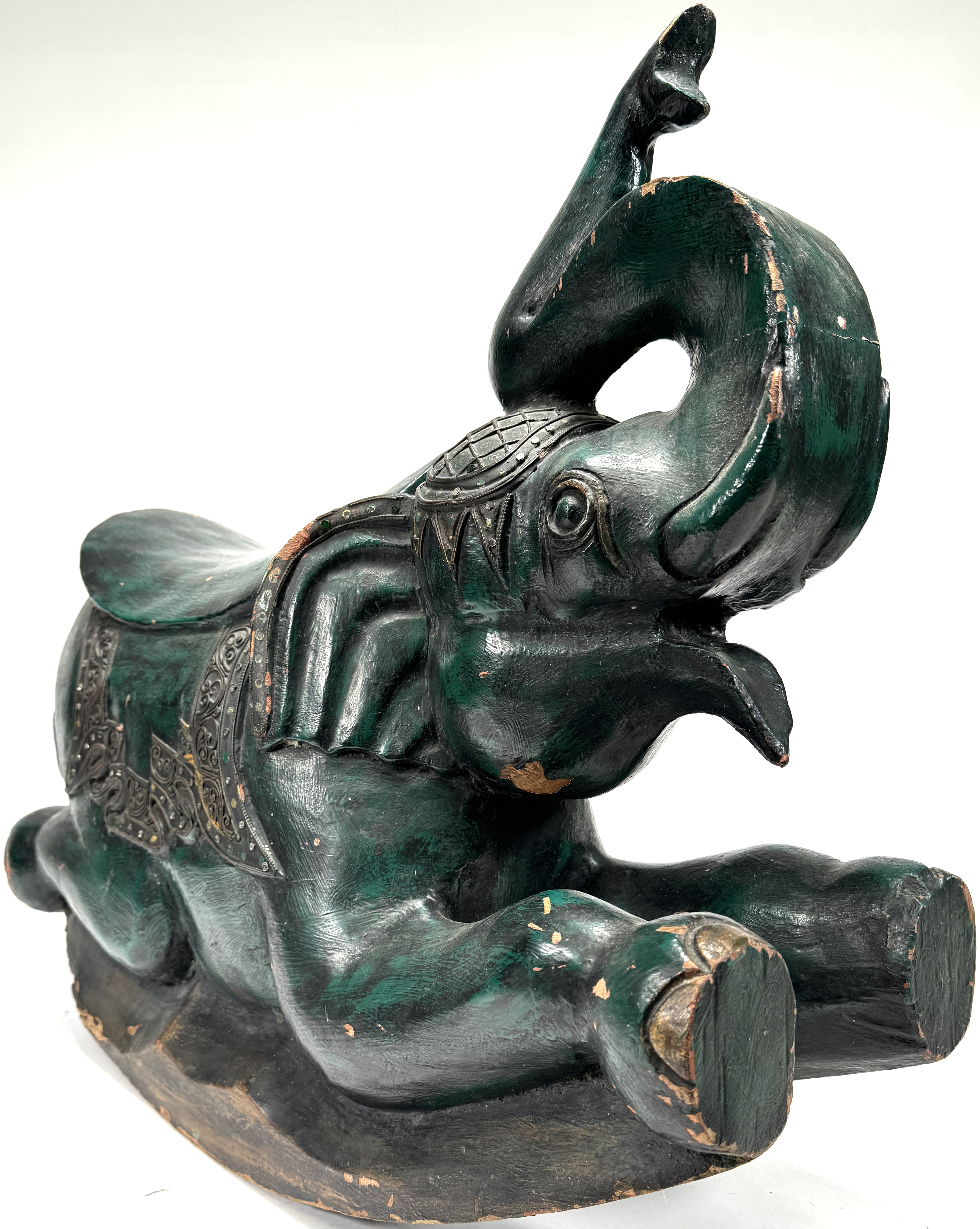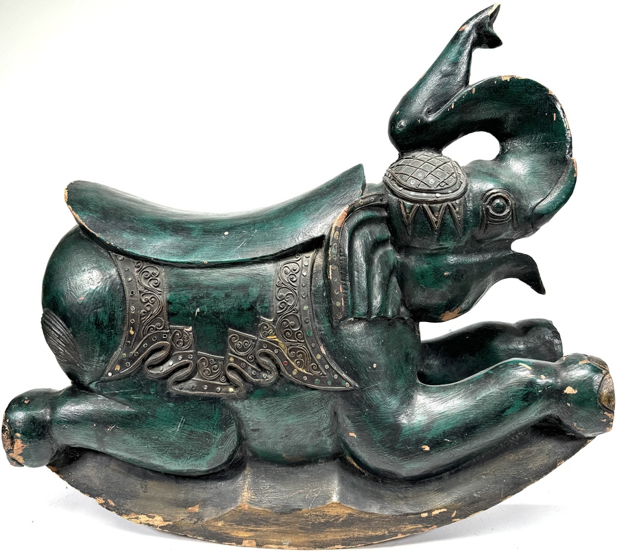 Houten schommelolifant in Aziatische stijl, midden 20e eeuw. Handgesneden uit hardhout met groen gekleurde polychromie, geprofileerde sledebasis en geponst metalen beslag met krulmotieven langs zadeldekens. Zadelvormige, licht concave zit, slurf omhoog en uitgesneden details aan kop en poten. Met ingelegde spijkers en ornamentbanden. Geïnteresseerd? Bezoek onze kijkdagen op 29, 30 of 31 augustus van 11:00 tot 17:00 uur! |