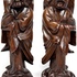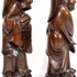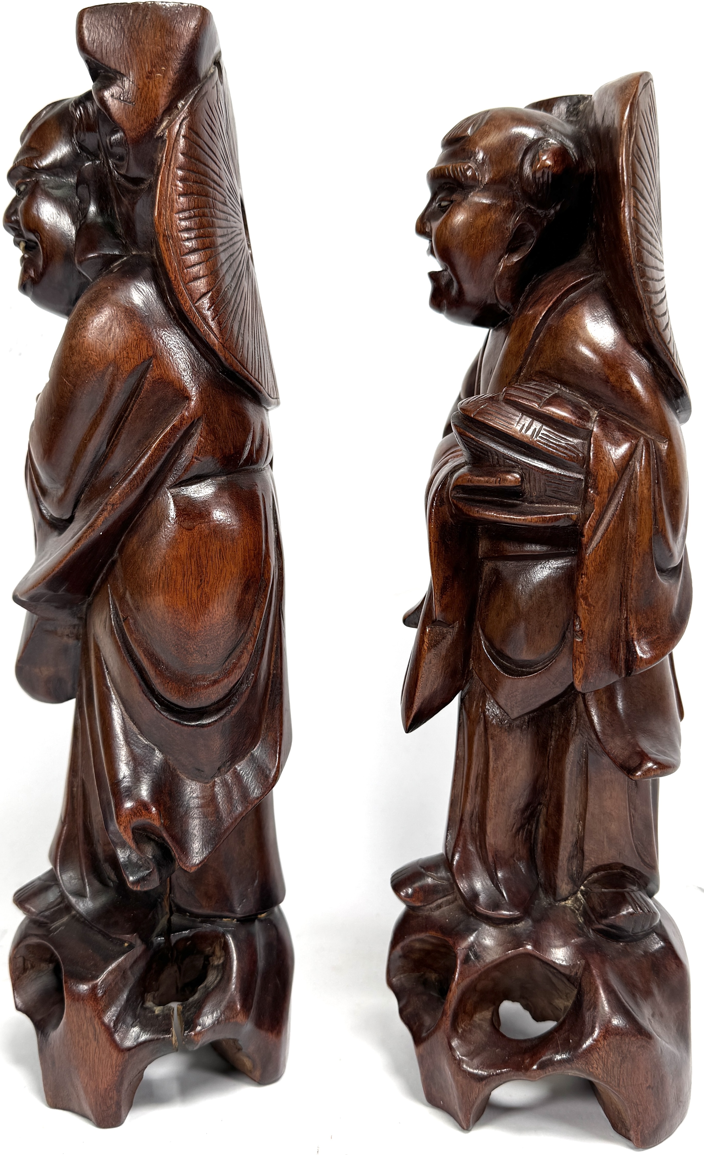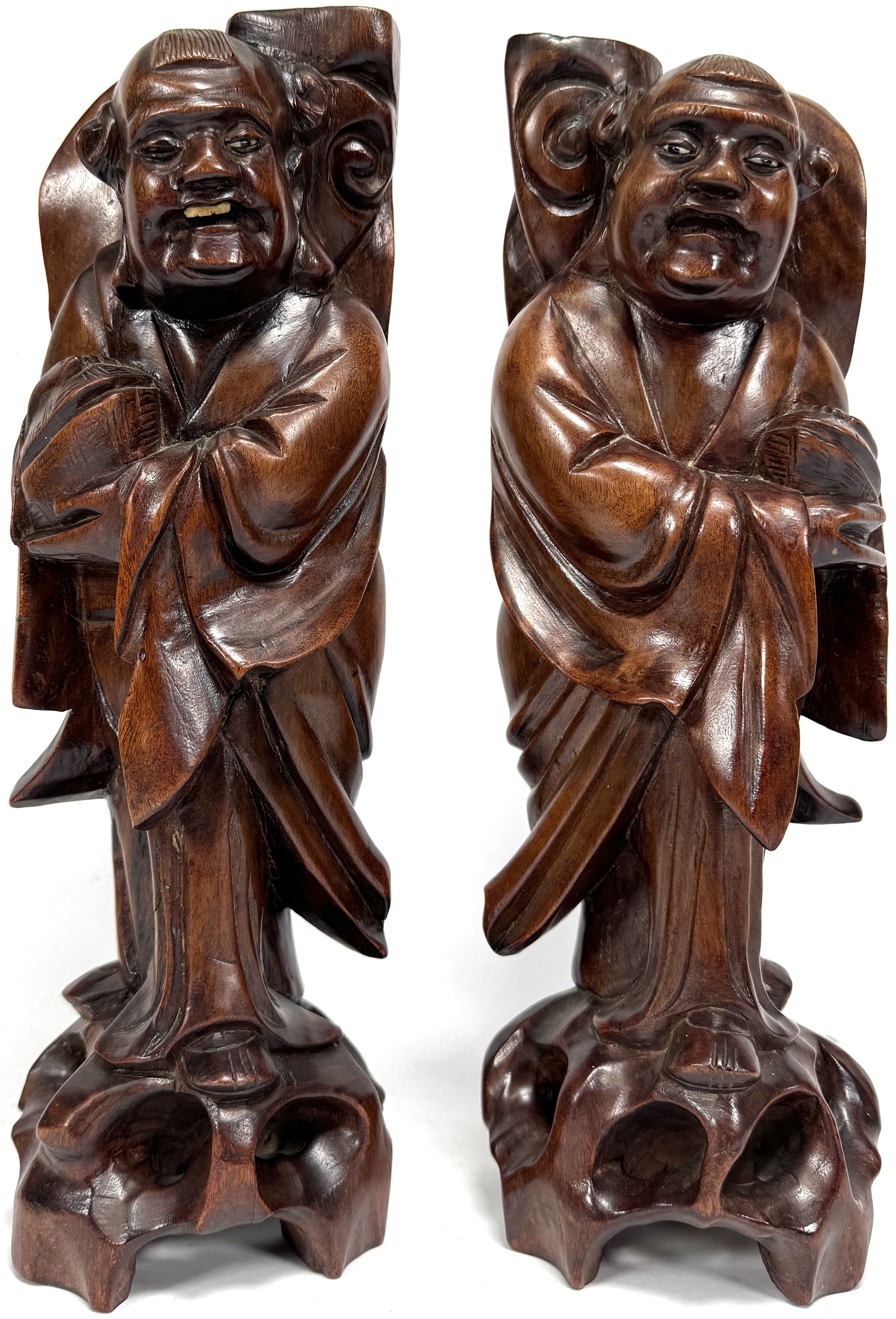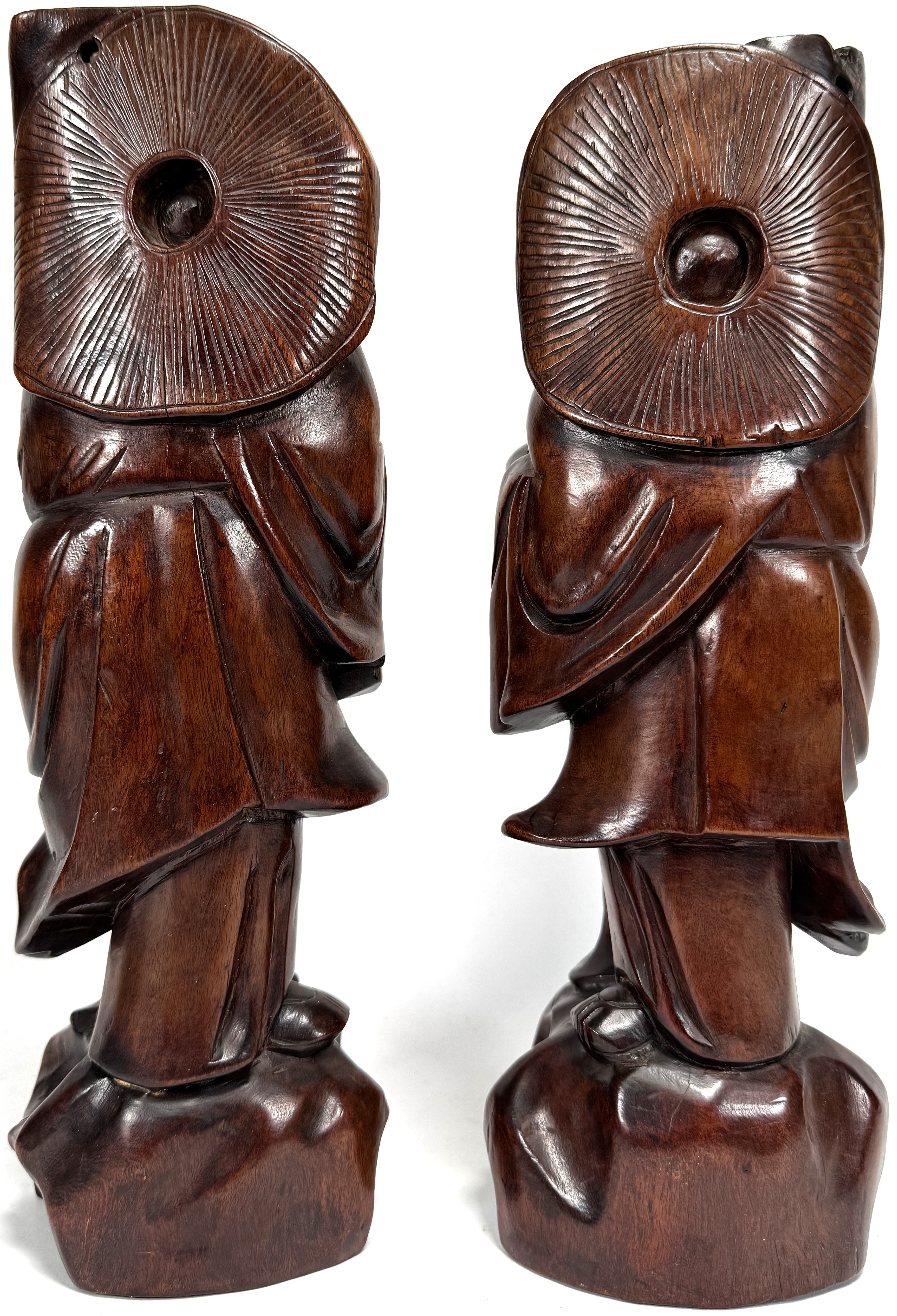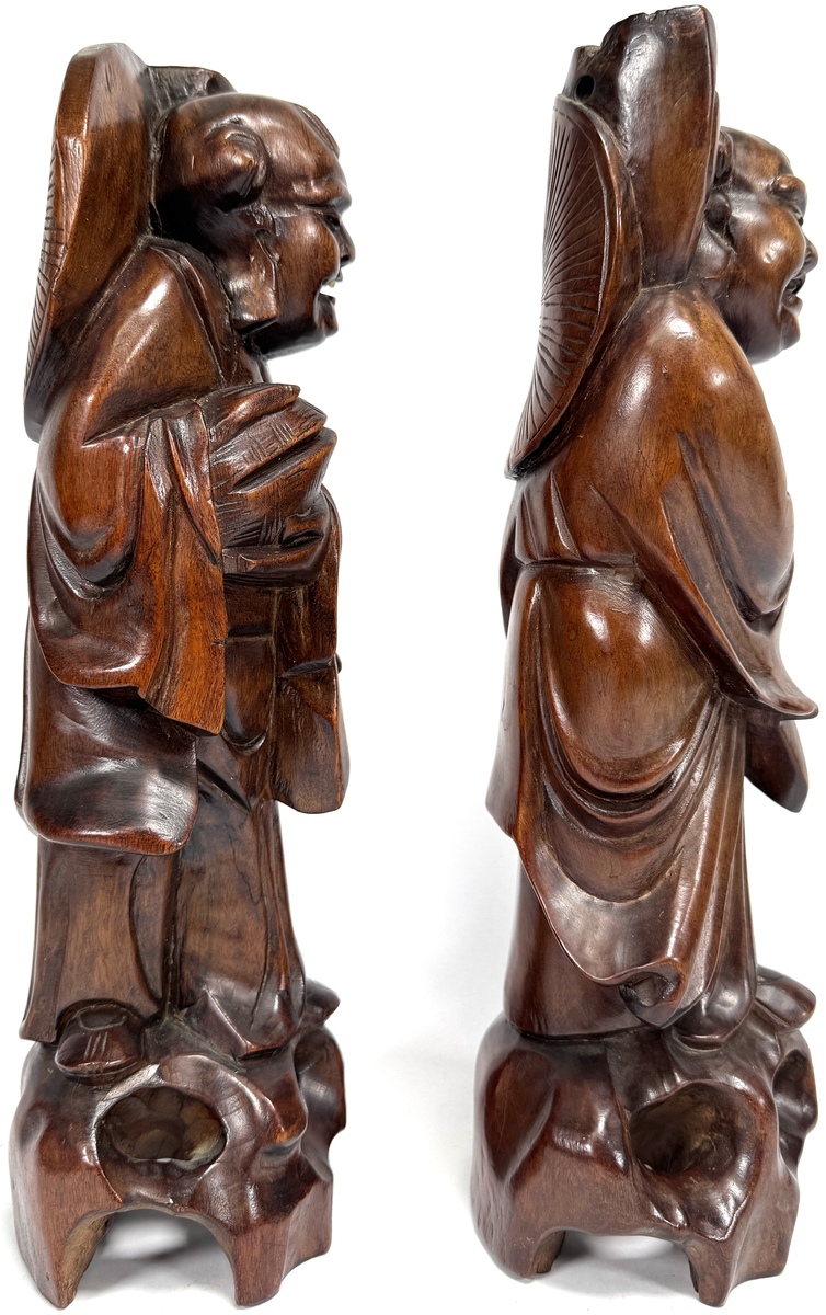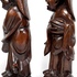 Twee donkere hardhouten beelden in Chinese volkskunst-stijl, midden 20e eeuw. Elk figuur in lang gewaad met grote radiaal gesneden strohoed op de rug en krulmotieven achter het hoofd; expressieve gelaatskenmerken, bij één een kleine beentandinleg. Klaar om te bieden? Registreer je nu en doe mee aan de veiling! |