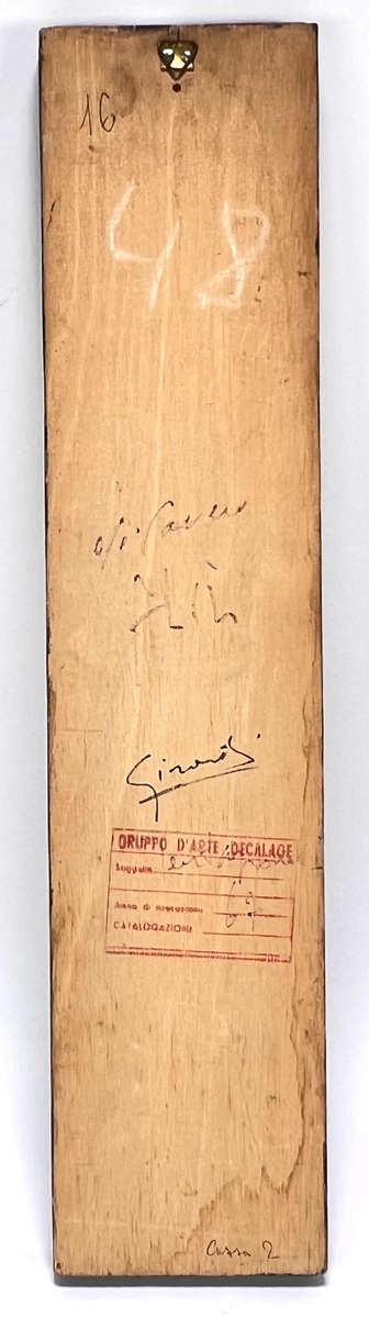 Schilderij van Gruppo d’Arte Decalage, uitgevoerd in mixed media op paneel in verticale compositie. Figuratieve voorstelling met twee gestileerde figuren in bosrijke omgeving, opgebouwd uit transparante verflagen in groen-, geel- en roesttonen. Rechtsonder gesigneerd en gedateerd 1967. Achterzijde met signatuur en stempel van Gruppo d’Arte Decalage, Italiaans kunstenaarscollectief actief in de jaren 60-70. Direct deelnemen? Plaats vanaf 22 augustus alvast een schriftelijk bod via onze website! |