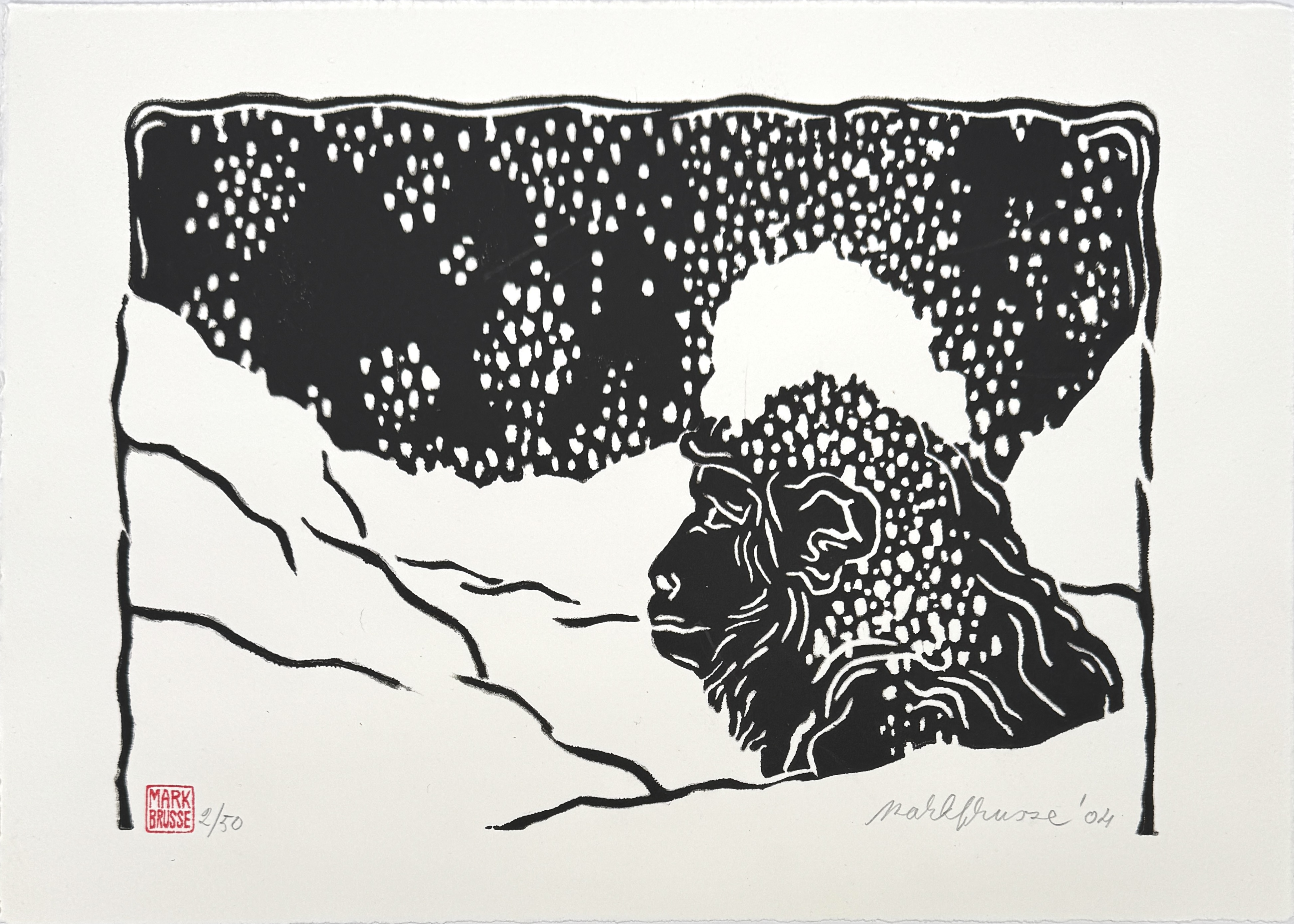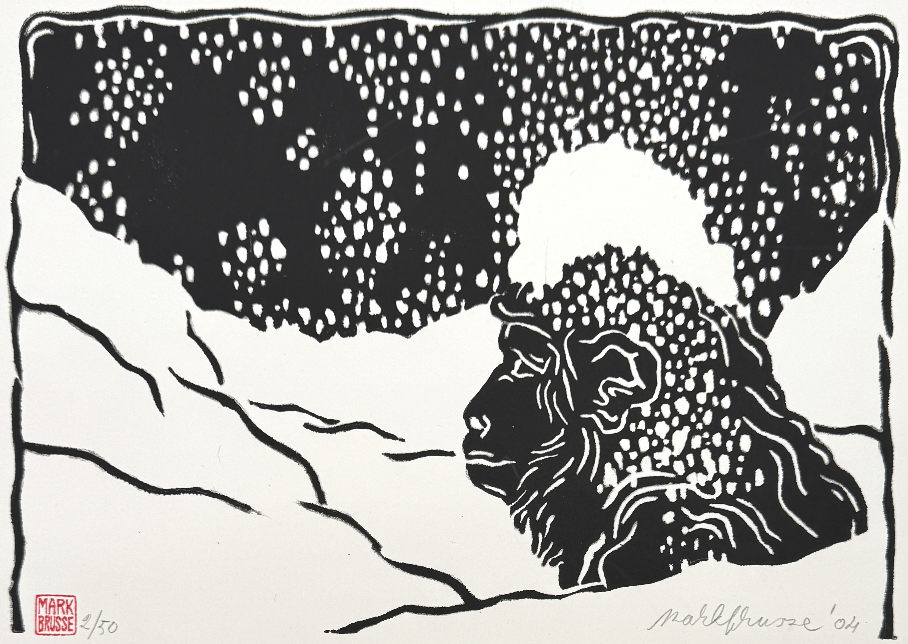 Linosnede Mark Brusse, makaak in sneeuw, 2004