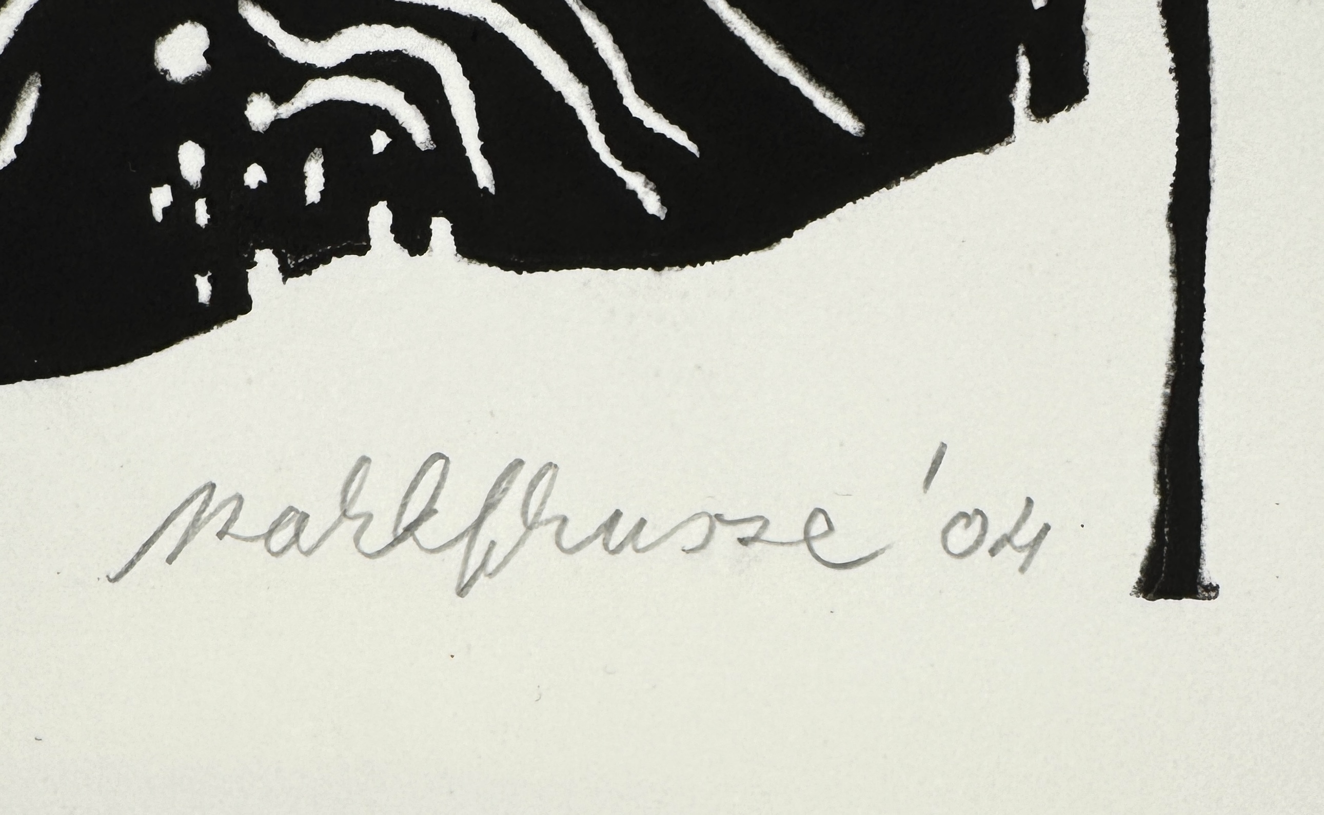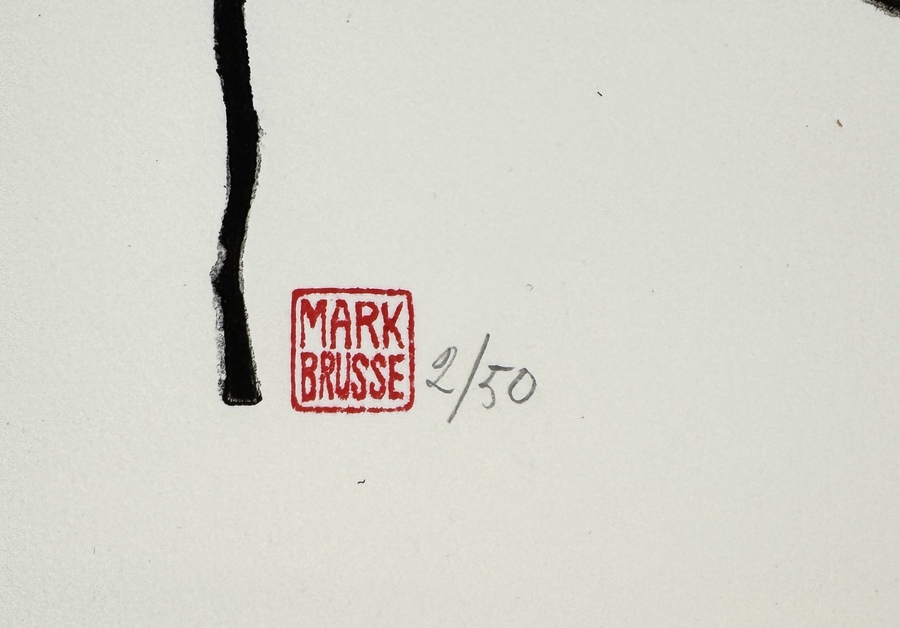 Linosnede door Mark Brusse (geboren 1937), uitgevoerd in zwart op wit papier. Afgebeeld is een makaak zittend in een besneeuwd landschap, opgebouwd uit vlakverdelingen en grafische patronen. Rechtsonder met potlood gesigneerd en gedateerd ‘04, linksonder met rood stempel Mark Brusse en met potlood genummerd oplagenummer 2/50. Schrijf u vandaag nog in voor de veiling en verzeker uw deelname! |