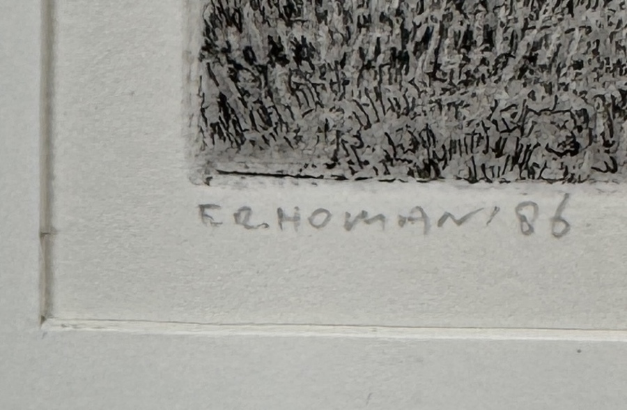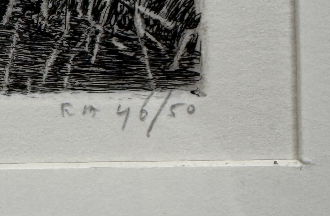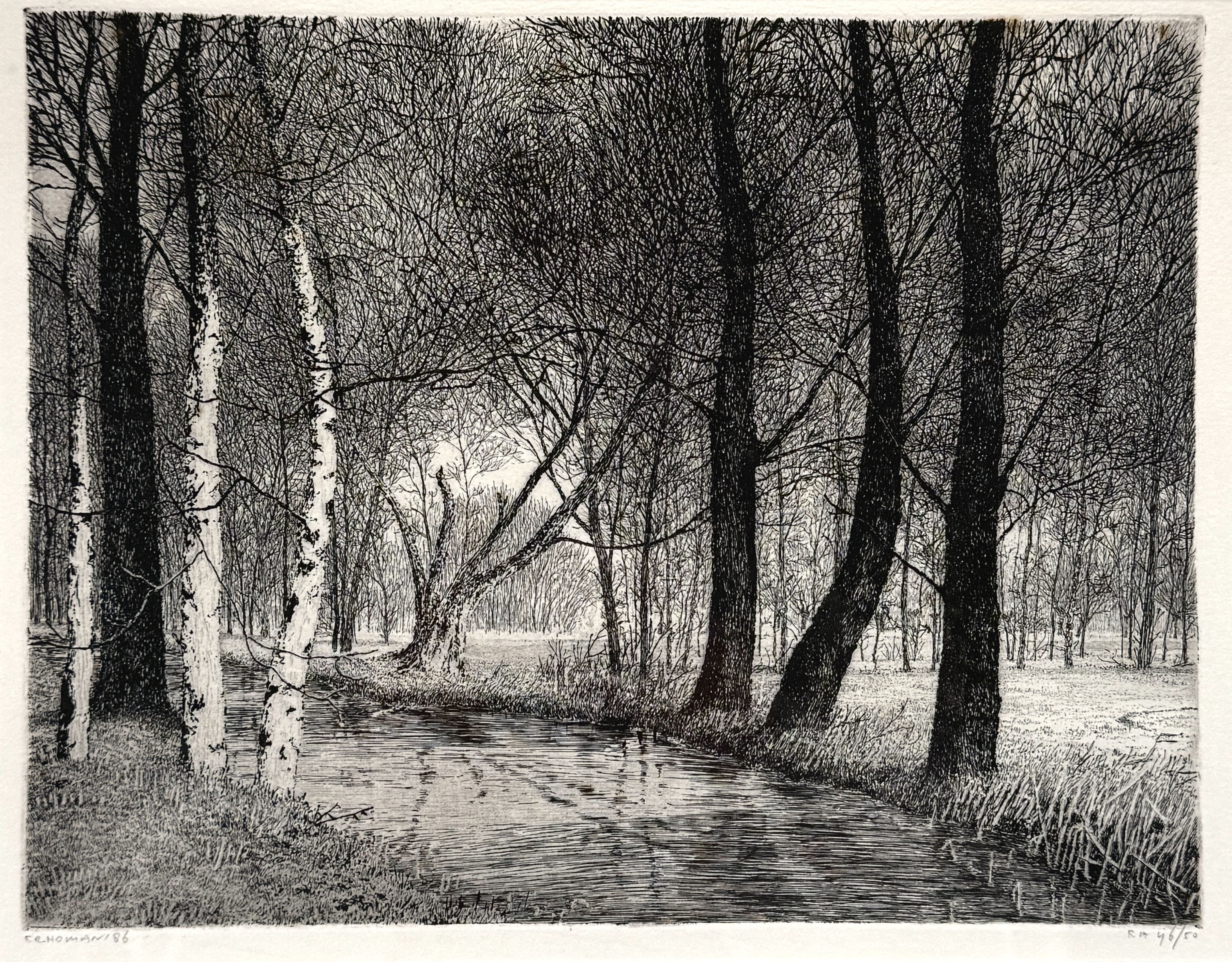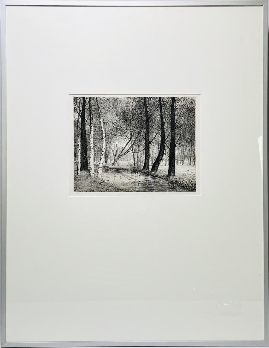 Ets van Reinder Homan (1950), gedateerd 1986, oplagenummer 46/50. Voorstelling van bomen langs een waterpartij, uitgevoerd in verfijnde lijnets op papier. Gesigneerd en genummerd in potlood, ingelijst in metalen lijst met passe-partout. Geïnteresseerd? Bezoek onze kijkdagen voor een persoonlijke bezichtiging! |