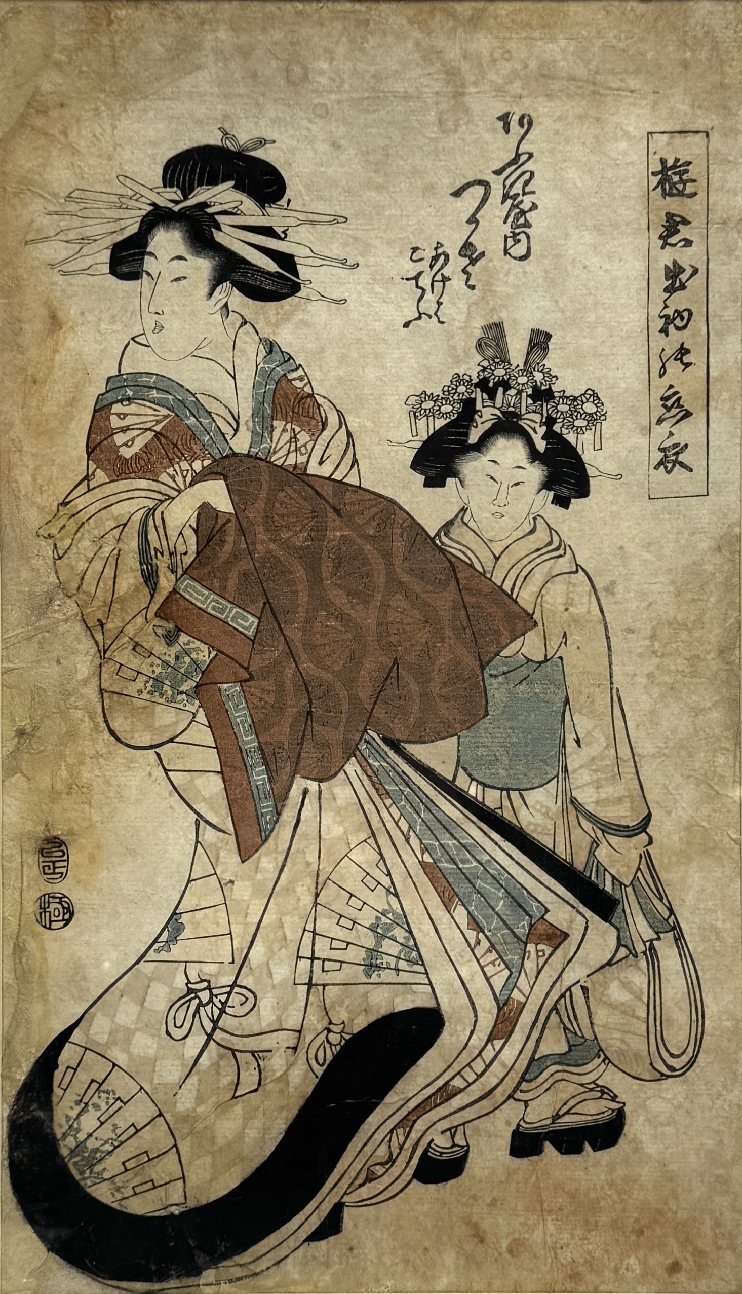 Houtsnede Kitao Shigemasa, geisha met metgezel, Japan ca. 1790