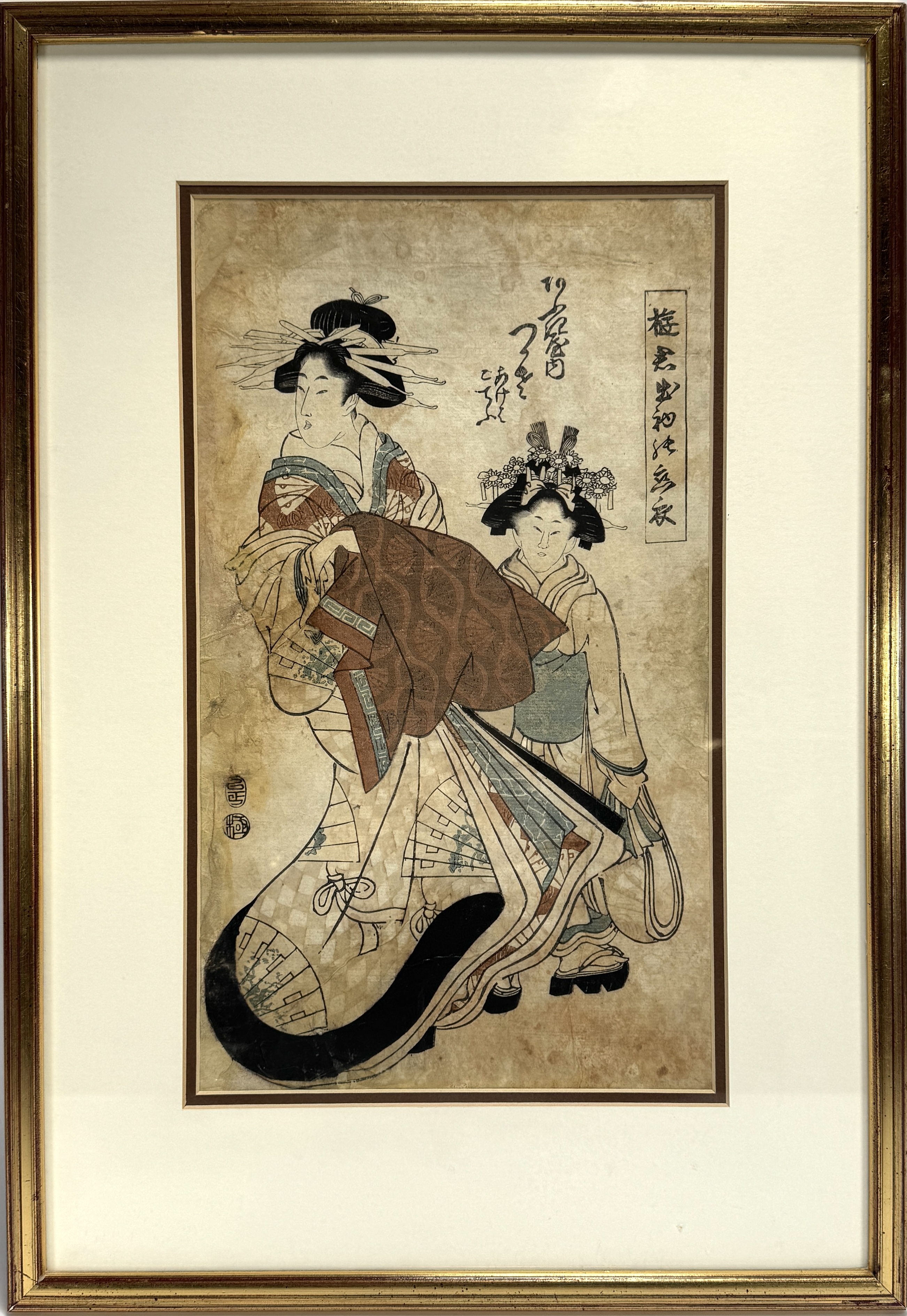 Kleurenhoutsnede van Kitao Shigemasa (1739–1820) in ukiyo-e stijl, vervaardigd in de late 18e eeuw. Het werk toont een geisha en haar jonge metgezel in rijk versierde kimono’s met waaiers en florale motieven. Uitgevoerd in traditionele Japanse meerkleurige houtblokdruk op papier, met kalligrafie in zwarte inkt en linksonder gesigneerd met Japanse karakters. Zelf beoordelen? U bent welkom op onze kijkdagen op 29, 30 en 31 augustus! |