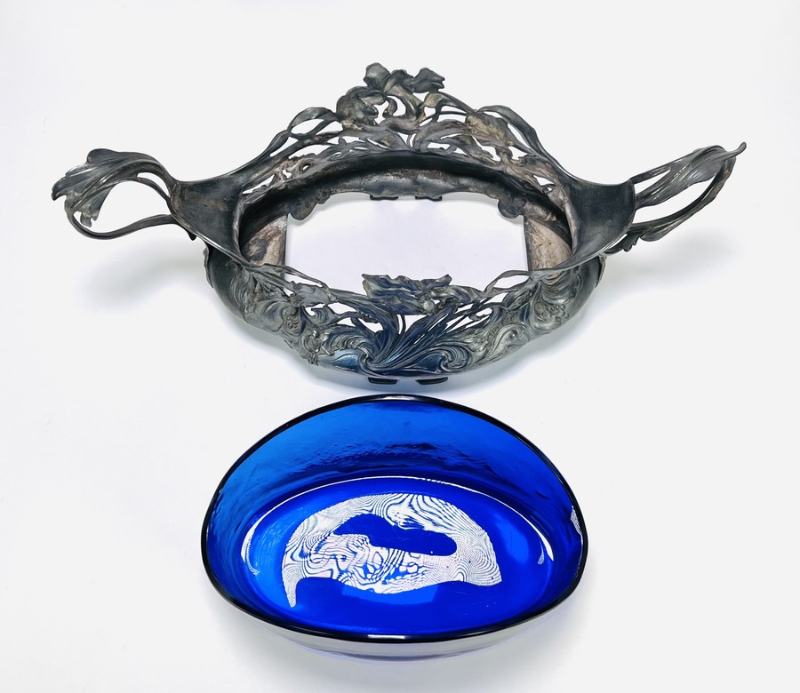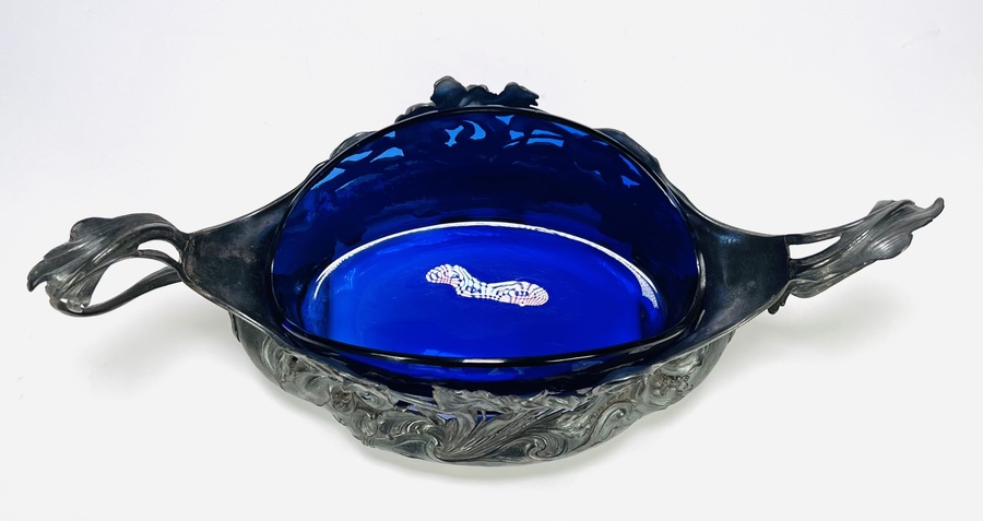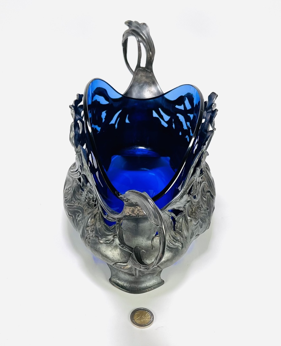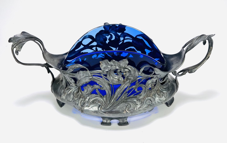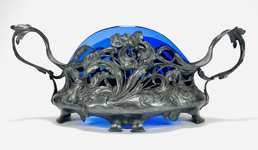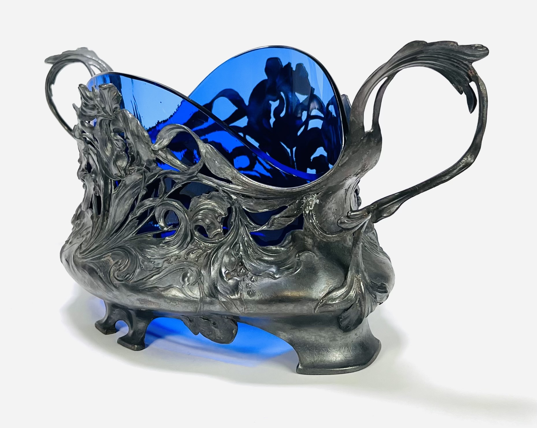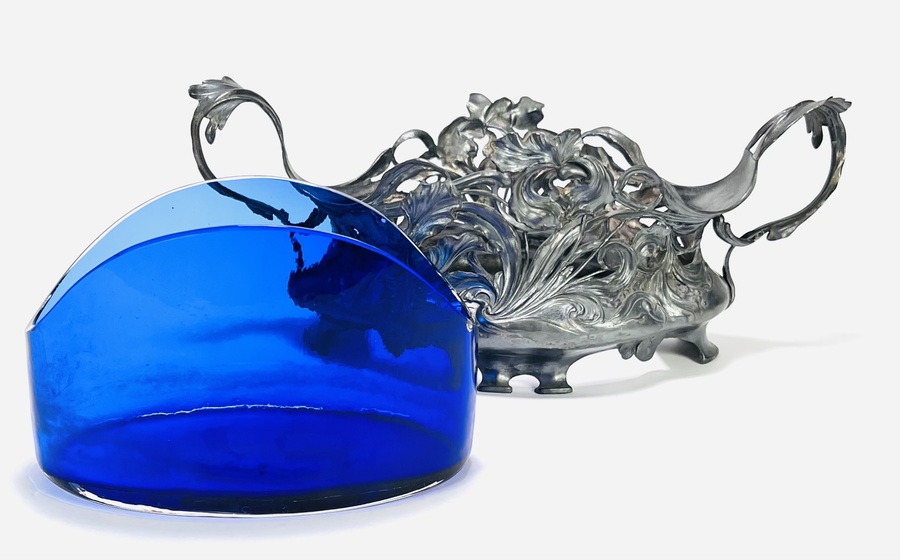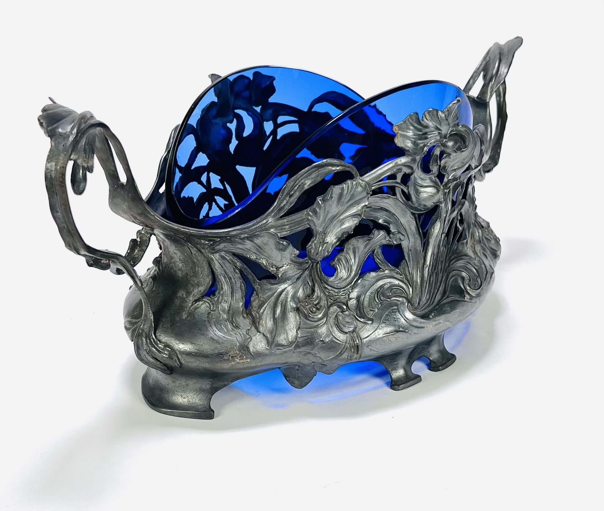 Jardinière uit de Art Nouveau periode, circa 1900. Tinnen opengewerkte montuur met florale iris-motieven en twee handgrepen; uitneembare kobaltblauwe glazen binnenbak. Gegoten met gepatineerd oppervlak. Ovaal model met sierlijk opengewerkt front, asymmetrische voetplint en golvende lijnen rondom. Met vier korte poten en opstaande randen die de inzetbak omsluiten. Kom langs tijdens de kijkdagen (29 t/m 31 augustus) en ontdek deze jardinière zelf! |