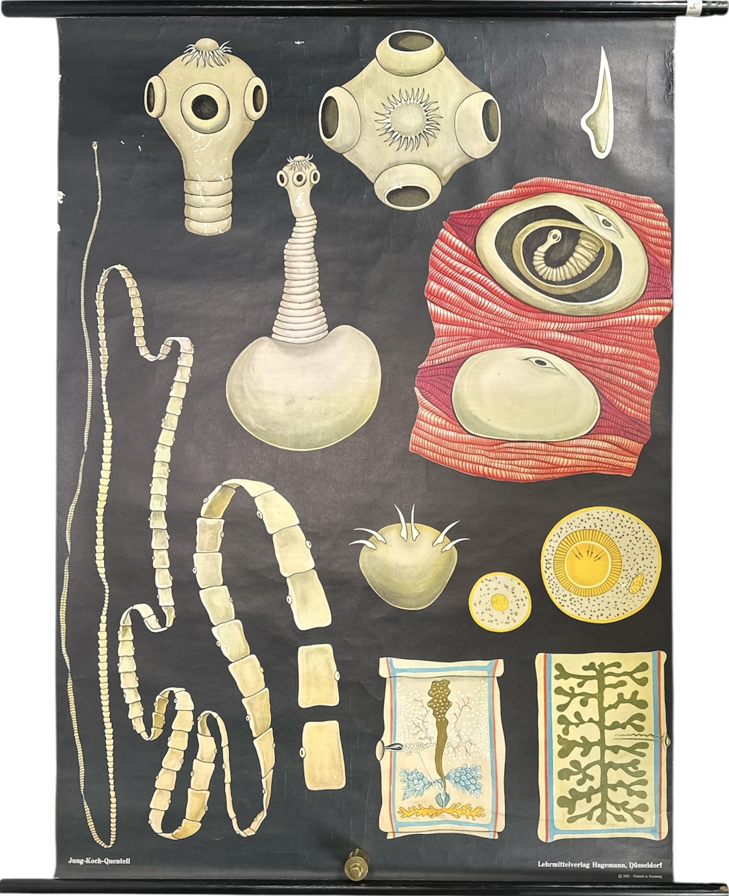 Schoolwandkaart Jung-Koch-Quentell, datering midden 20e eeuw. Papier op linnen, offsetdruk met lithografische details in wetenschappelijk-didactische stijl. Uitgegeven door Lehrmittelverlag Hagemann, Düsseldorf, toont de anatomie en cyclus van de lintworm (Taenia), inclusief kopstructuren, segmenten en ontwikkelingsstadia. Gemaakt voor educatieve doeleinden in klaslokalen of biologielessen. Zien voordat u biedt? Bezoek onze kijkdagen op 29, 30 en 31 augustus van 11:00 tot 17:00 uur! |