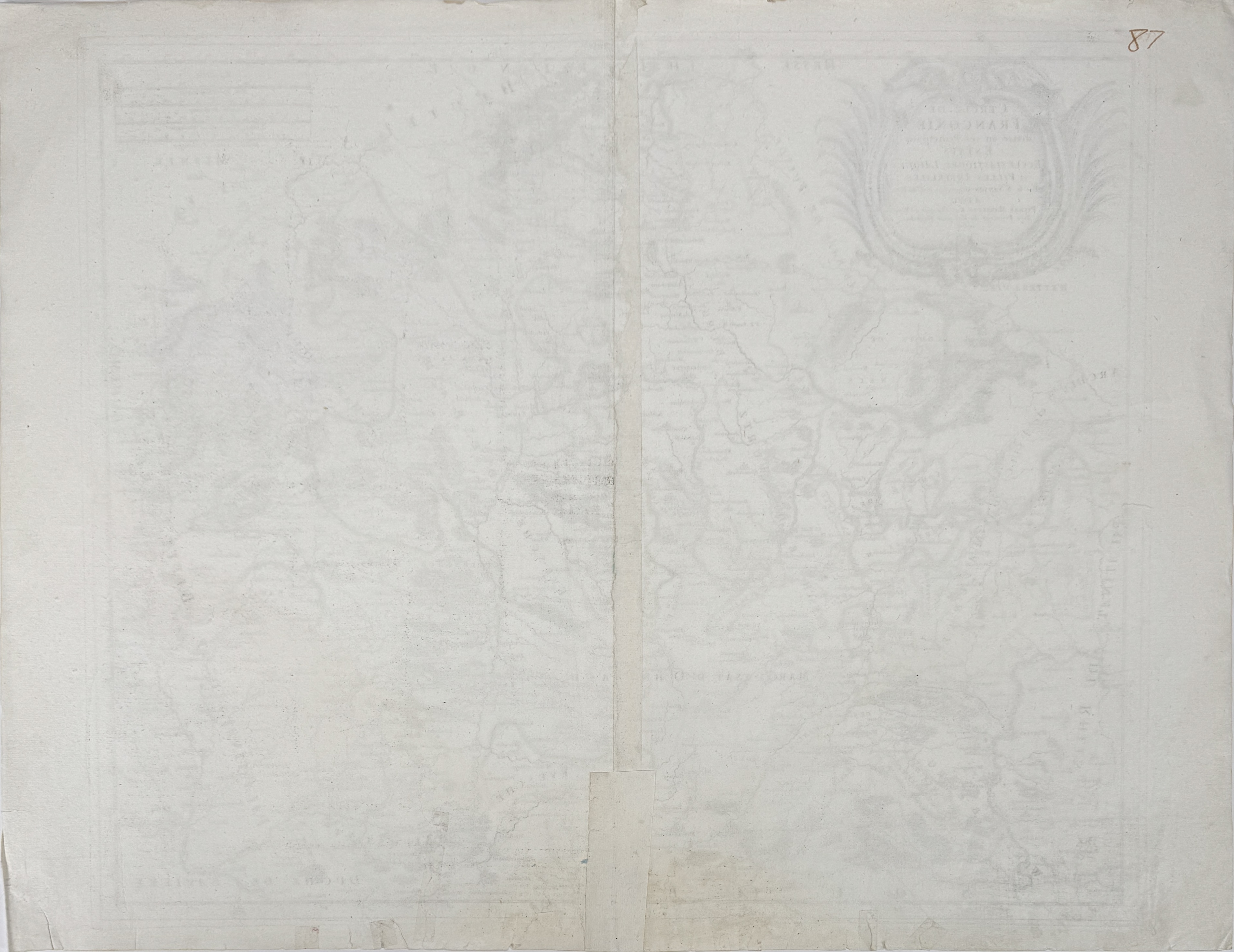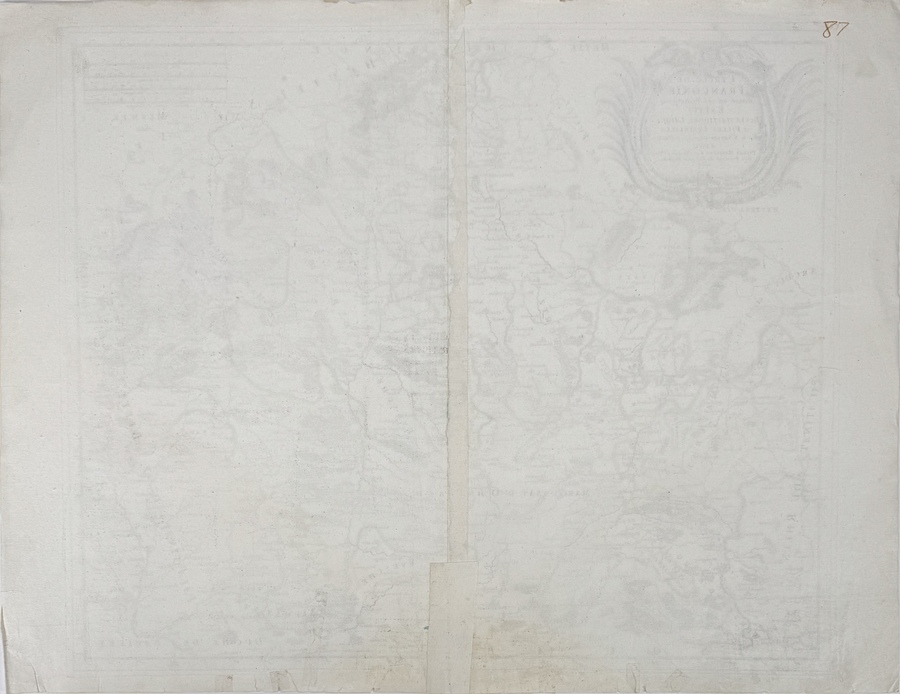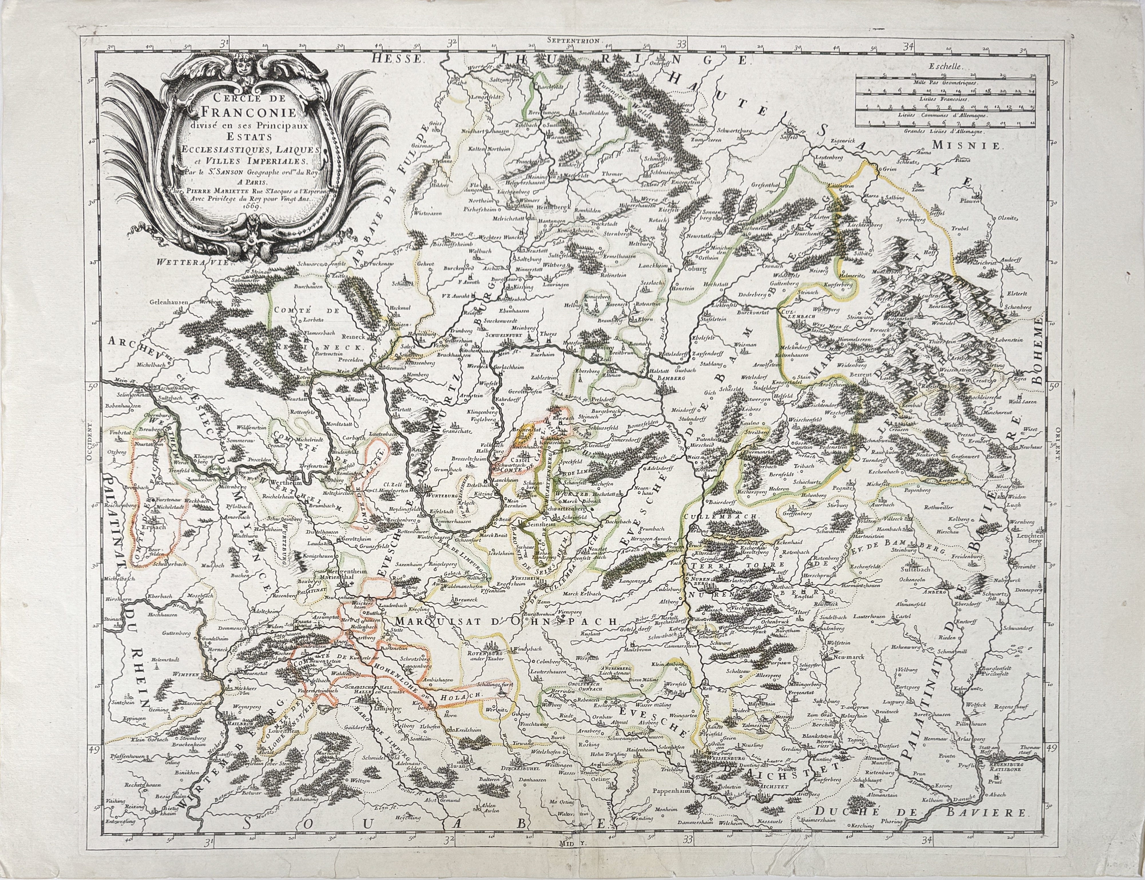 Kaart van het "Cercle de Franconie", circa 1740, toegeschreven aan Jean-Baptiste Nolin II (1686–1762). Kopergravure op handgeschept papier met met de hand ingekleurde grenzen. De kaart toont het Frankenland binnen het Heilige Roomse Rijk, met politieke en geografische details, steden en reliëf. Linksboven een sierlijk cartouche in barokstijl met titel en opdracht. Kom langs tijdens de kijkdagen (29 t/m 31 augustus) en ontdek deze kopergravure zelf! |