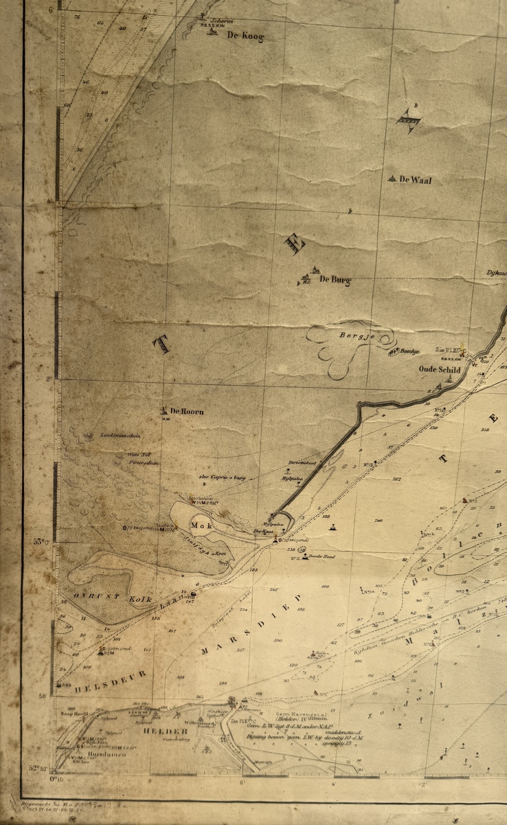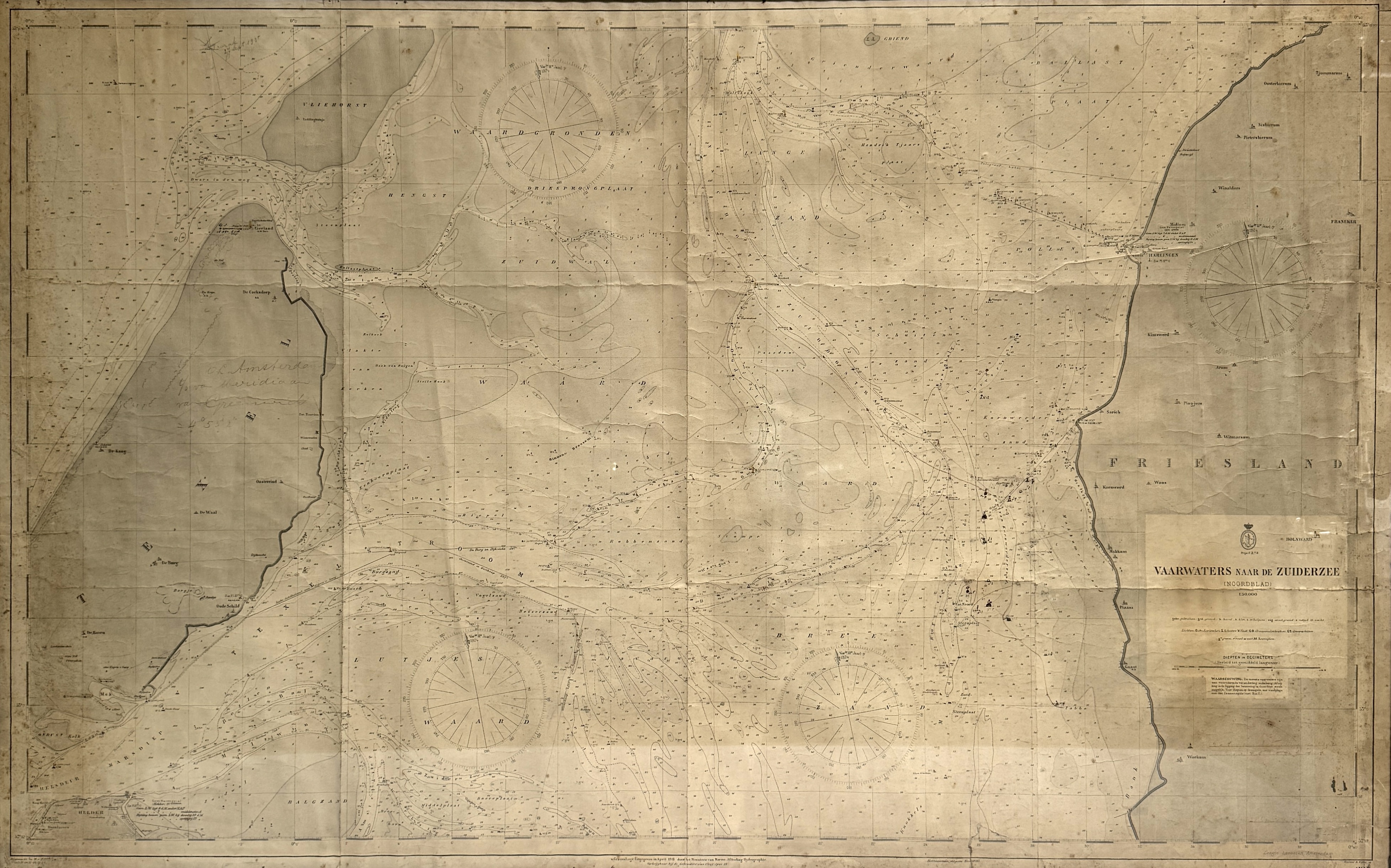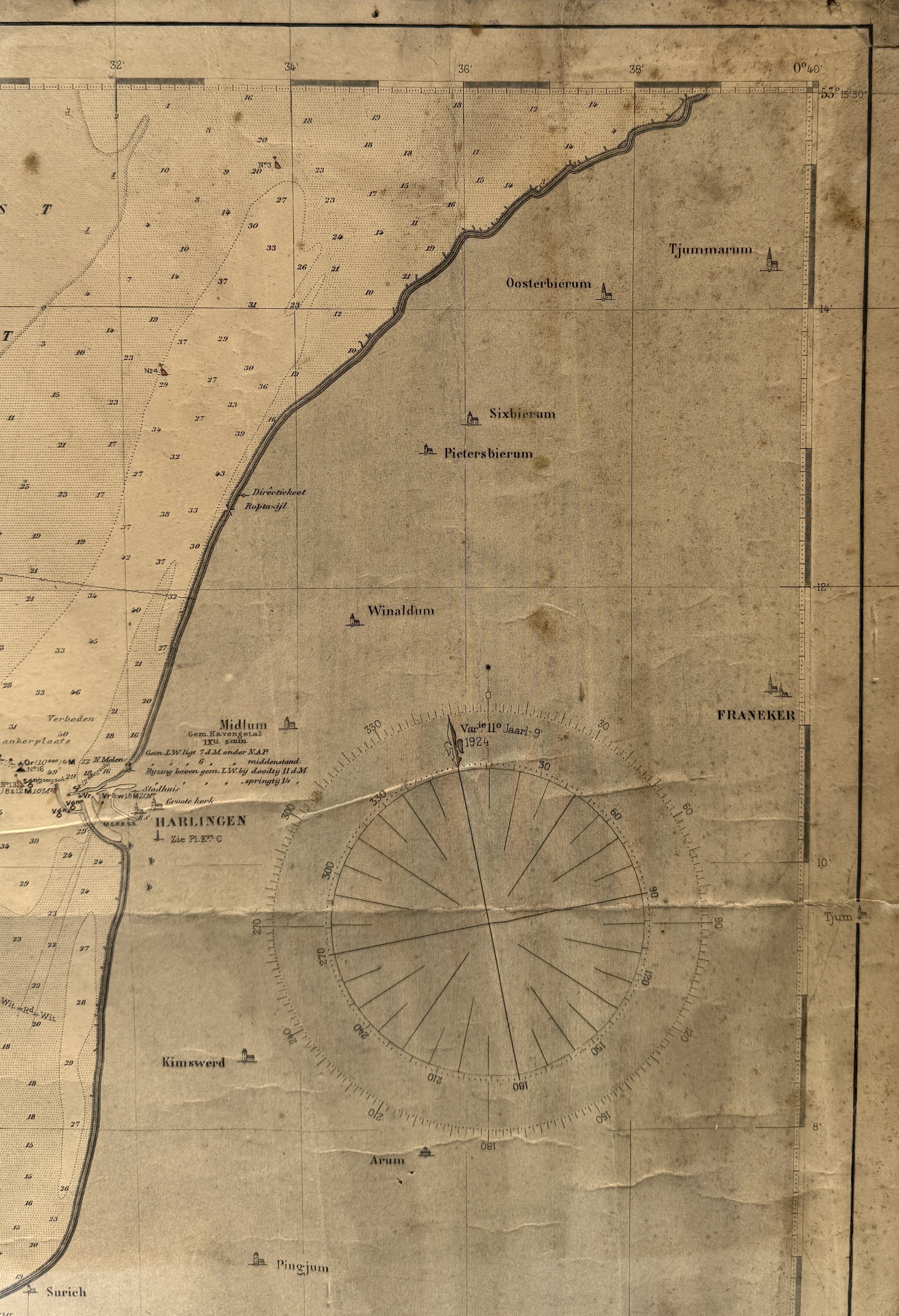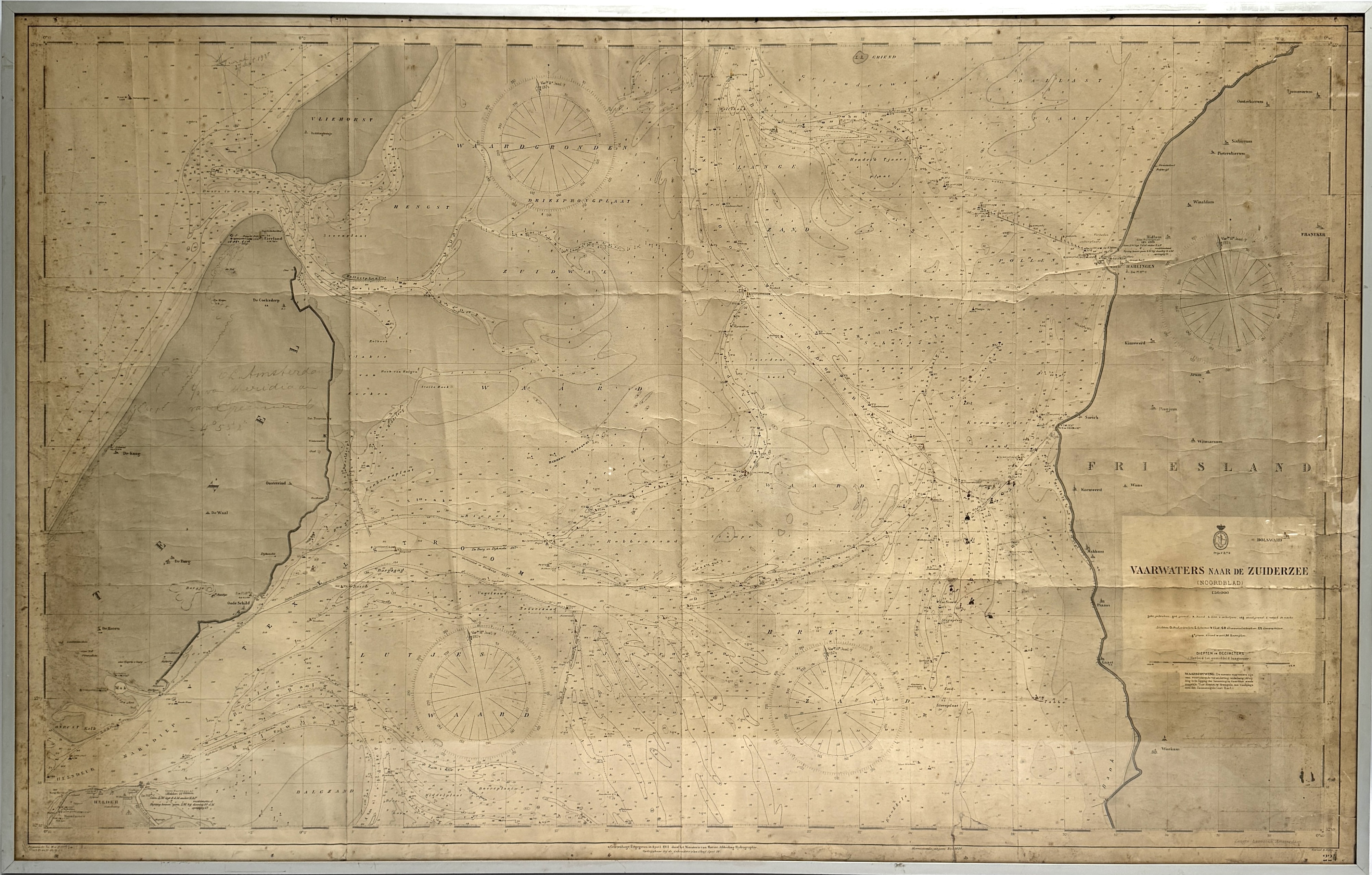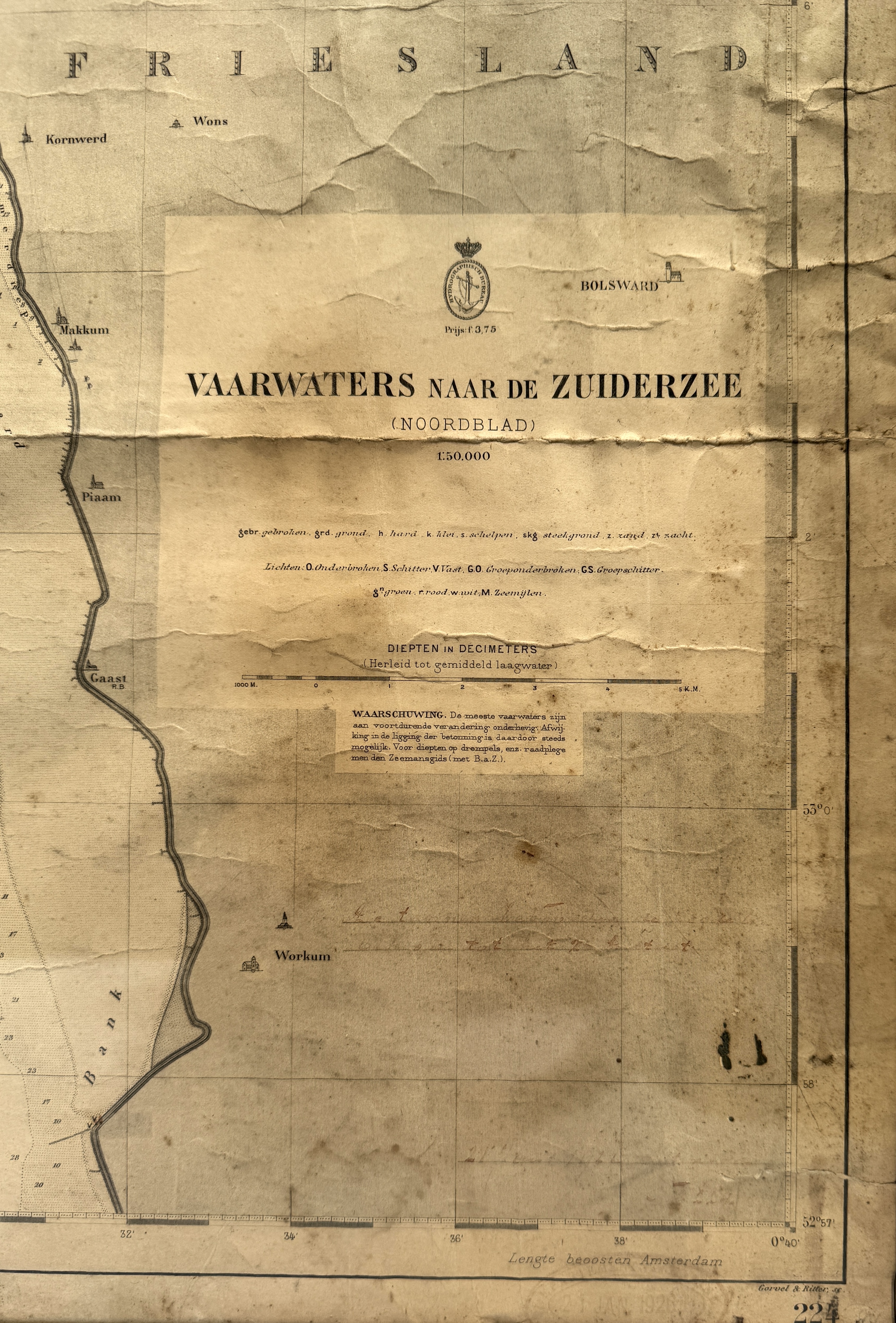Zeekaart “Vaarwaters naar de Zuiderzee (Noordblad)”. Uitgegeven in 1911 door het Ministerie van Marine Afdeeling Hydrographie. De kaart toont vaarwaters naar de Zuiderzee (noordblad) met gedetailleerde aanduiding van kustlijnen, dieptelijnen, bakens en havens in Friesland en omgeving. Voorzien van kompasroos en schaalverdeling. Deze kaart diende voor navigatie en maritieme oriëntatie in het begin van de 20e eeuw. Kom langs tijdens de kijkdagen (29 t/m 31 augustus) en ontdek dit object zelf! |