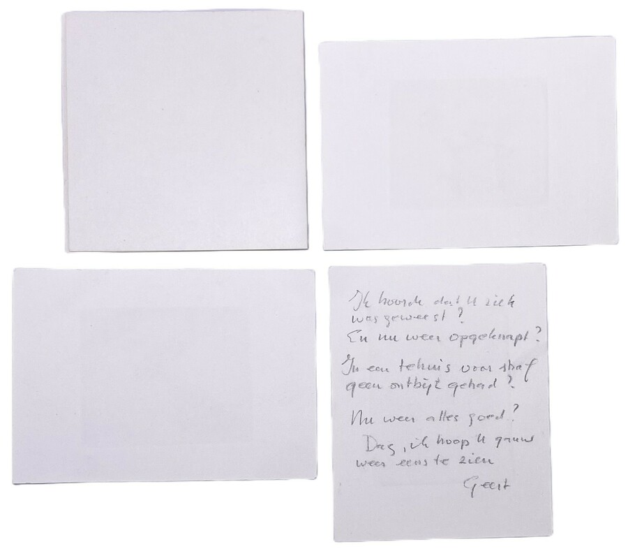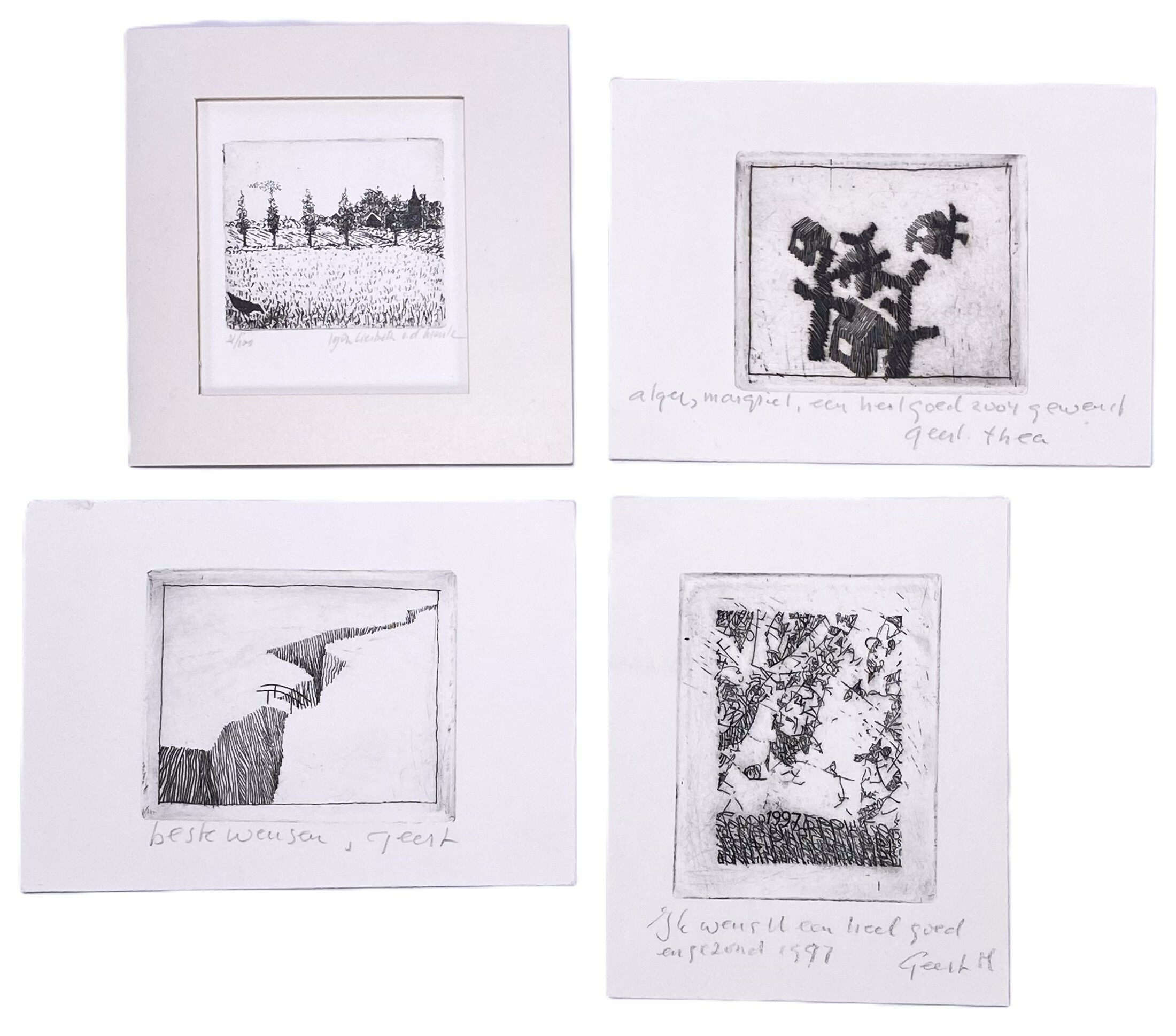 Een serie van vier etsen op papier, gesigneerd door Geert en gedateerd tussen circa 1970 en 1997. De werken tonen diverse onderwerpen zoals een landschap, een florale compositie, en een kloof met een brug. De oplagenummers variëren, waaronder 3/10 en 16/100. Eerst deze etsen zien voordat je biedt? Bezoek onze kijkdagen op 29, 30 en 31 augustus van 11:00 tot 17:00 uur! |