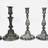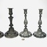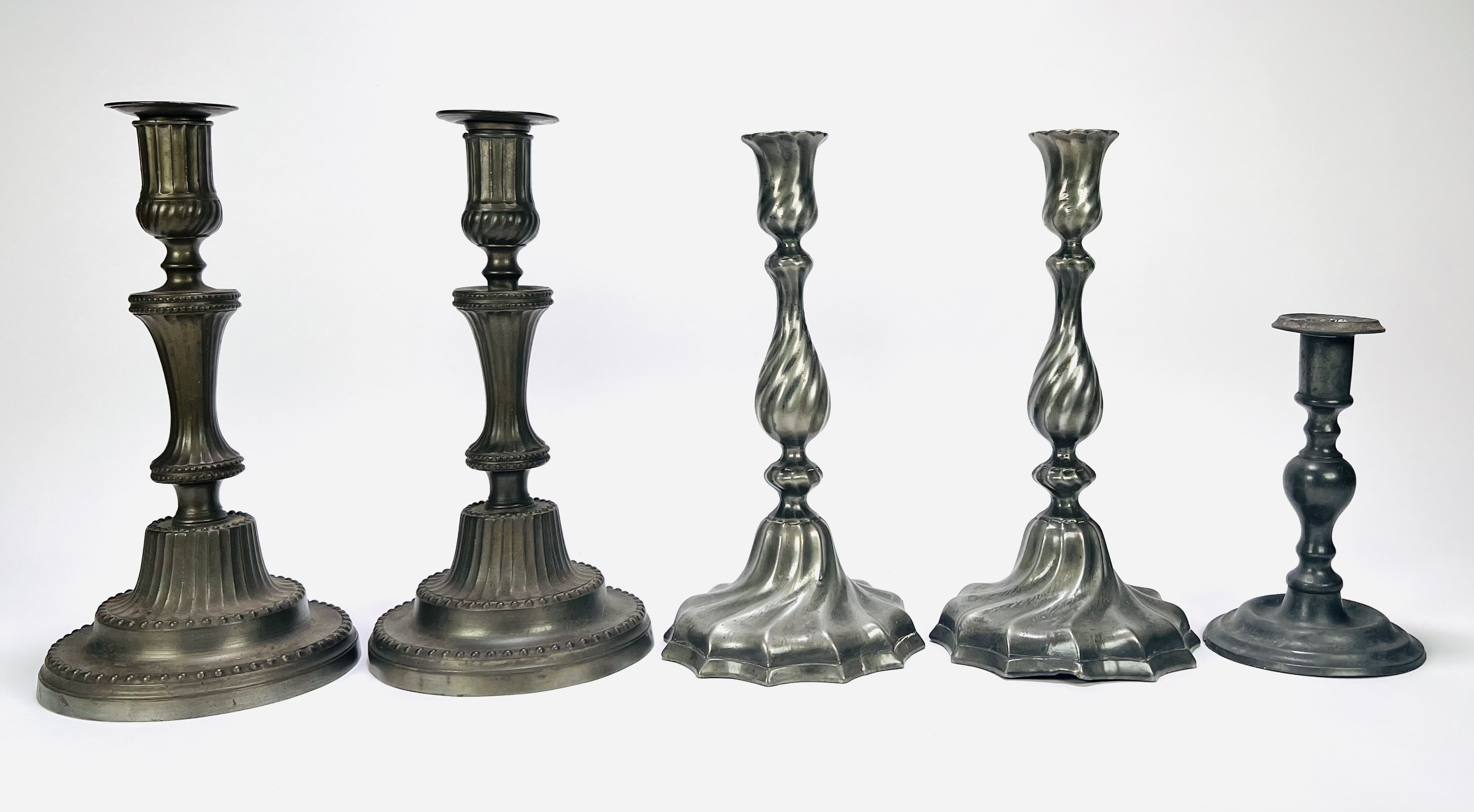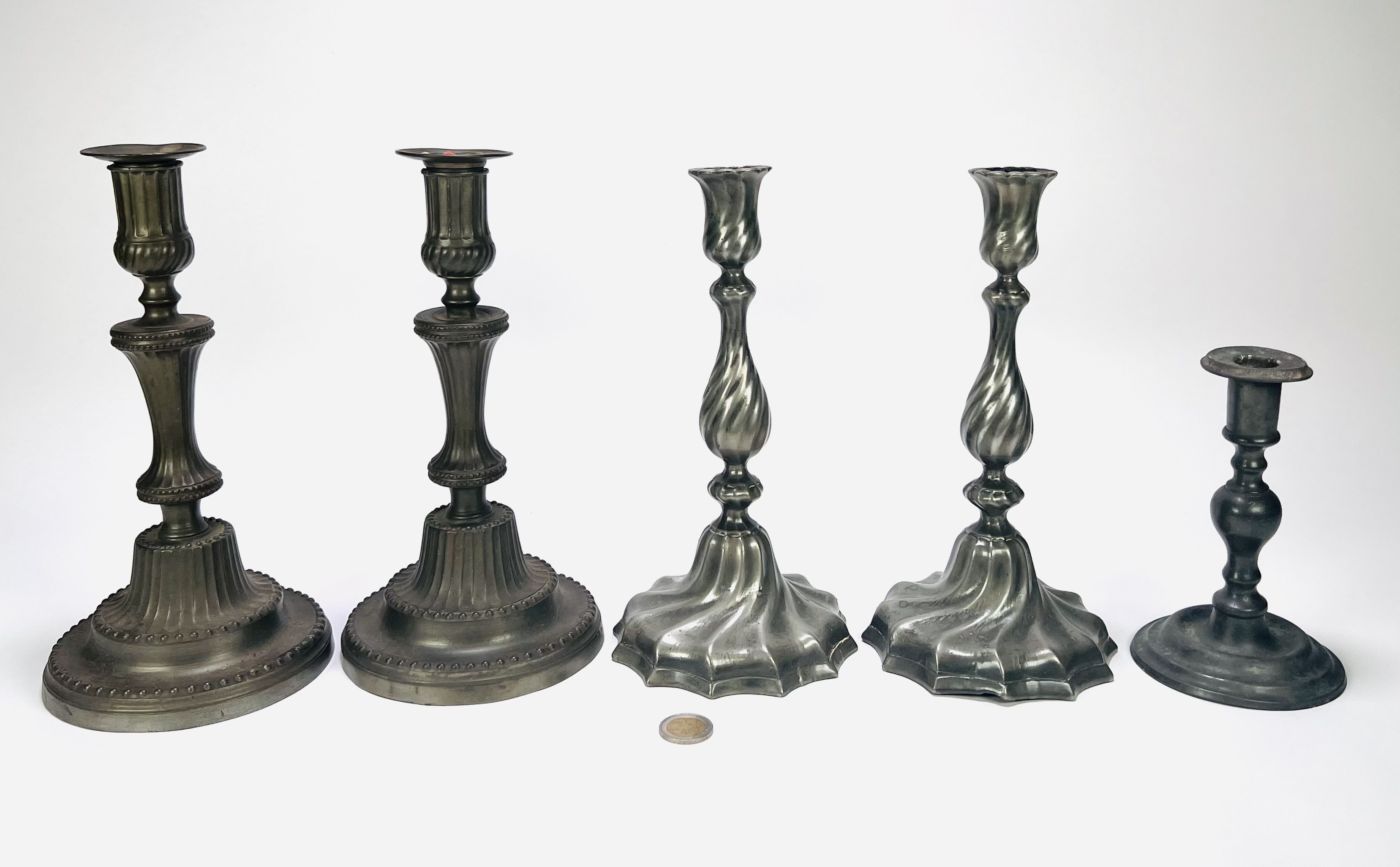Vijf kandelaren in twee paren en één enkel exemplaar, uitgevoerd in gegoten tin, eind 19e eeuw tot begin 20e eeuw. Twee neoclassicistische exemplaren met ovalen voet en verticale cannelures, twee met een tors gevormde balusterstam en gelobde voet en één eenvoudig balustermodel. Klaar om te bieden? Registreer je nu en doe mee aan de veiling! |