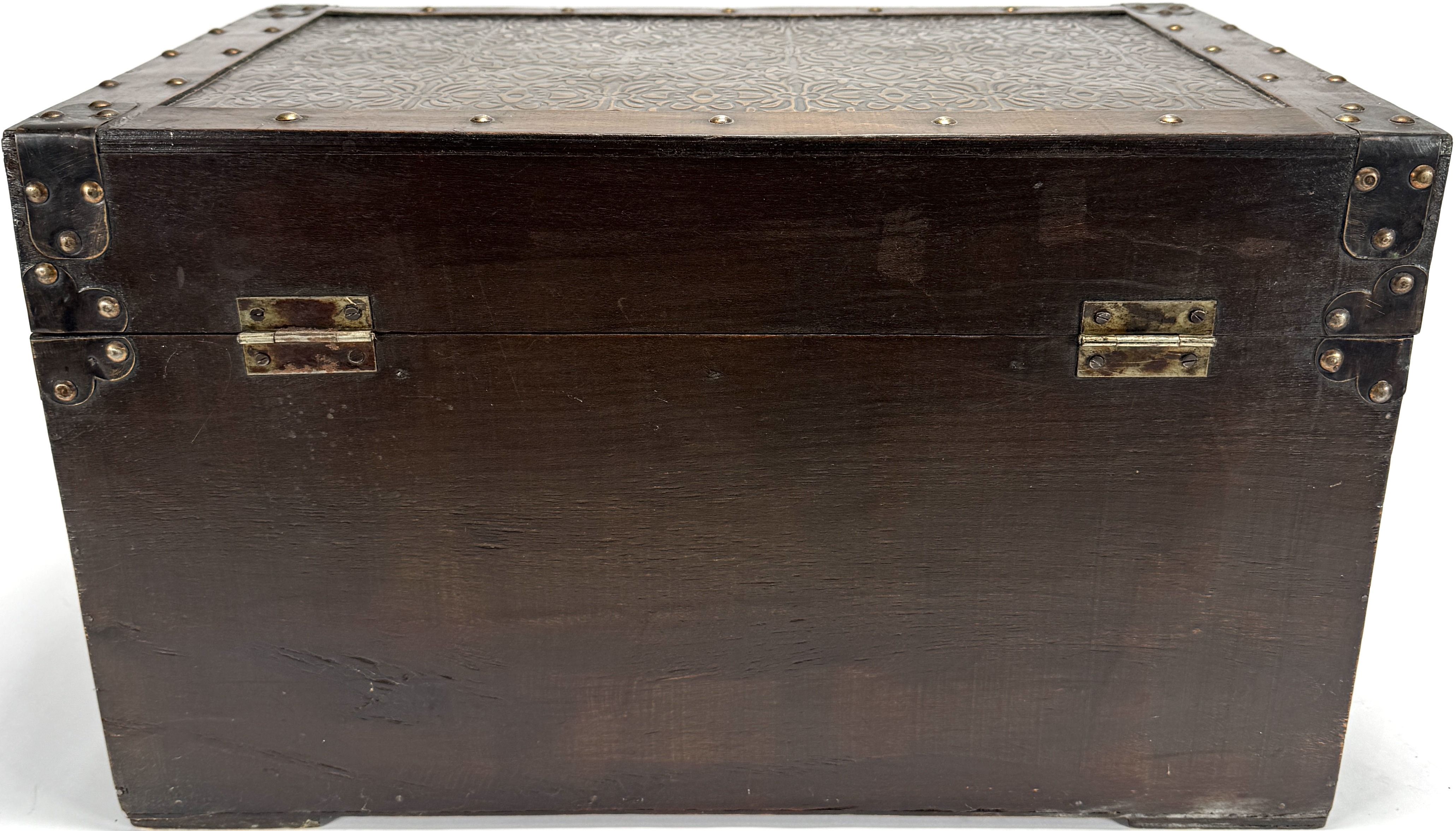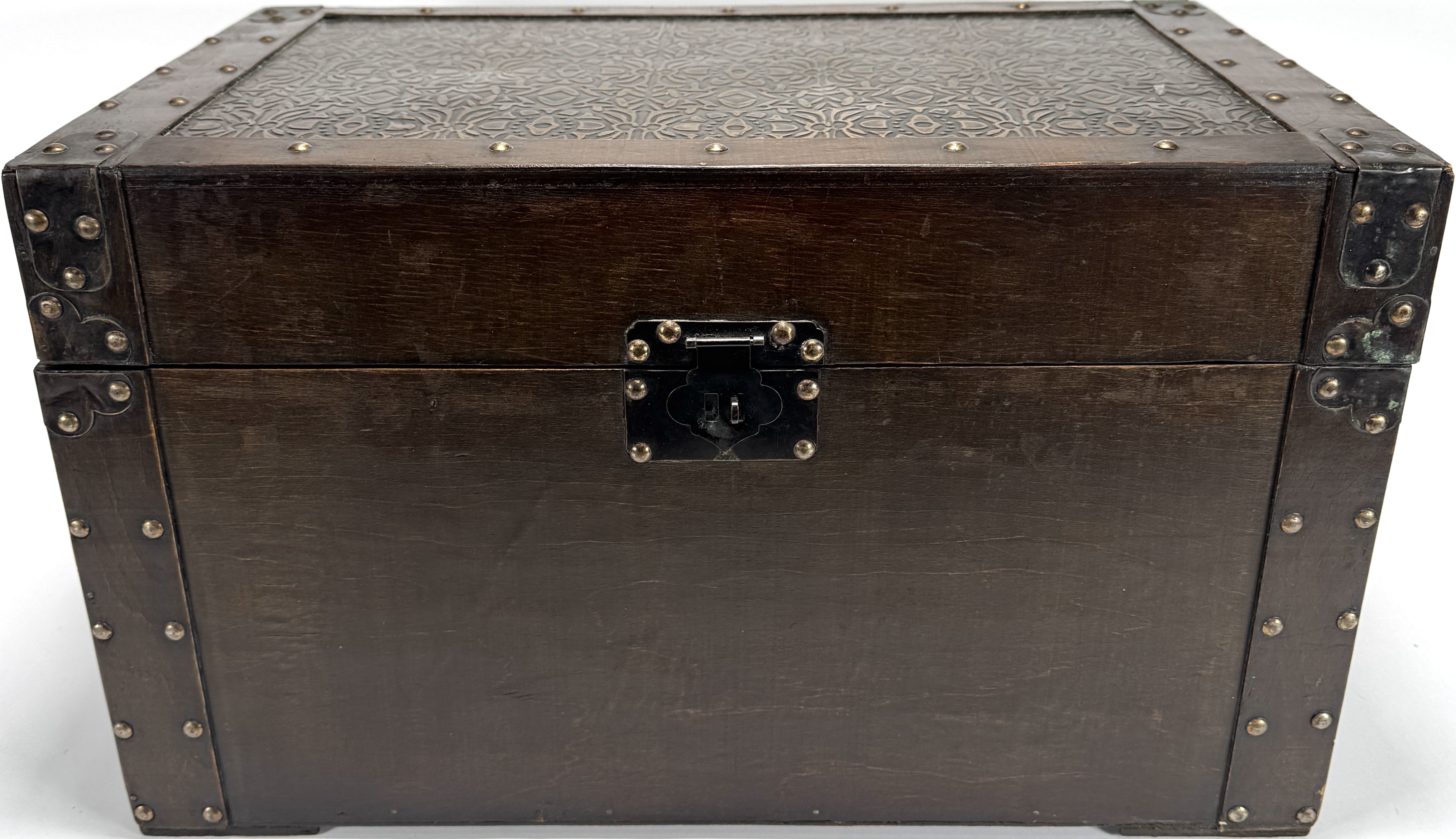 Houten kist met metalen beslag en paneel, eind 19e eeuw