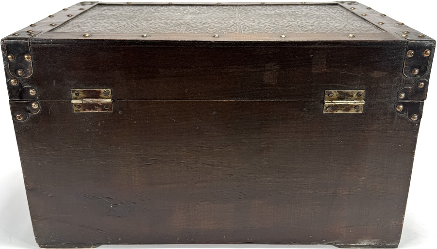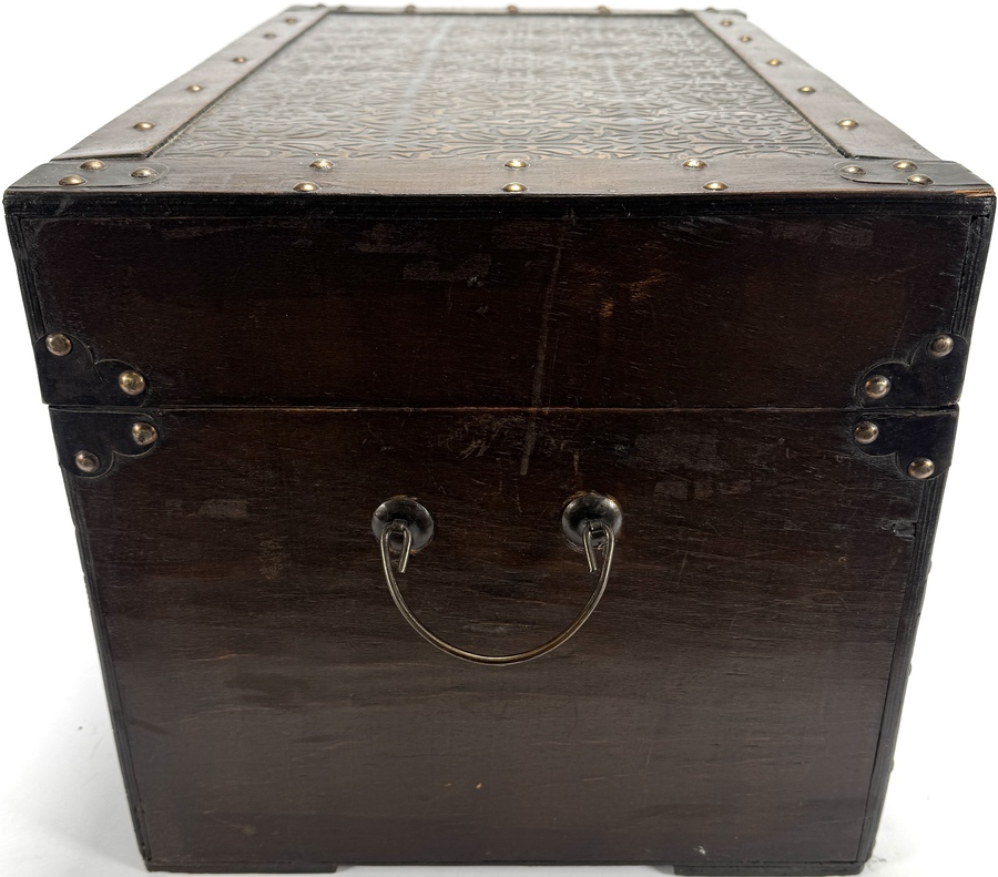 Donkerhouten kist met messingbeslag, eind 19e eeuw. Ambachtelijk vervaardigd, voorzien van decoratief geperst metalen paneel met floraal patroon op de bovenkant. Met metalen hoekbeschermers, klinknagels en draagringen aan de zijkanten. Interesse in deze houten kist? Registreer en bied eenvoudig online mee! |