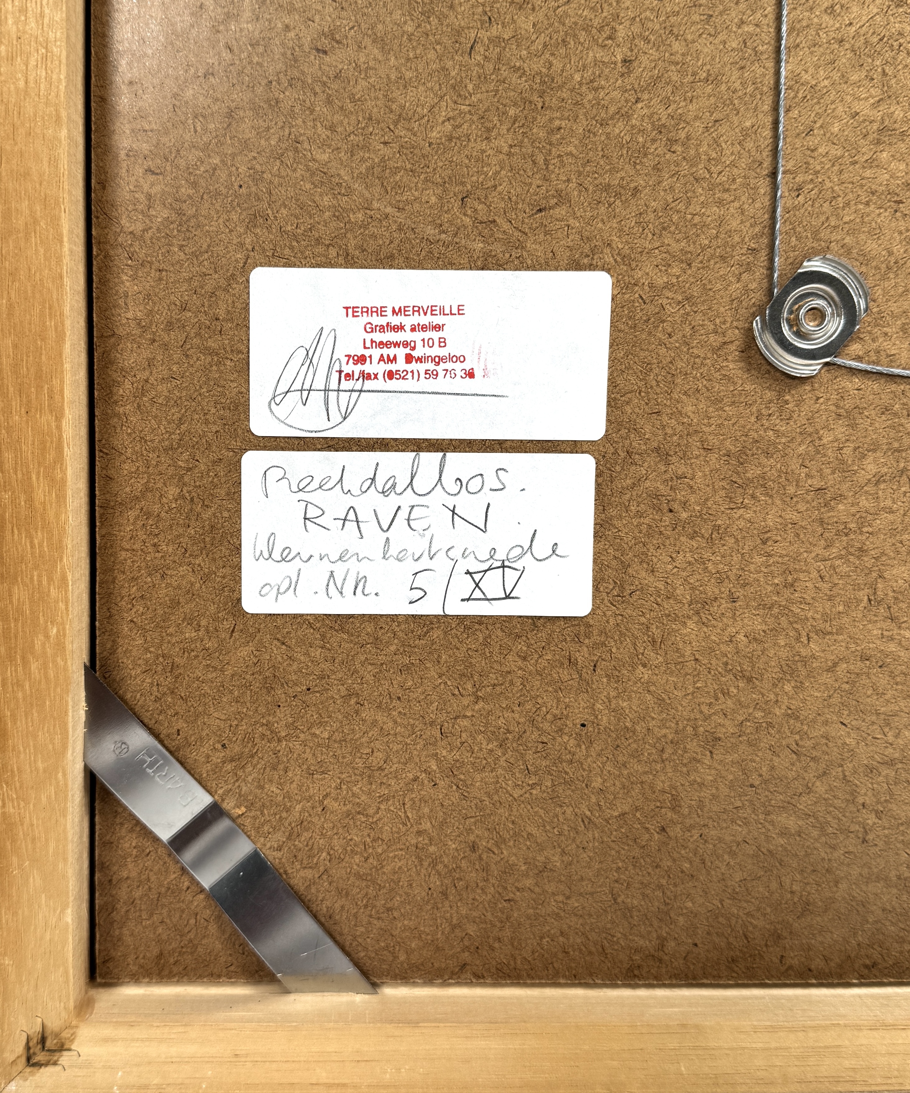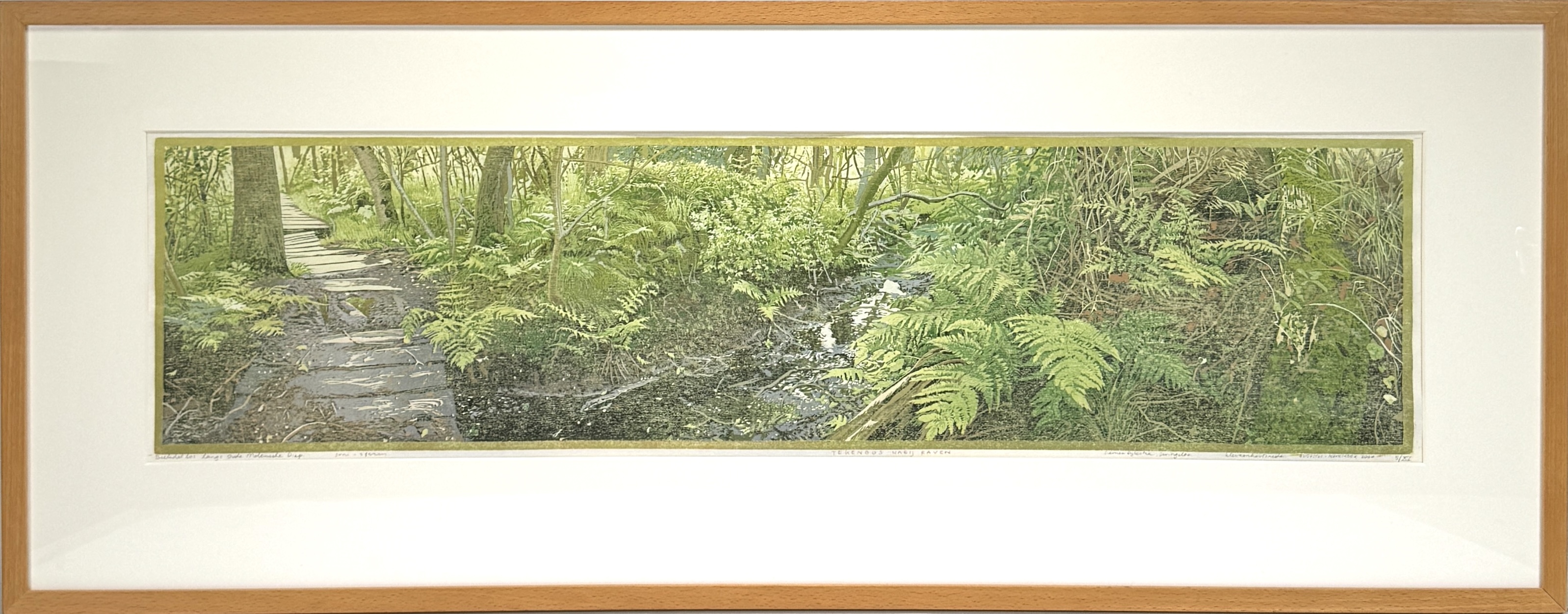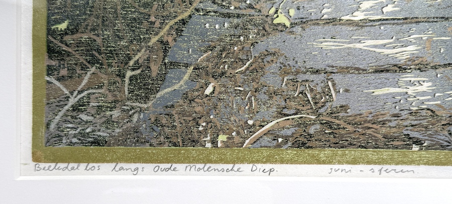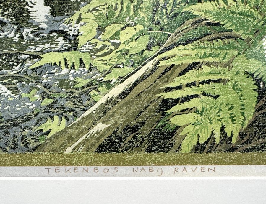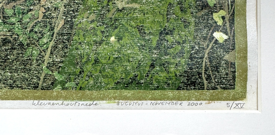 Kleurenhoutsnede van Siemen Dijkstra (1968), getiteld “Beekdalbos langs Oude Molensche Diep – juni – sferen” en “Tekenbos nabij Raven”, uitgevoerd op papier in polychrome druktechniek. Voorstelling van boslandschap met varens, vlonderpad en beek. Met potlood gesigneerd rechtsonder, oplagenummer 5/XV rechtsonder, 2000. Achterzijde met atelierlabel Terre Merveille, Dwingeloo. Geïnteresseerd? Bezoek onze kijkdagen op 29, 30 of 31 augustus van 11:00 tot 17:00 uur! |