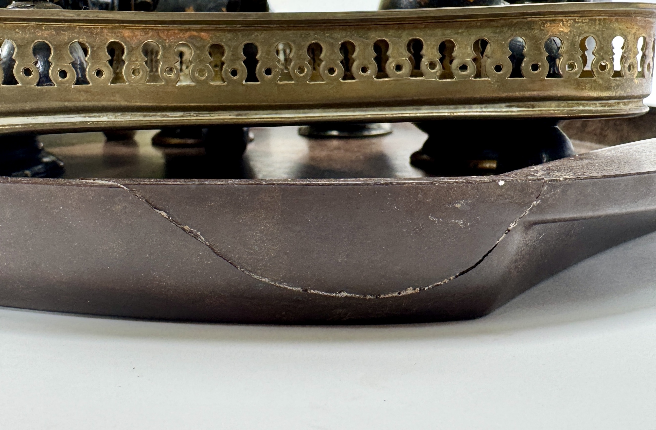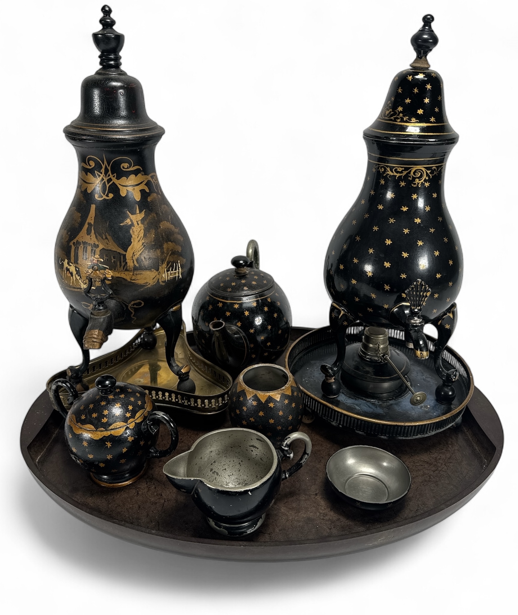 Empirestijl koffie- en theeservies, 19e eeuw, uitgevoerd in tin en gelakt met vergulde decoraties. De set omvat kraantjeskannen, theepot, suikerpot, melkkan en accessoires, allen versierd met stermotieven en landschappen. Wilt u meedoen? Registreer en bied live of online! |