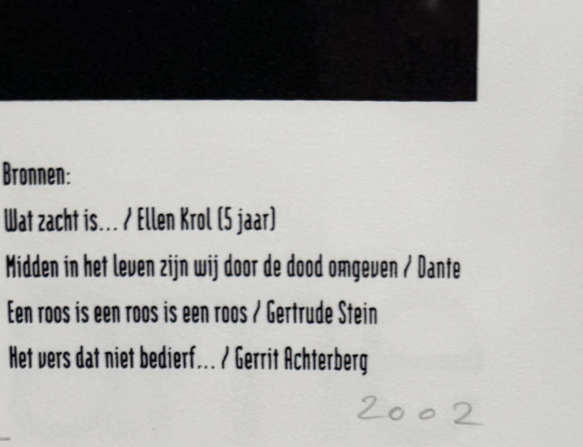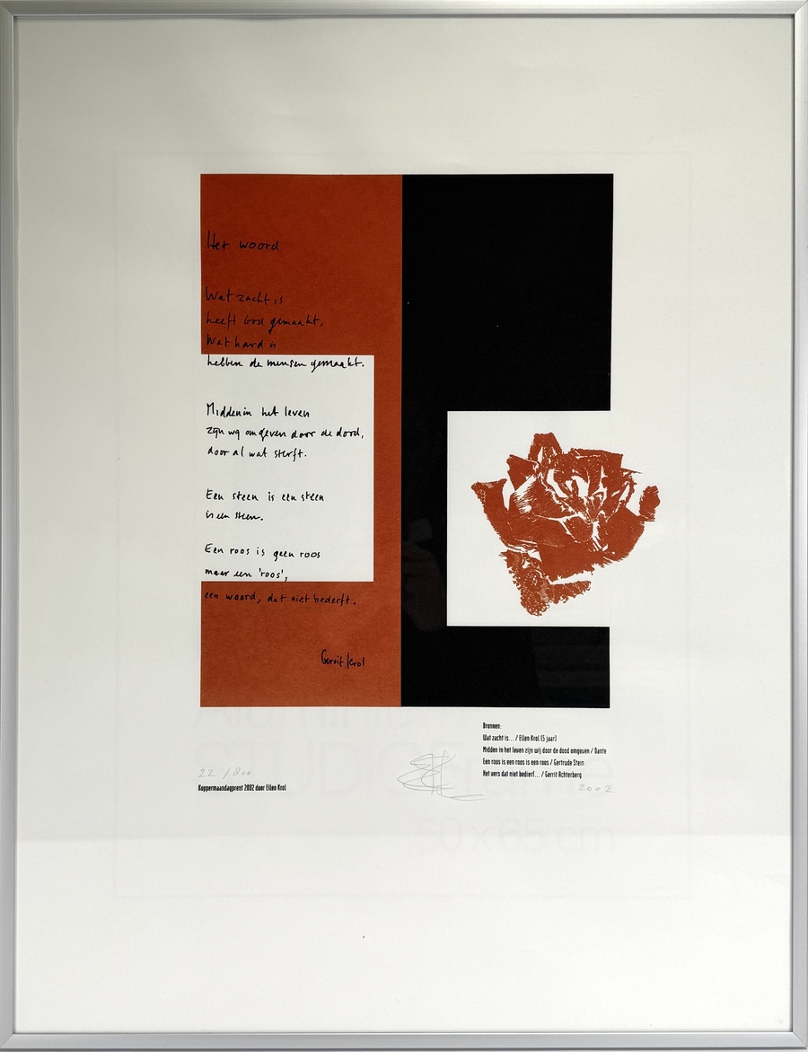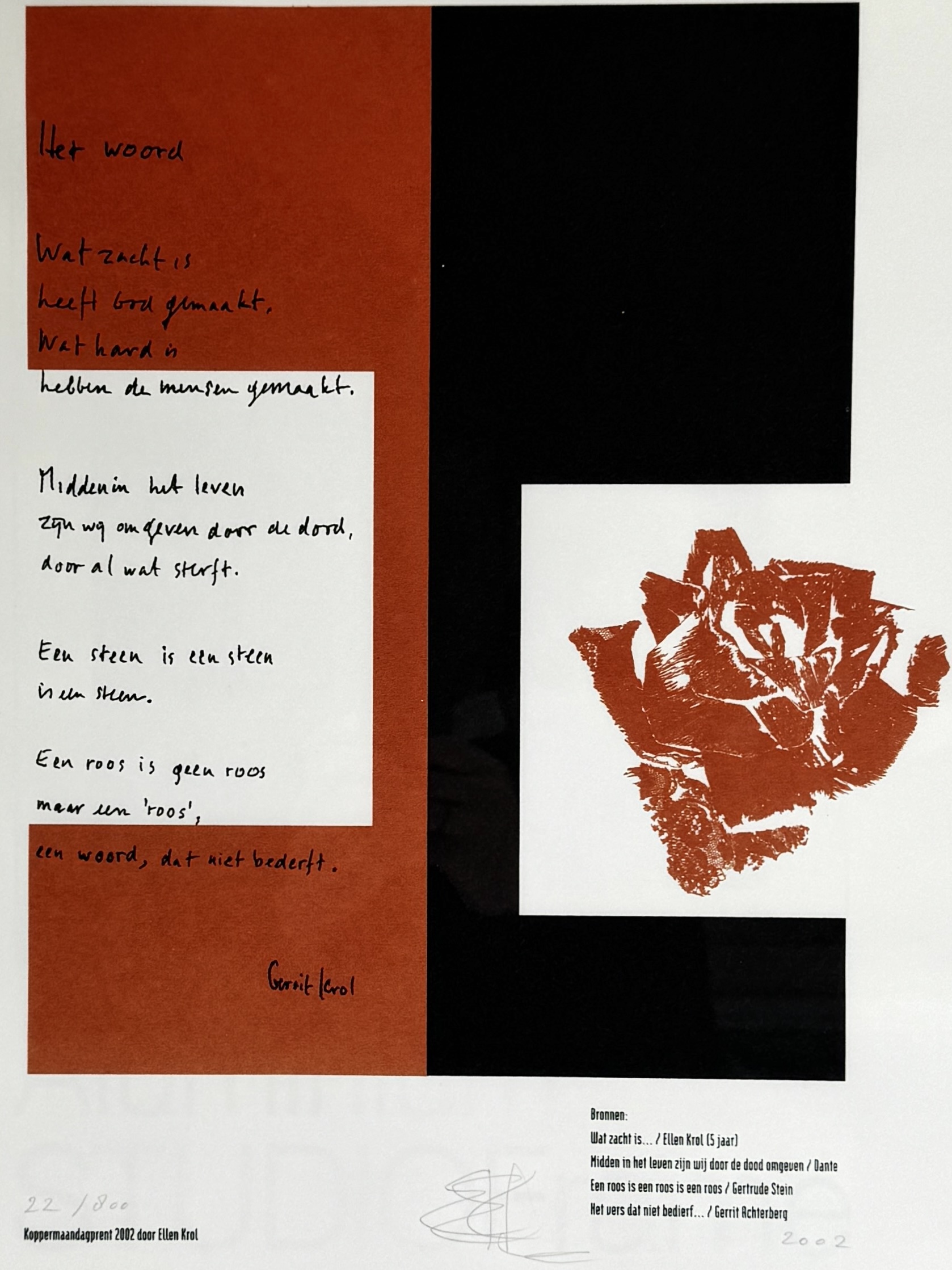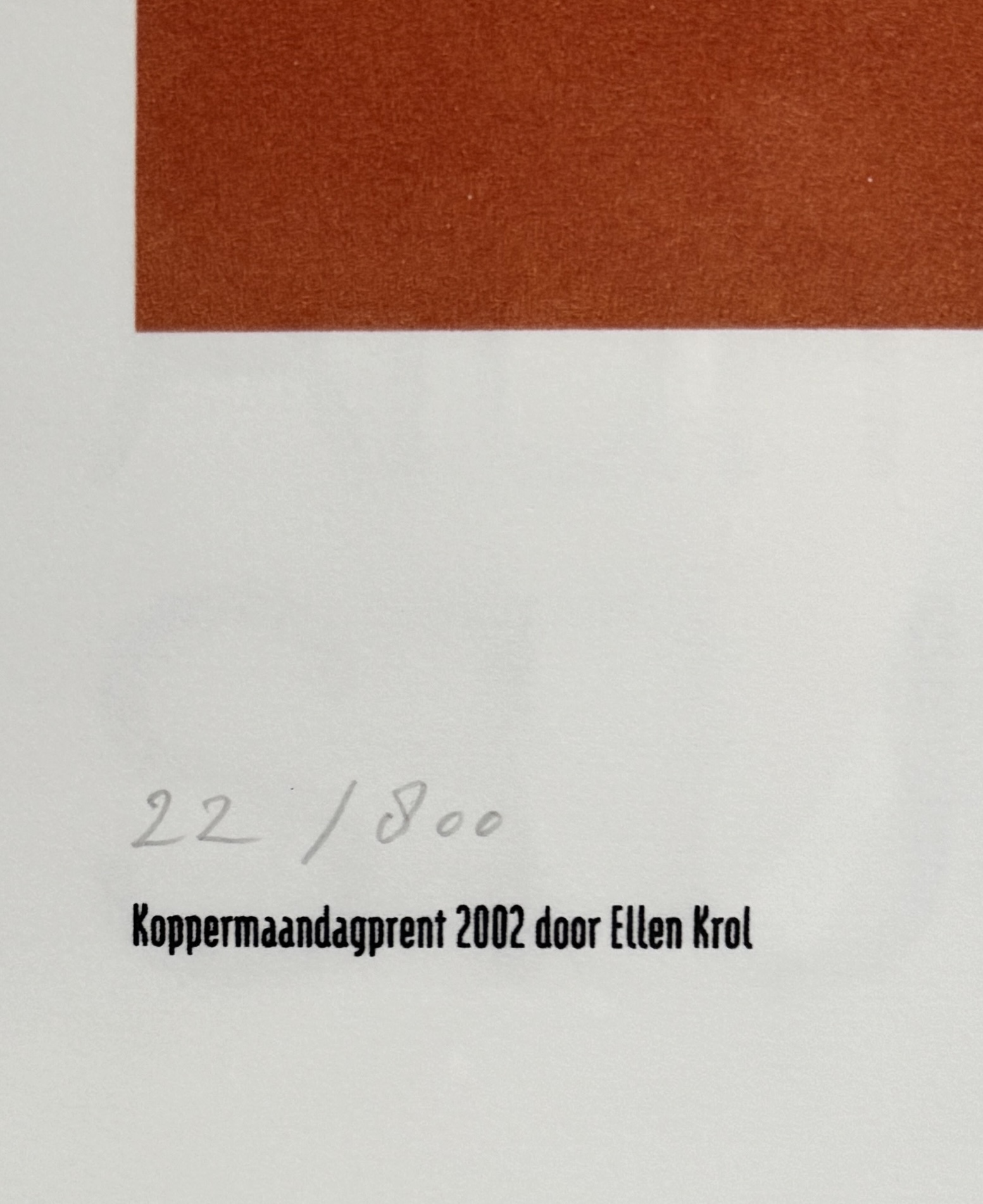 Koppermaandagprent 2002 door Ellen Krol, met een gedicht van Gerrit krol. Met potlood onderaan gesigneerd, gedateerd 2002 en oplagenummer 22/800. Kom kijken op 29, 30 of 31 augustus (11:00-17:00 uur) en ervaar het zelf! |