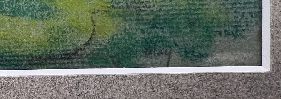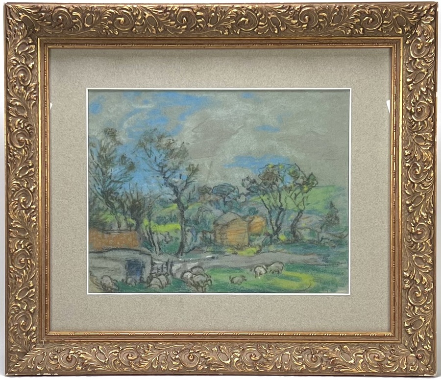 Landschapsvoorstelling, midden 20e eeuw, pastel techniek op papier, met landelijke scène van bomen, boerderijen en schapen. Het werk is impressionistisch van stijl en uitgevoerd met vloeiende lijnen en zachte kleuren. Onderaan onduidelijk gesigneerd, geplaatst in geornamenteerde lijst met passe-partout. Schrijf u vandaag nog in voor de veiling en verzeker uw deelname! |